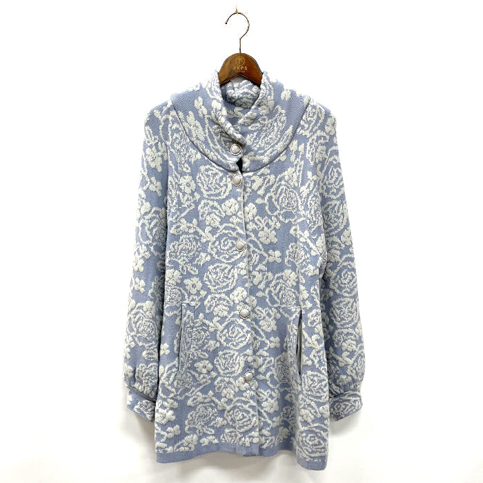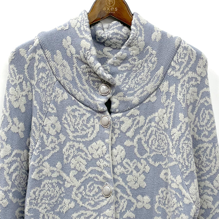 お花のジャカード編ニットが目を引くニットカーデです。程よい厚みと丈感が肌寒い時期のコート代わりにもピッタリ!フェミニンなスタイリングのワンポイントにおススメです。