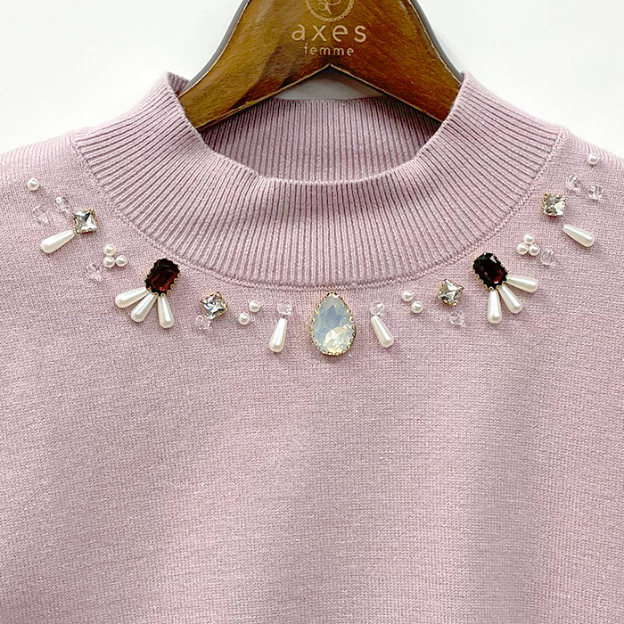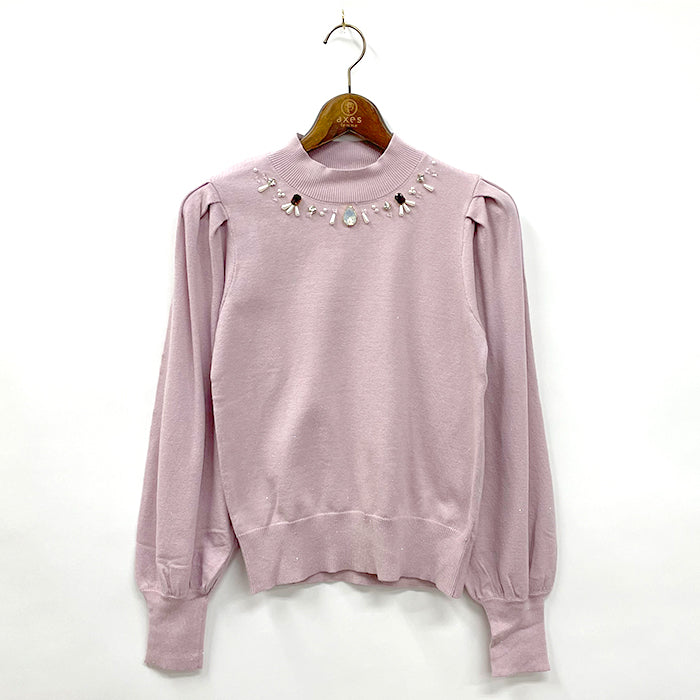 キラキラと反射するゴロゴロした大きめビジューが目を惹くニットプルオーバーです。