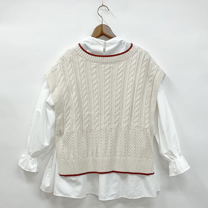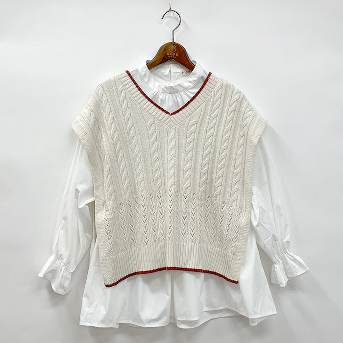 今年らしくニットベストの大きく開いたサイドのタブ仕様や、広めのVネックがトレンドライクなシルエットです。