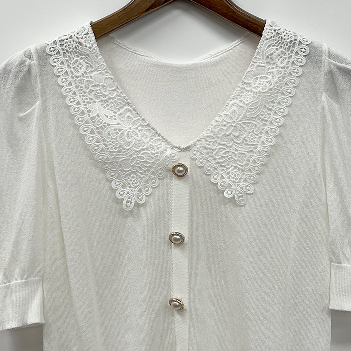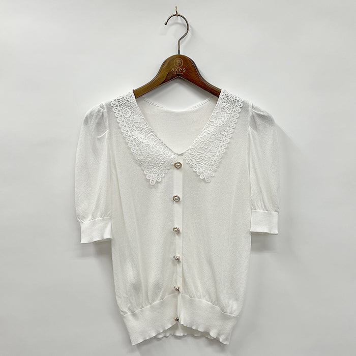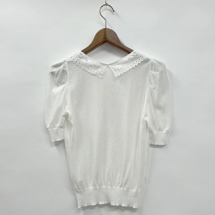 シンプルな色使いで使いやすいニットプルオーバーです。まるでカーディガンを着用しているような前身ごろの釦、上品な襟レースなどデザイン性が高いアイテム。