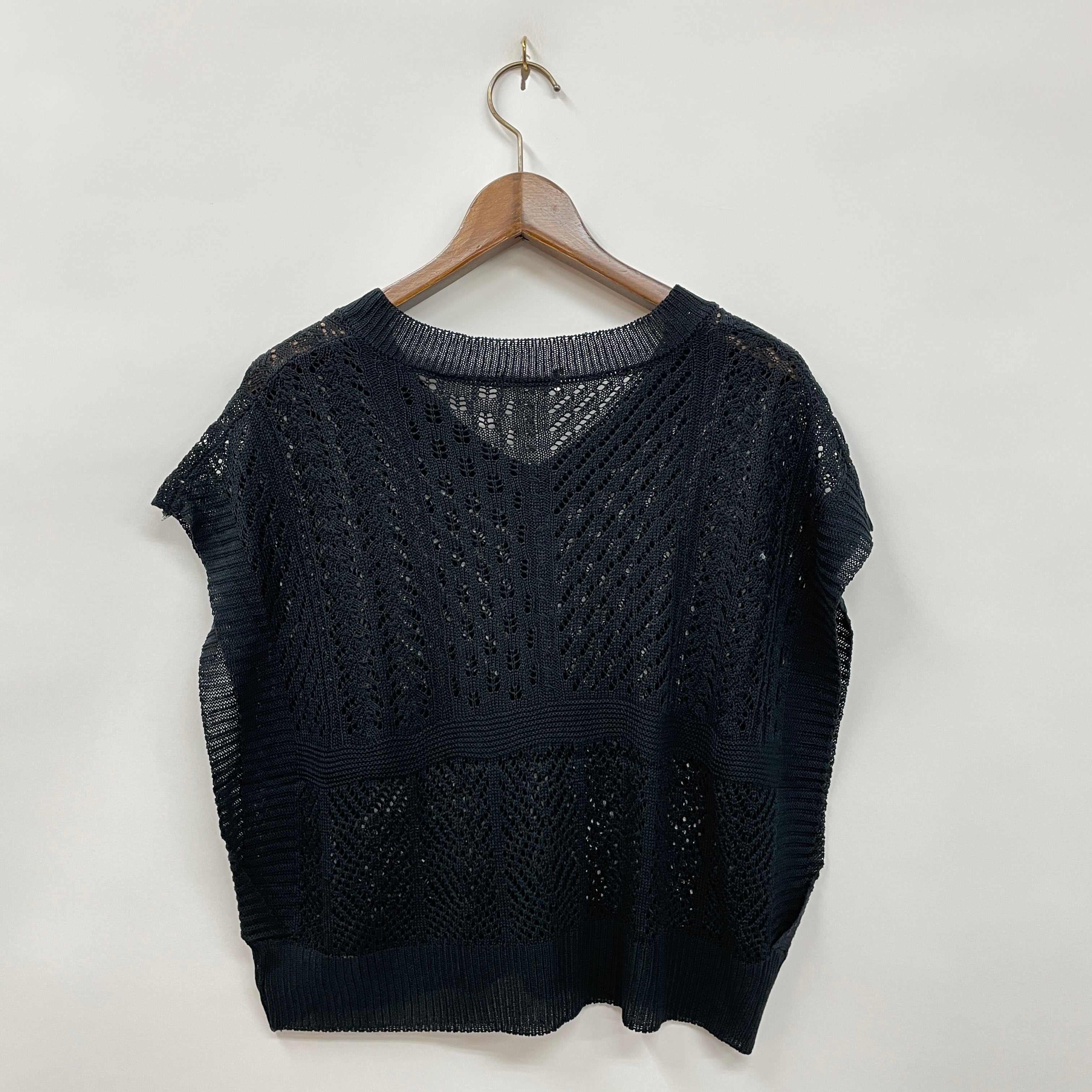 柄切替の透かし編みニットベストが爽やかな、ベスト×ロングシャツのアンサンブルです。