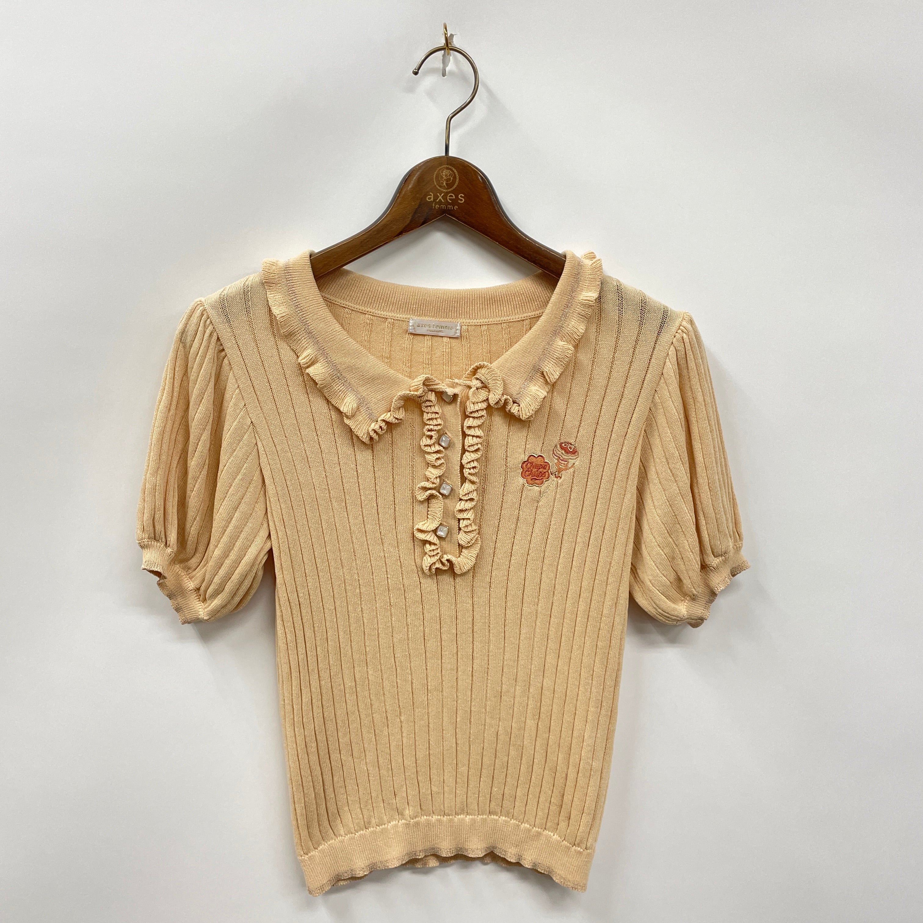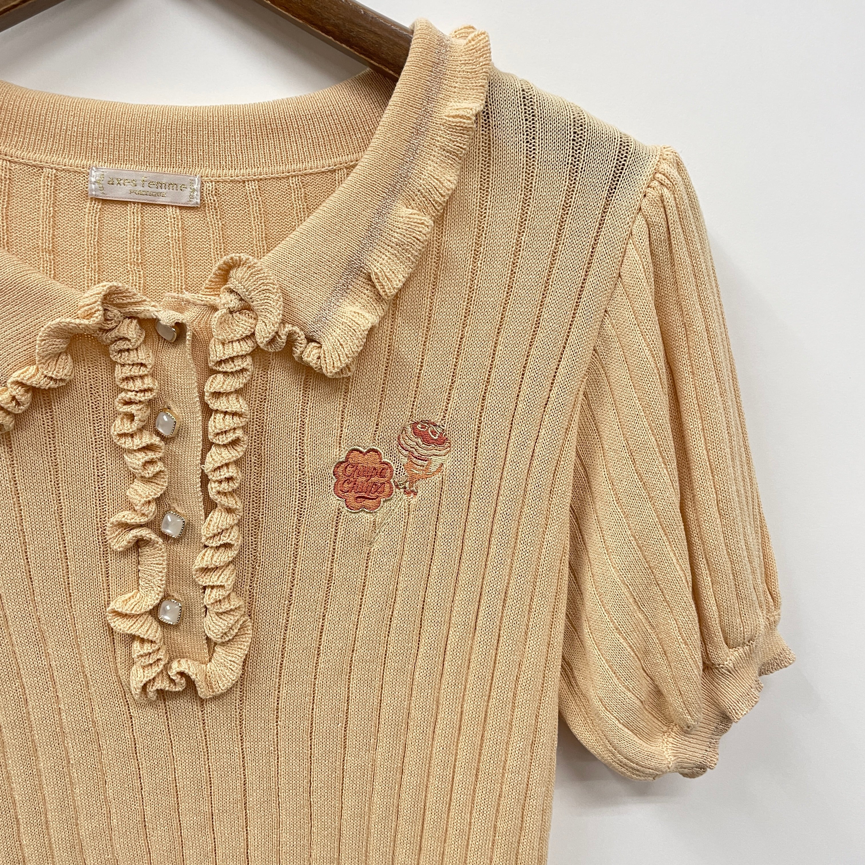 POETIQUE×チュッパチャプス のコラボアイテムが登場です! チュッパチャプスの刺繡を胸もとにあしらったニットポロです。シャリ感のある素材とラメのラインが爽やか♪ストロベリークリーム、ラムネ、プリンのフレーバーをイメージしたカラー3色展開でご用意しています。