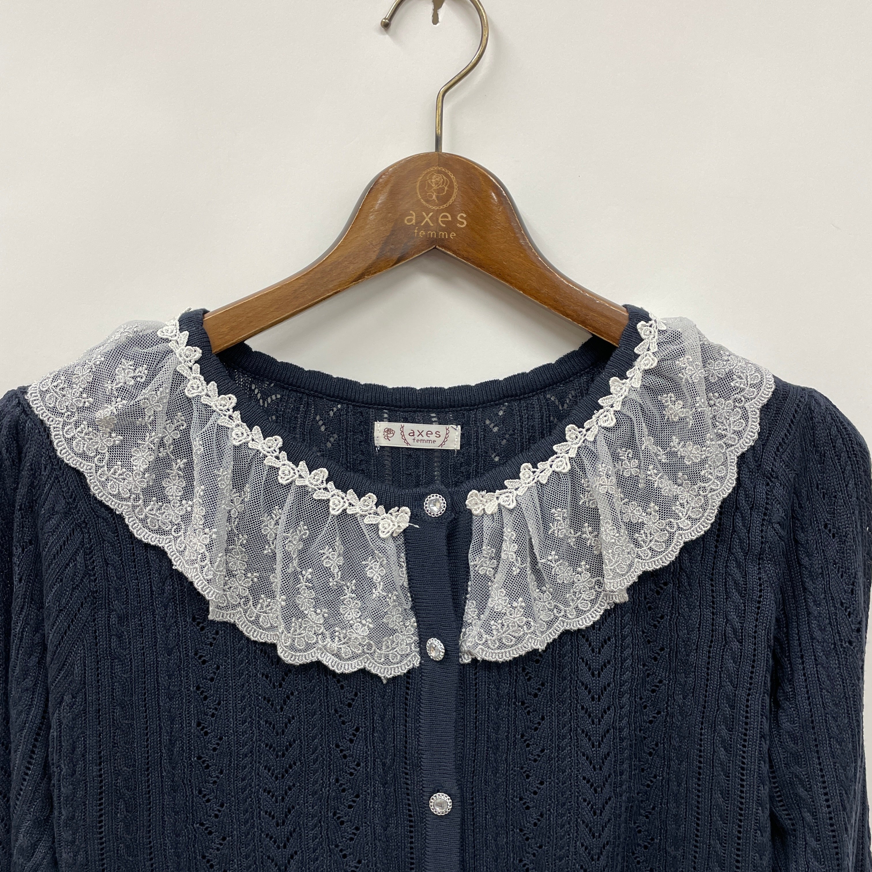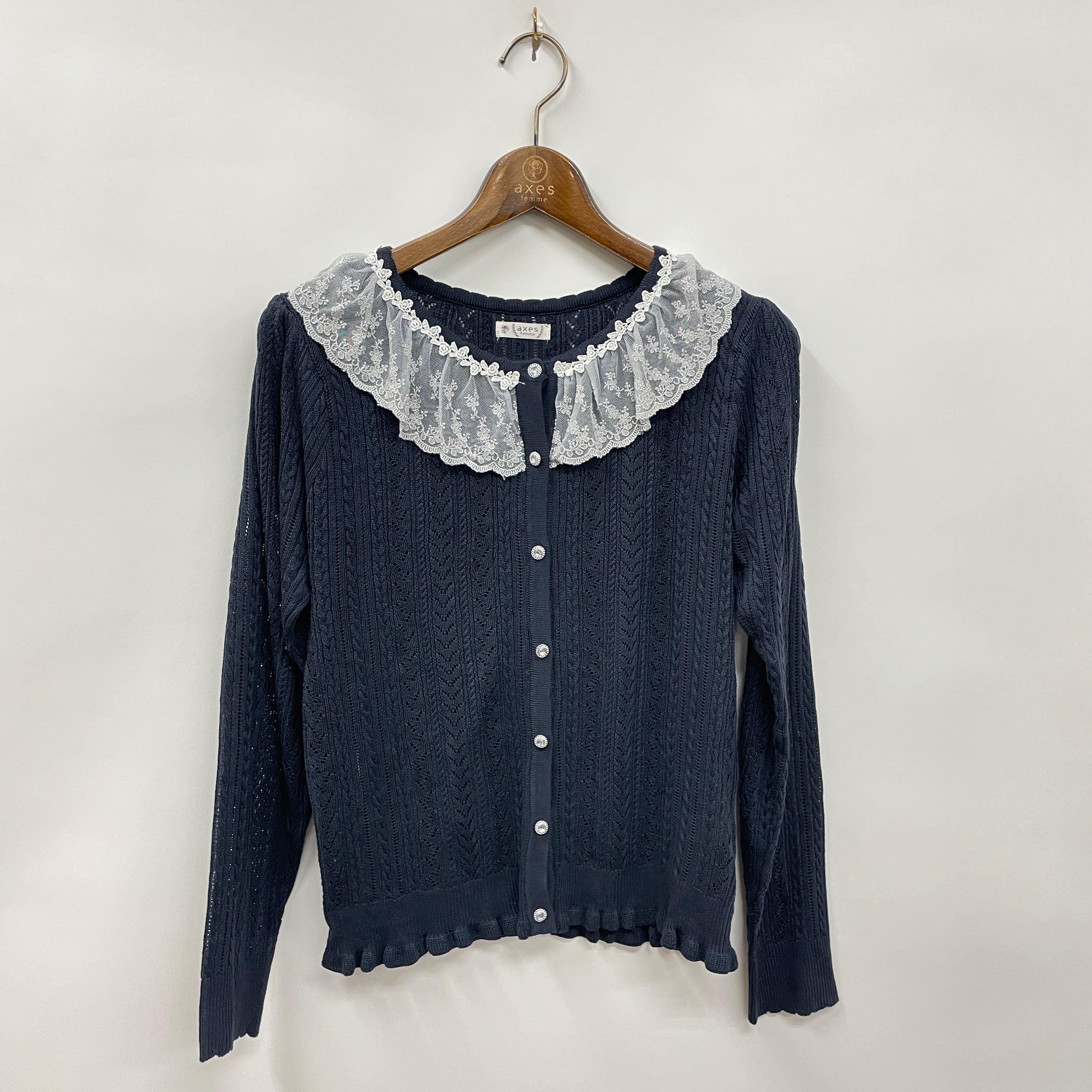 レーシーな襟がポイントのニットカーディガン。
