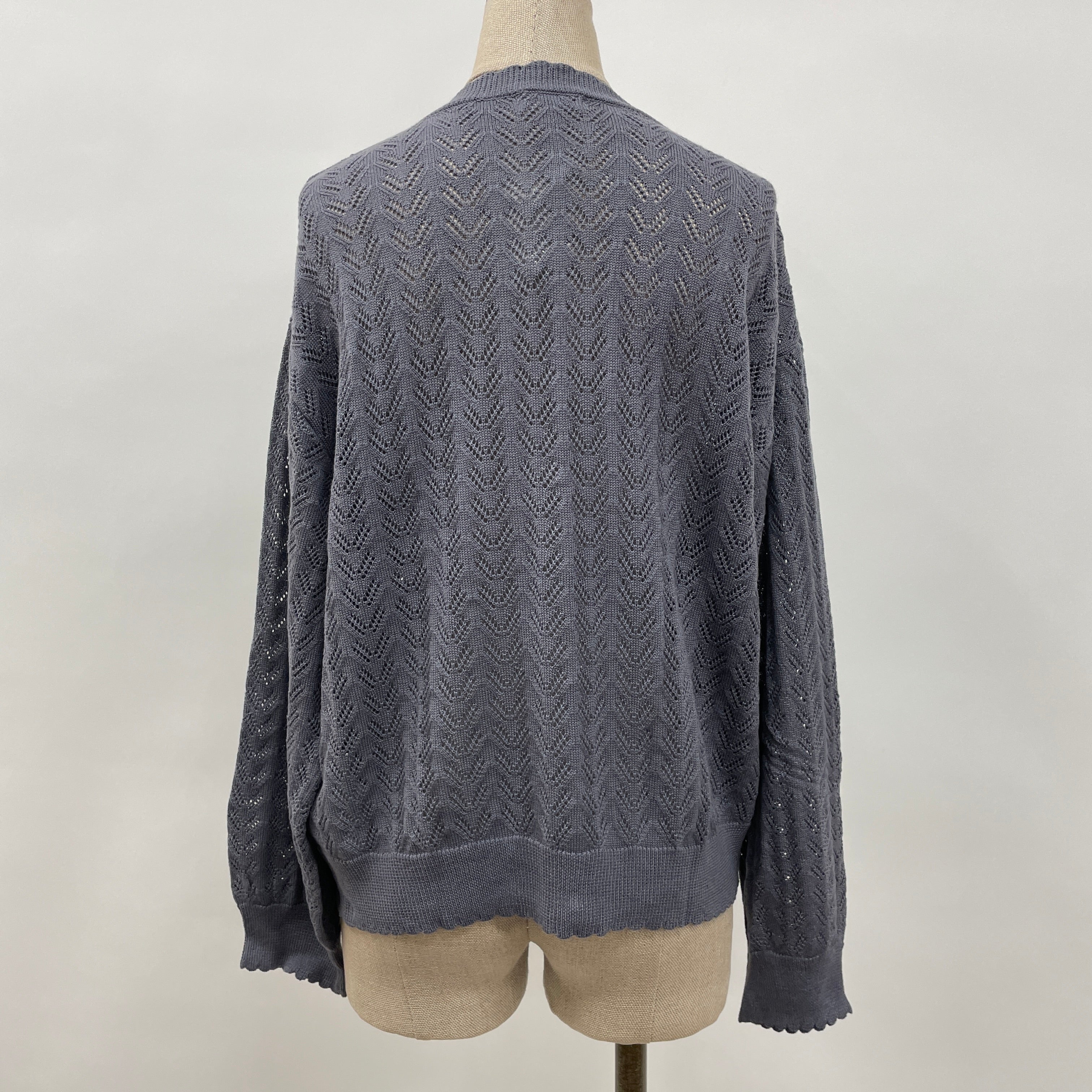重ね着をしてもインナーがごわつかないように袖巾にはゆとりを持たせ、重たい見た目にならないよう、身頃と袖に透かし編みを入れることで、優しげで軽やかな印象になるデザインにしました。