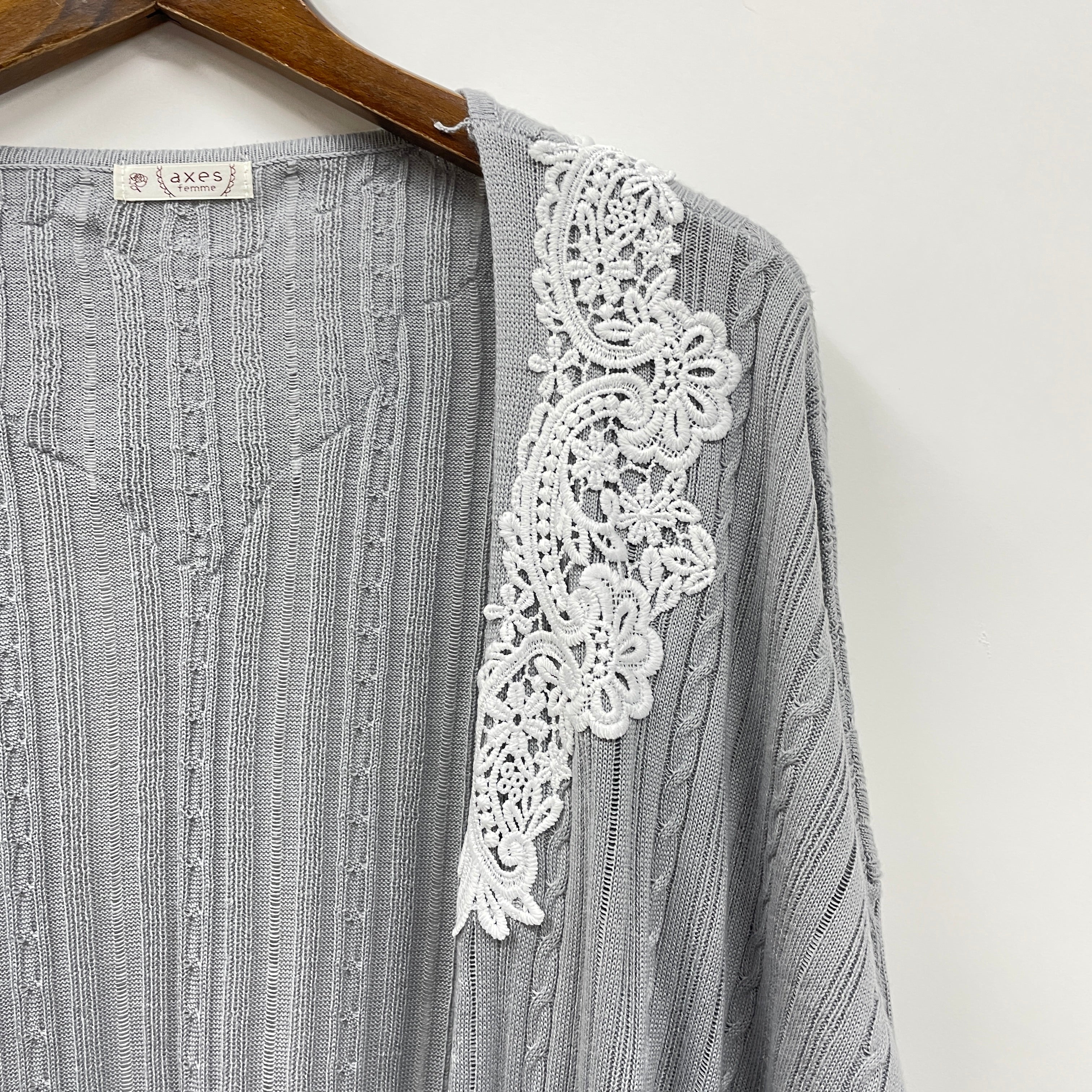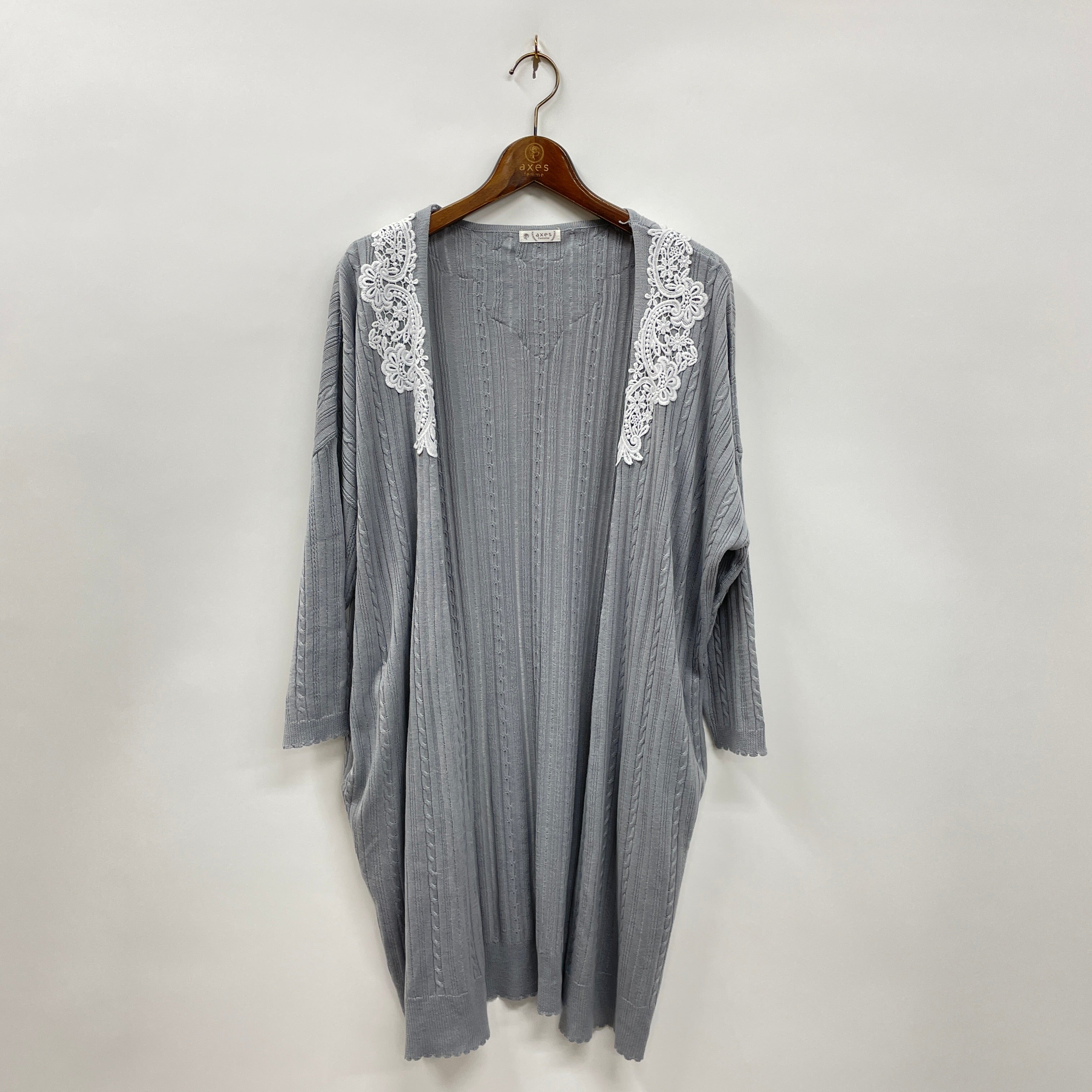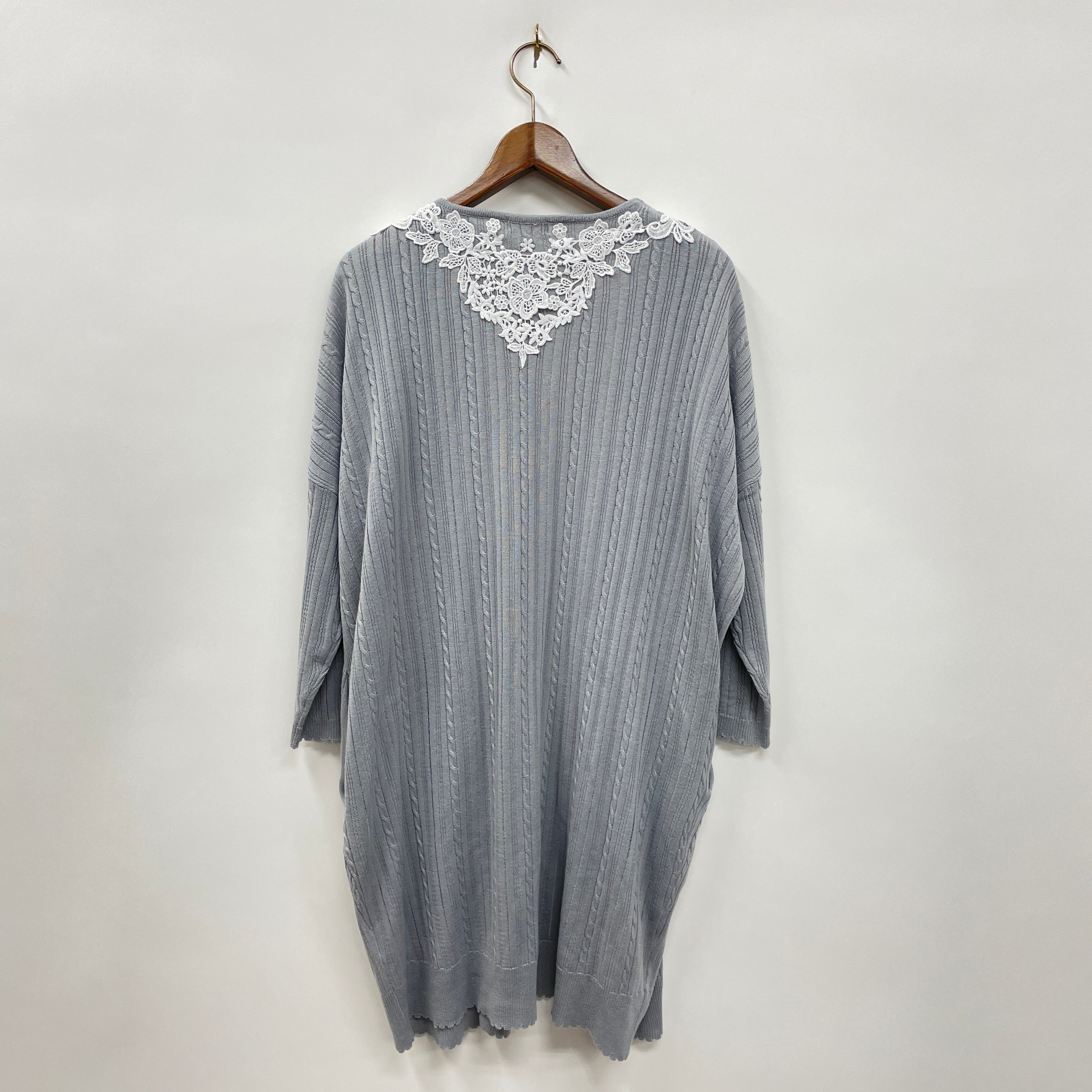 モチーフレースを背中にあしらったロングカーデです。ドロップショルダーになっており、ゆったりとしたシルエットが着やすさ◎縦柄の編み柄もスタイルアップ効果があり嬉しいポイント。