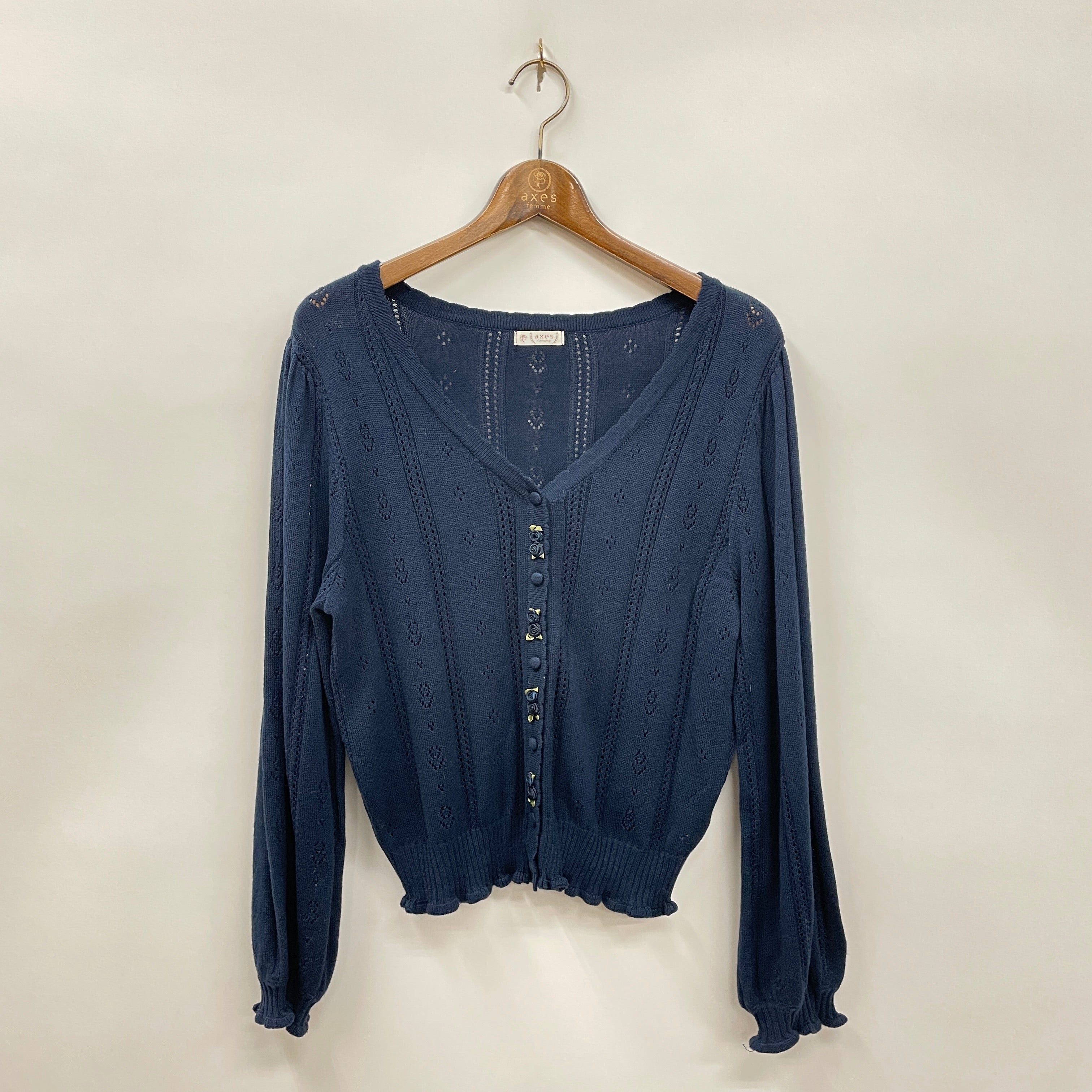 薔薇モチーフが並ぶフロントデザインがポイントのニットカーディガンです。