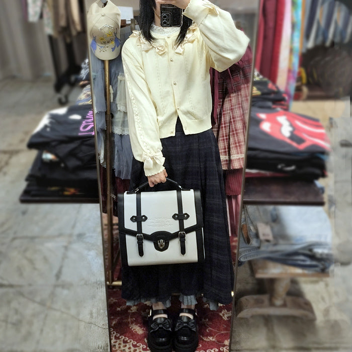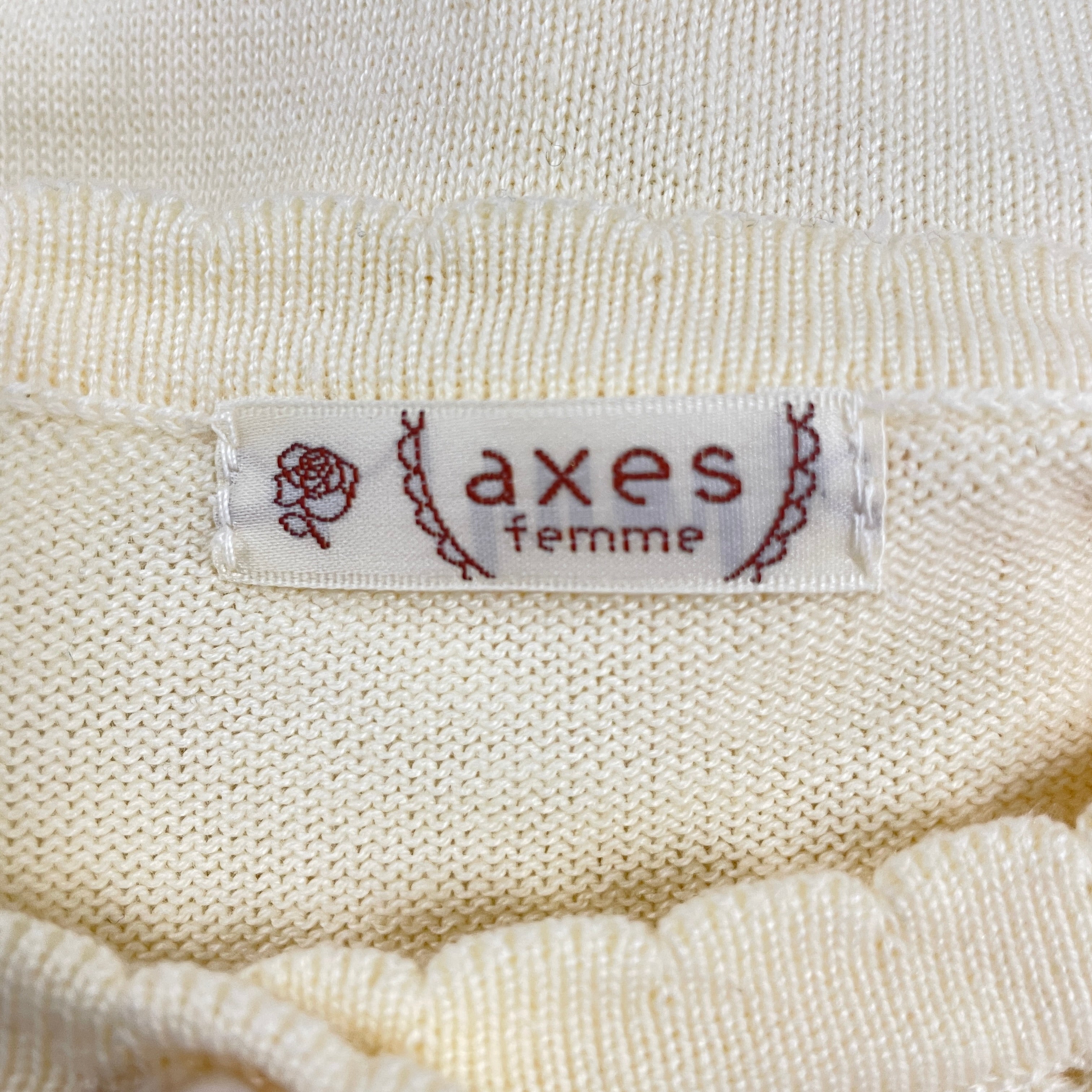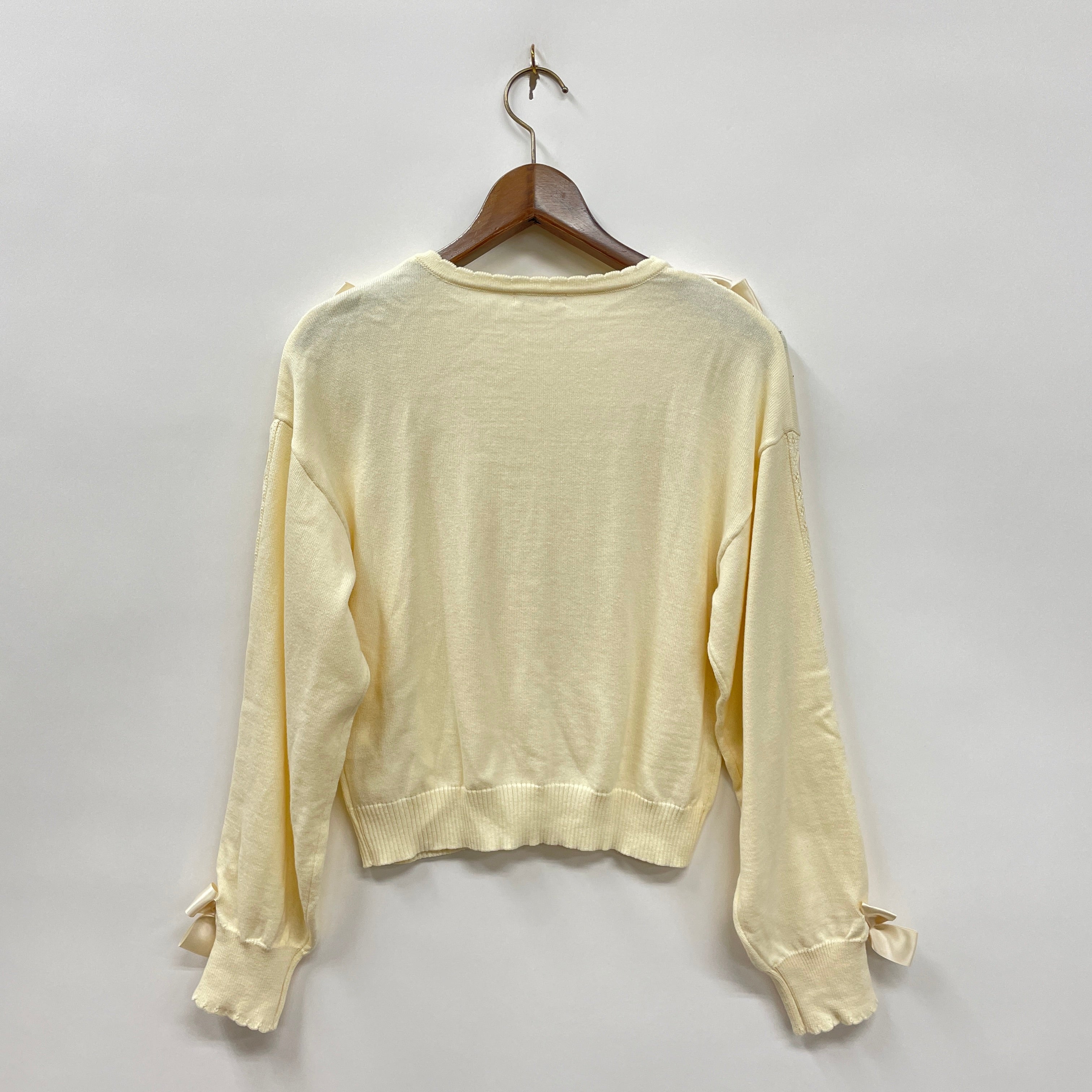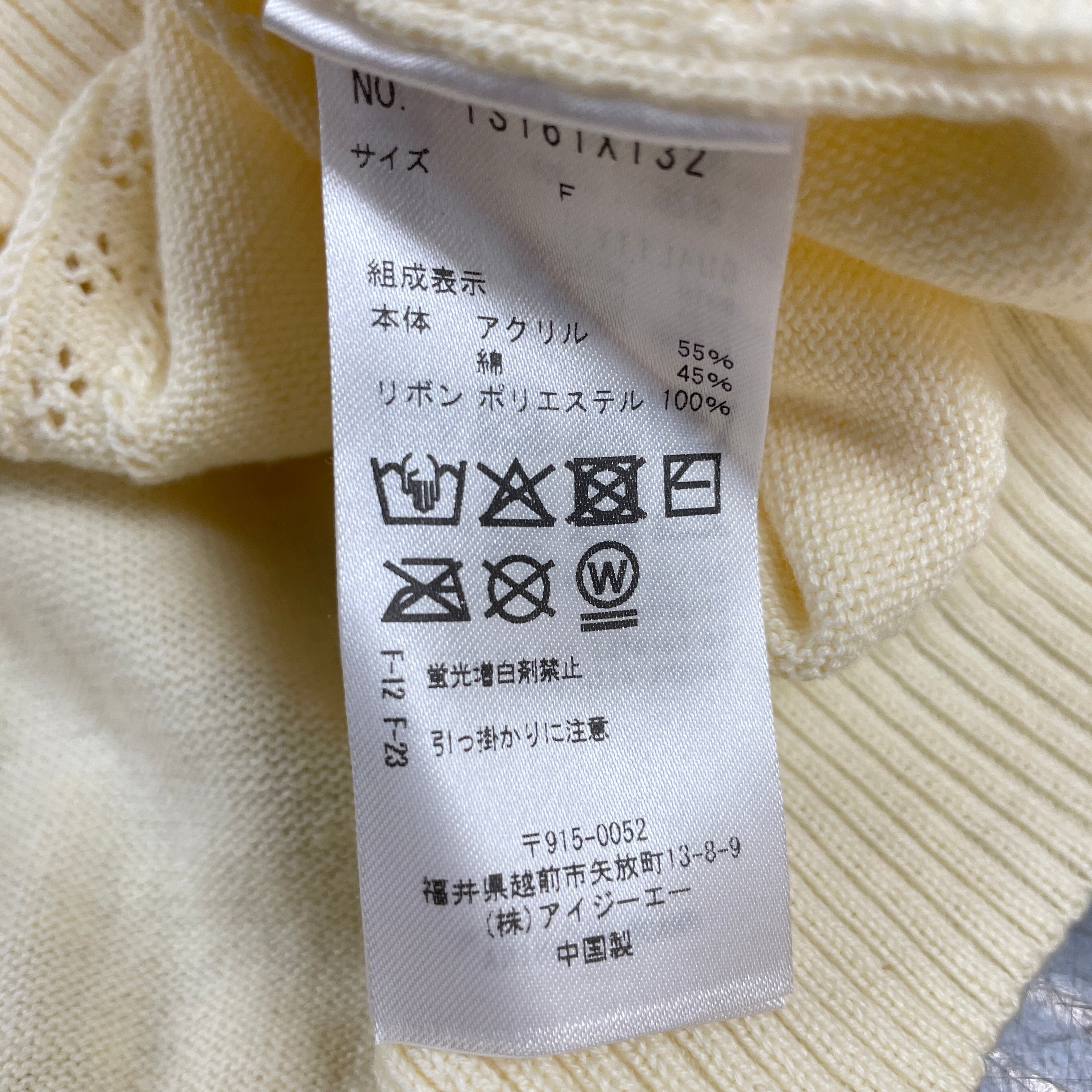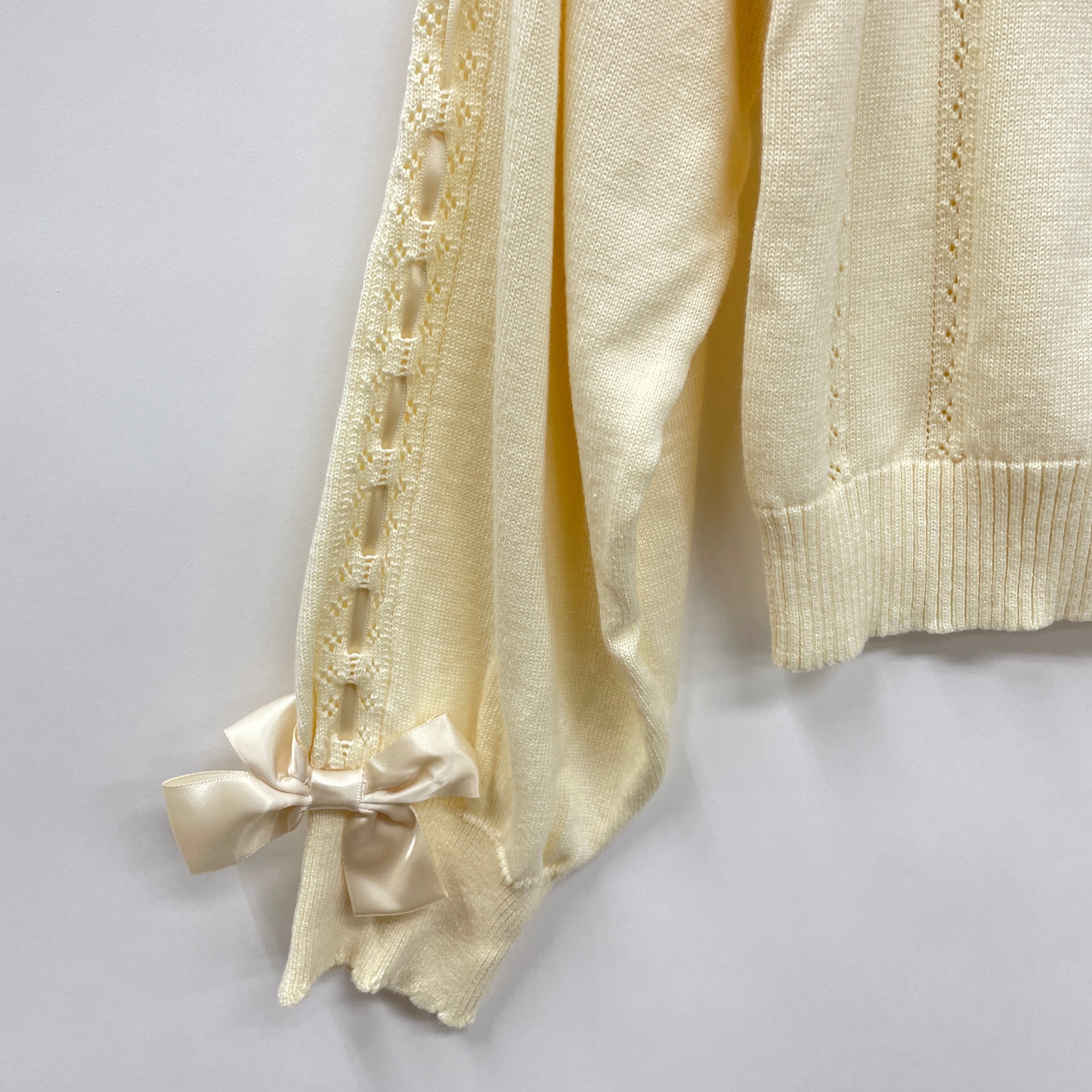 襟周りや袖に施されたサテンリボンが、甘さを加えつつ、エレガントな雰囲気を演出します。シンプルなカーディガンにリボンがアクセントとなり、フェミニンさを引き立てます。
