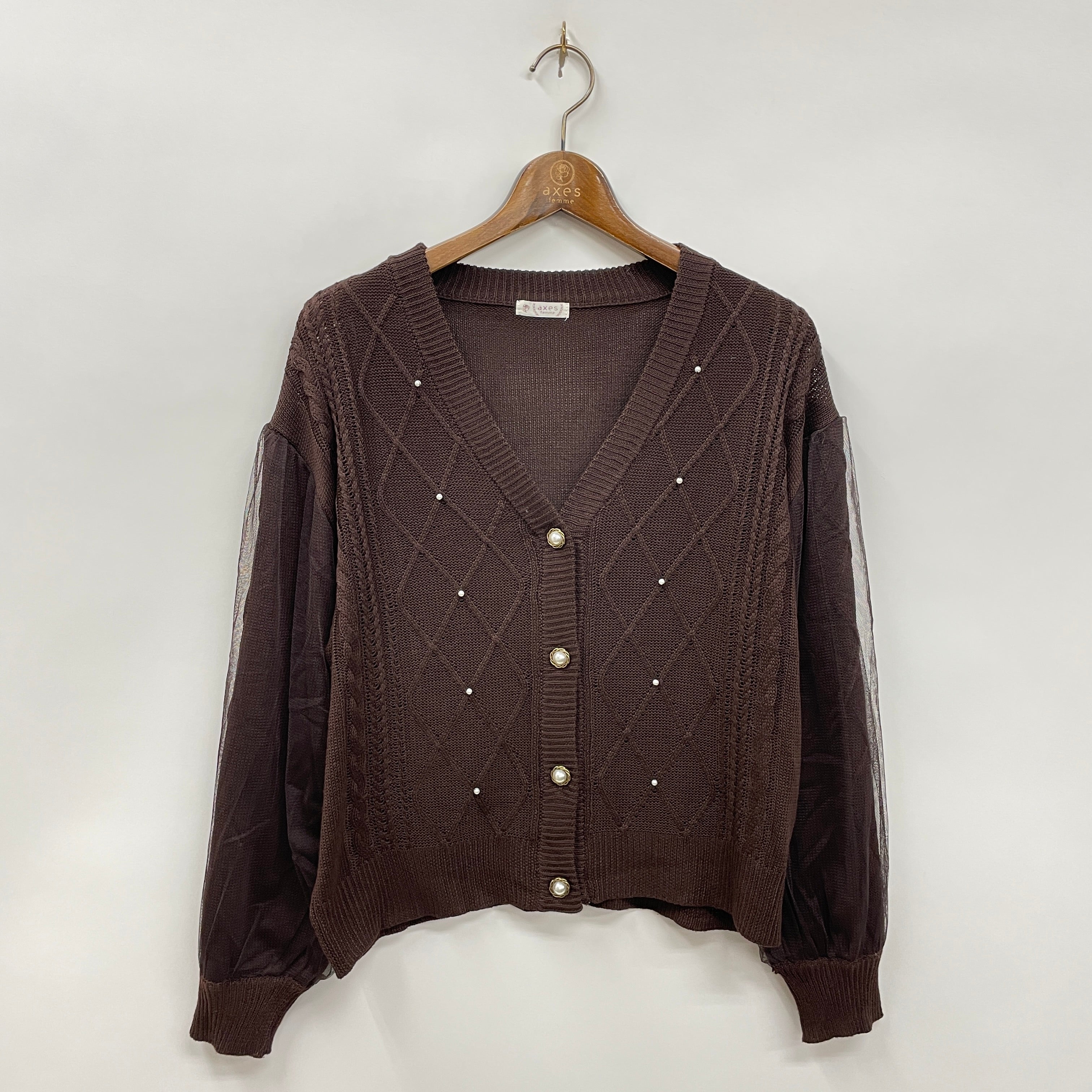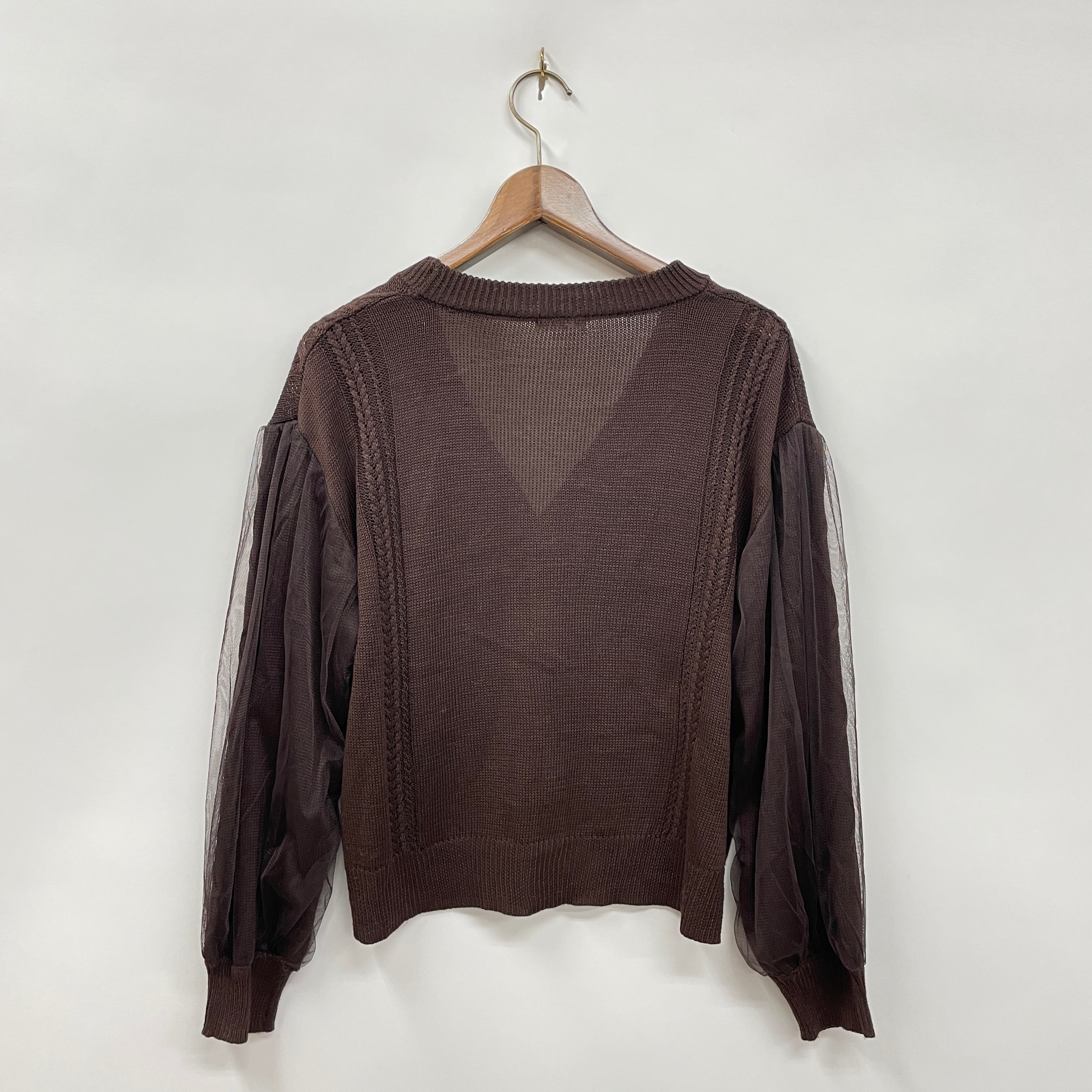 ソフトチュールを重ねたふんわり袖がポイントのニットカーディガンです。