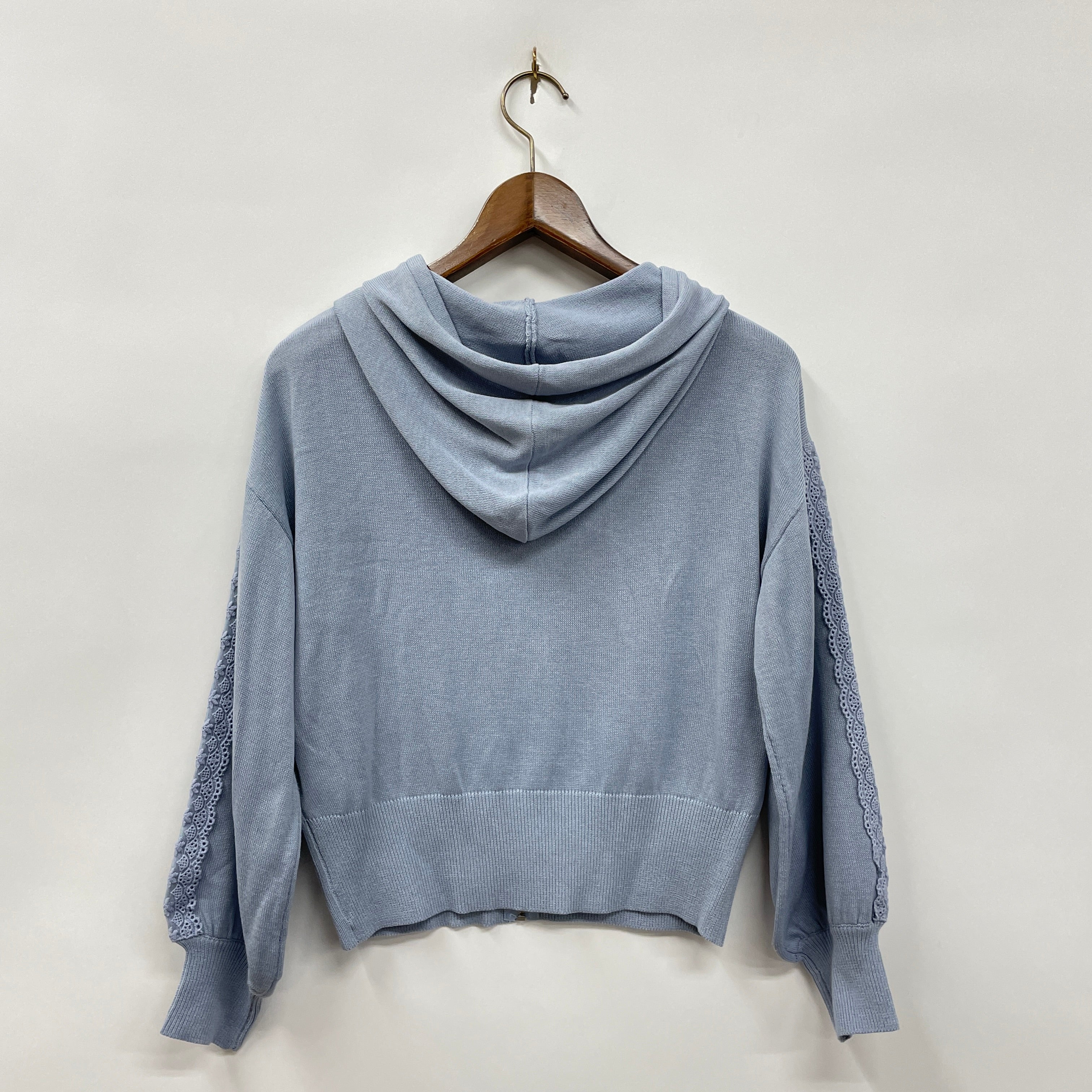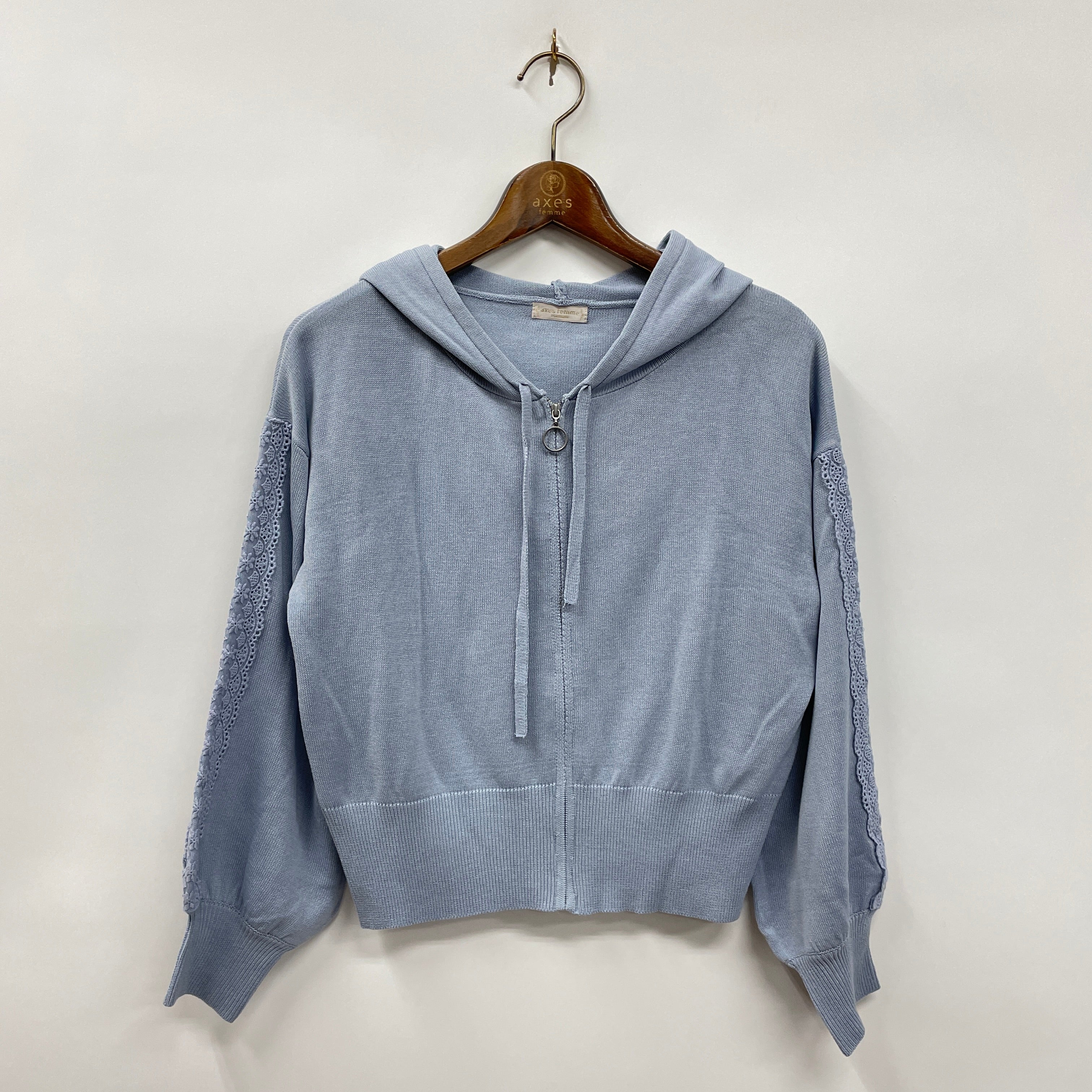 袖にレースをあしらったニット素材のパーカーです。