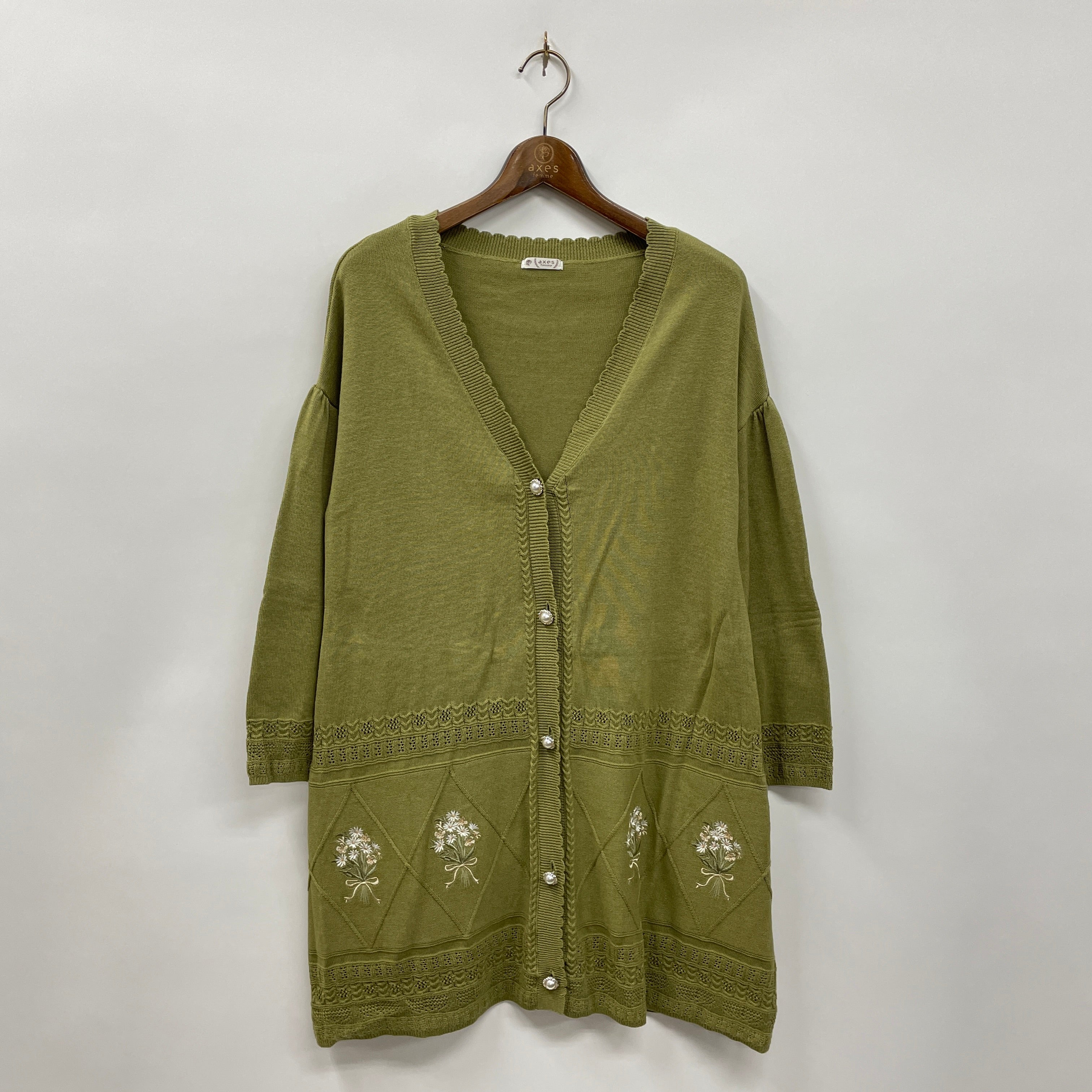 裾に華やかなブーケ刺繍をほどこしたロングカーディガンです。