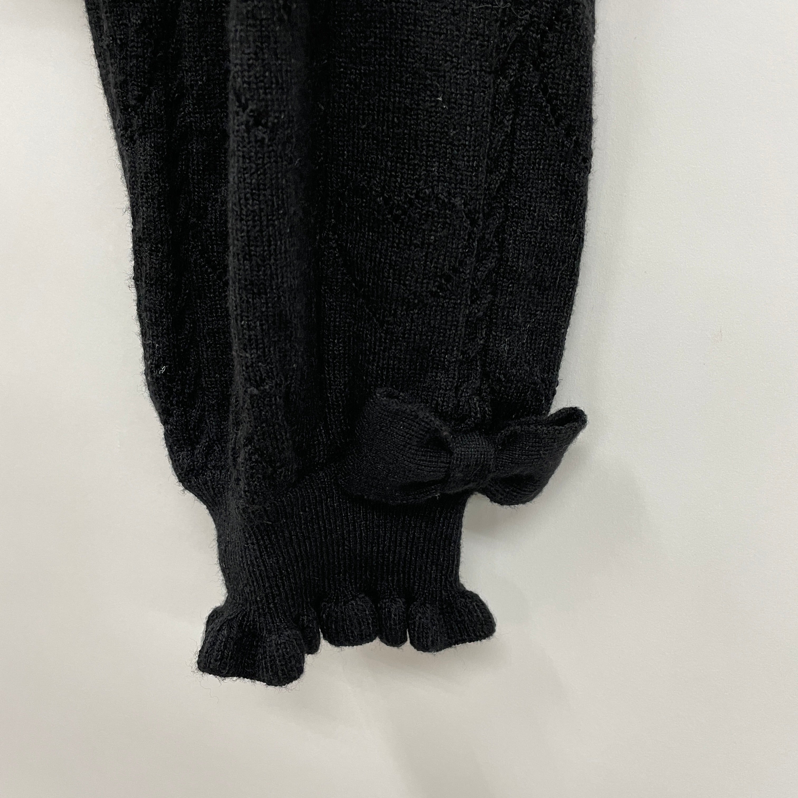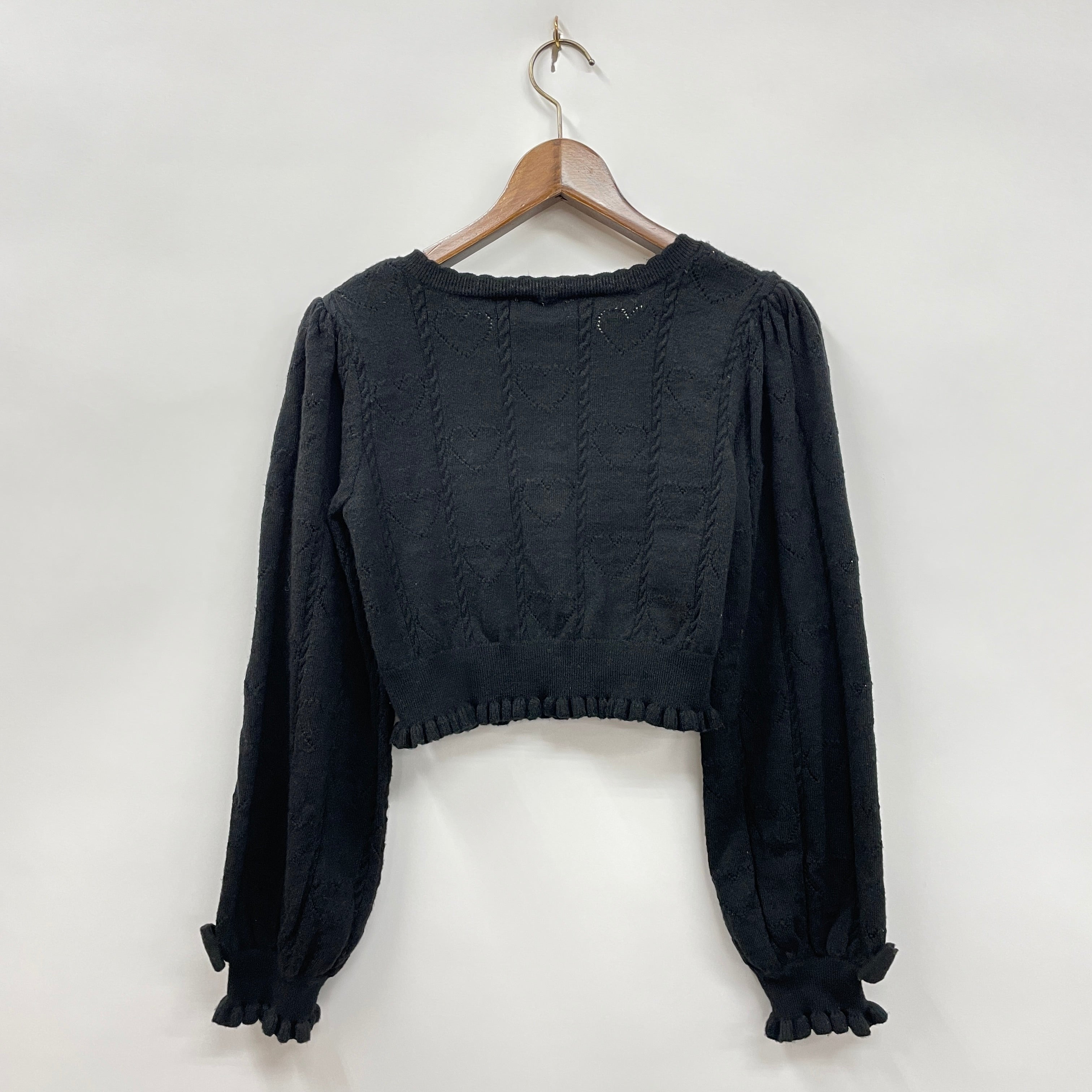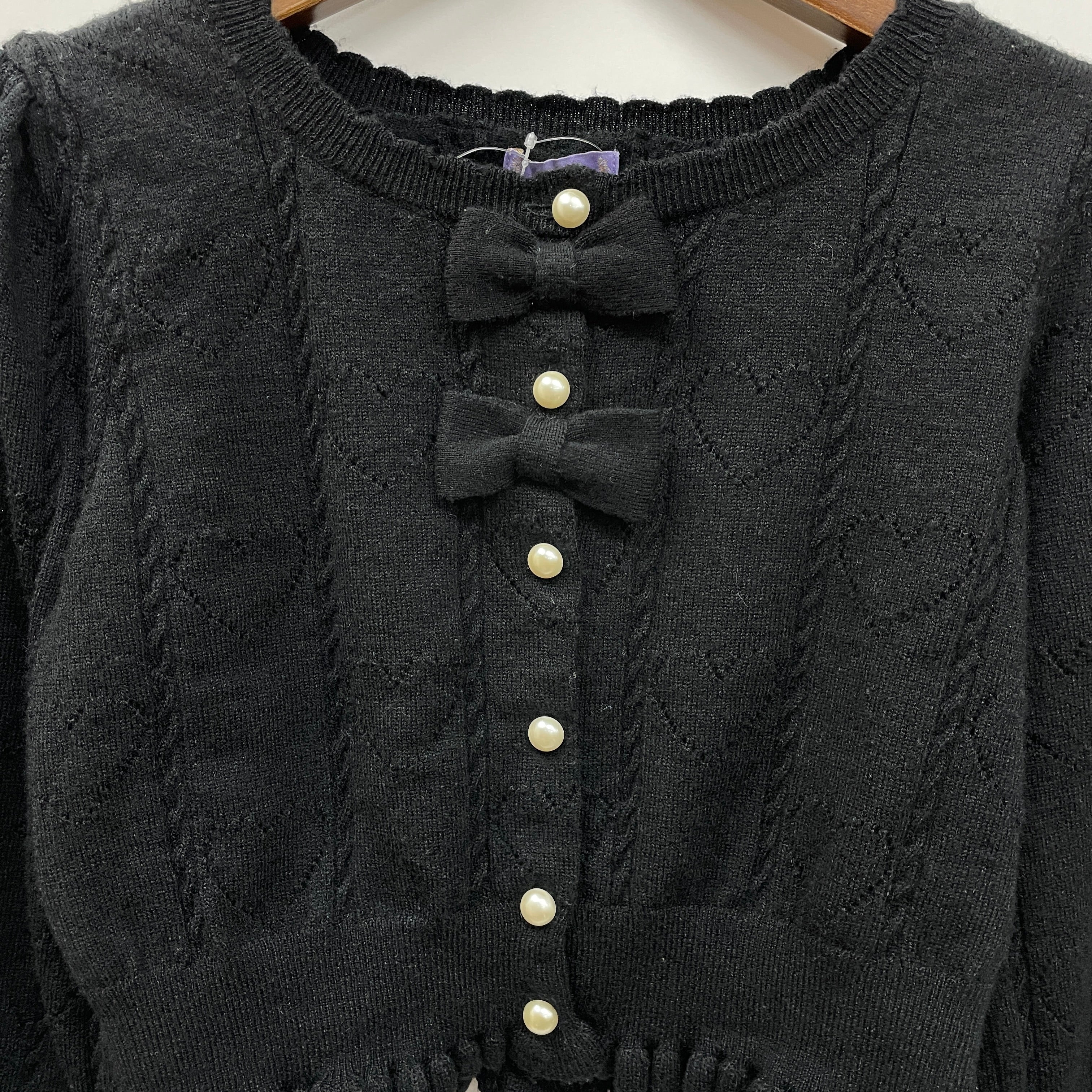 シンプル目で合わせやすくも、さりげないハートの透かし柄やニットのリボンが衿元や手首にあしらわれた可愛い万能カーデです。