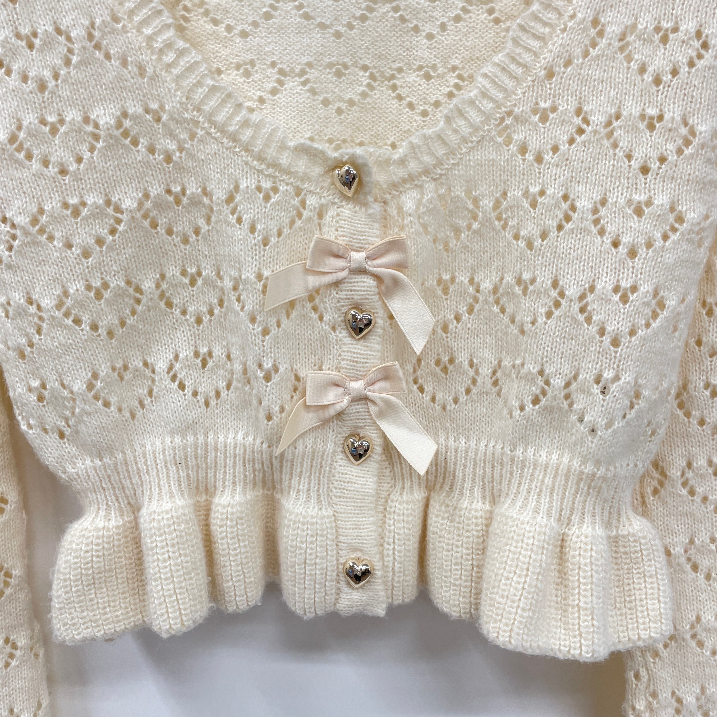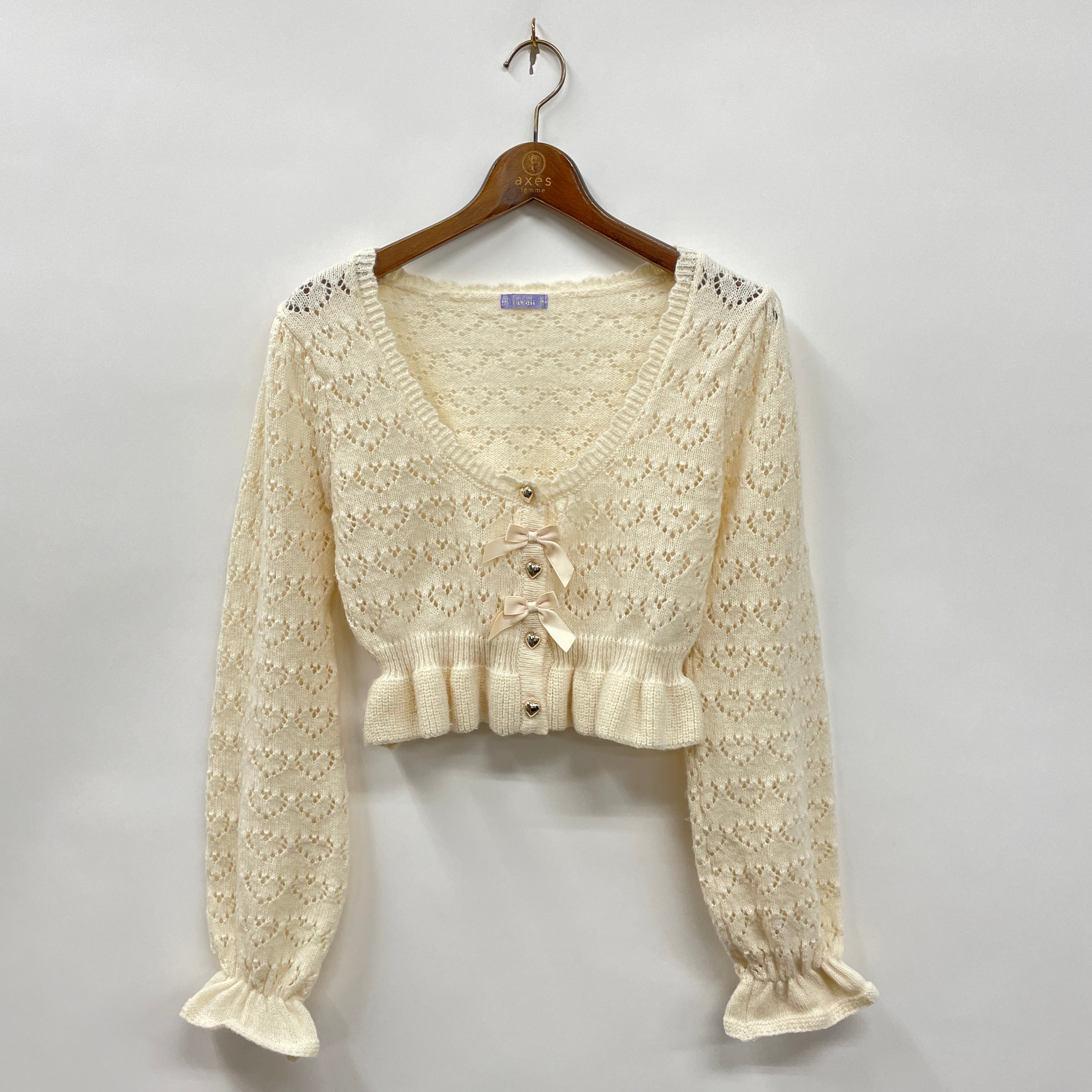 ハートの透かし編みのニットボレロにクマのぬいぐるみがついたリボンブローチがポイント