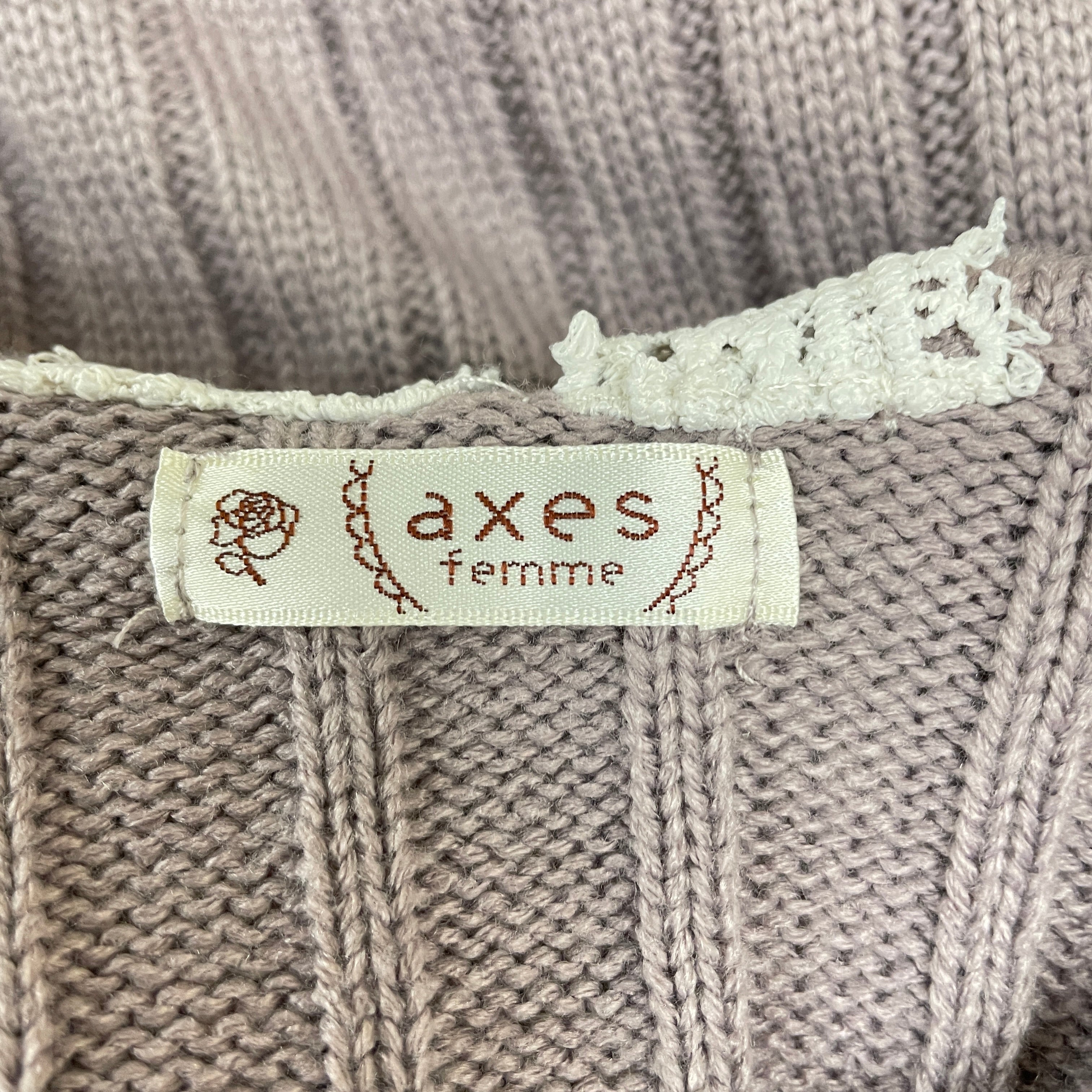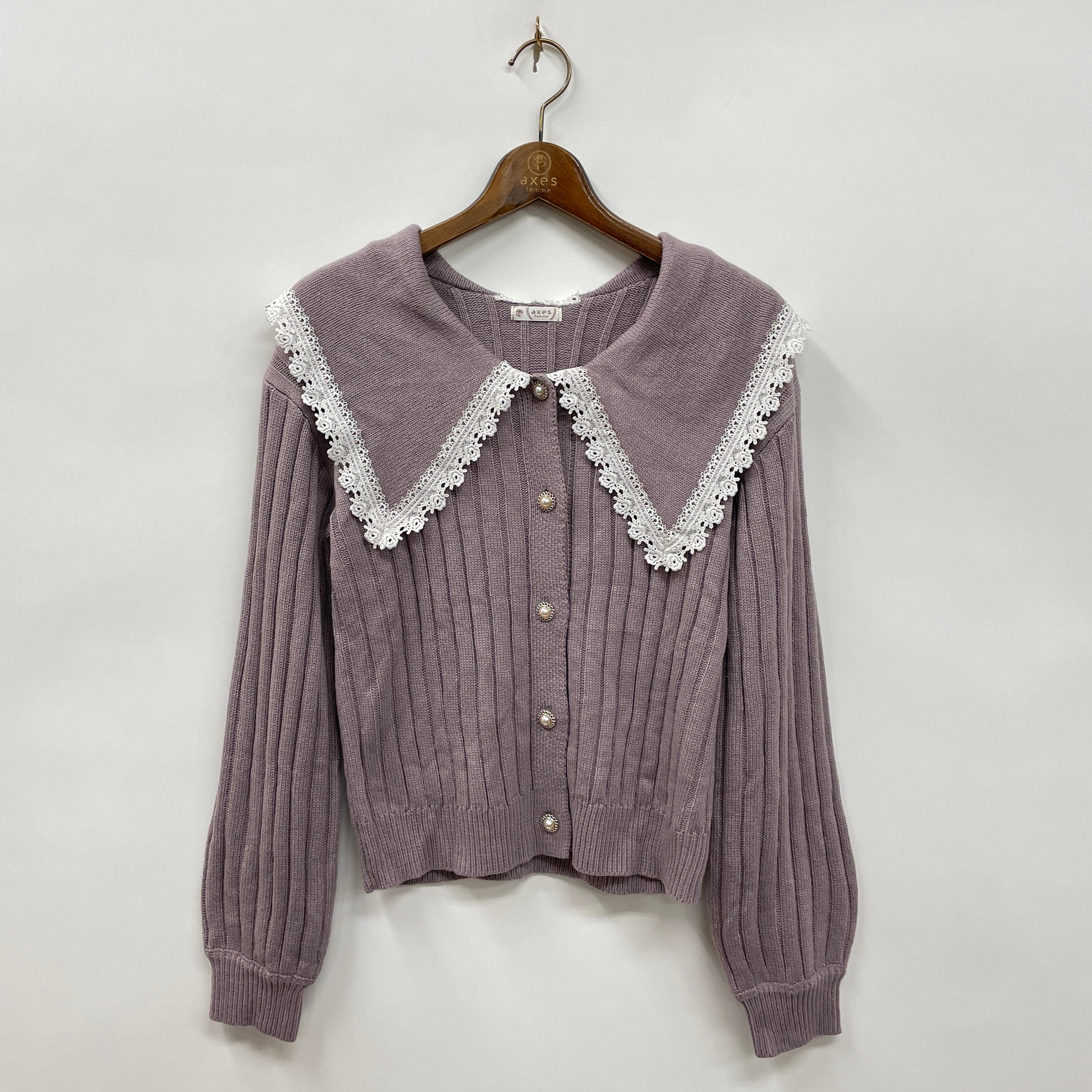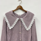 トレンドのビッグカラーデザインがポイントになったニットカーディガンです。襟フチにレースを施しフェミニンなデザインに落とし込みました。パールボタンをあしらい細かい部分のデザイン性も◎。しっとりとした素材感で春まで使えるニット素材です。前を閉じてトップスのように着こなしていただけます。