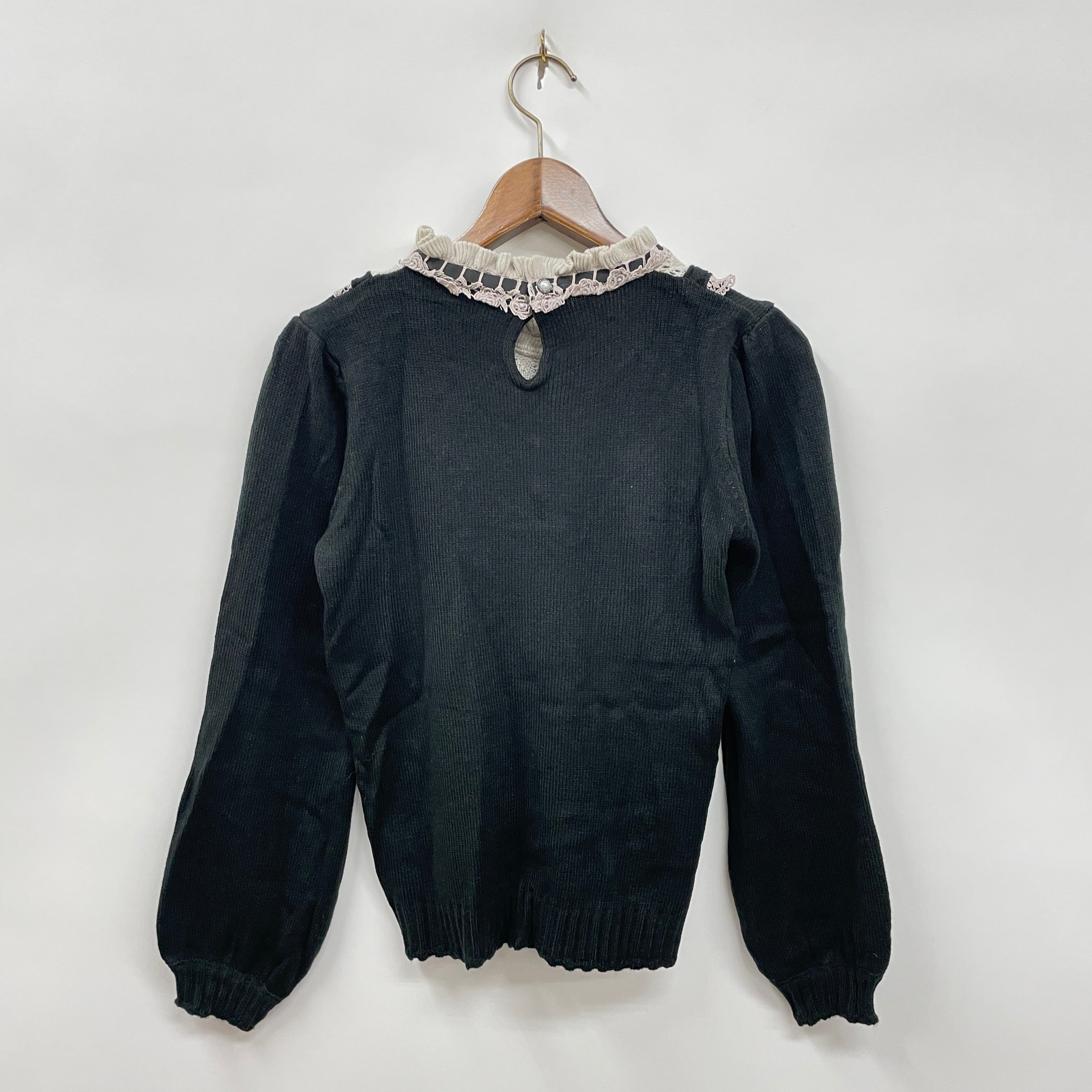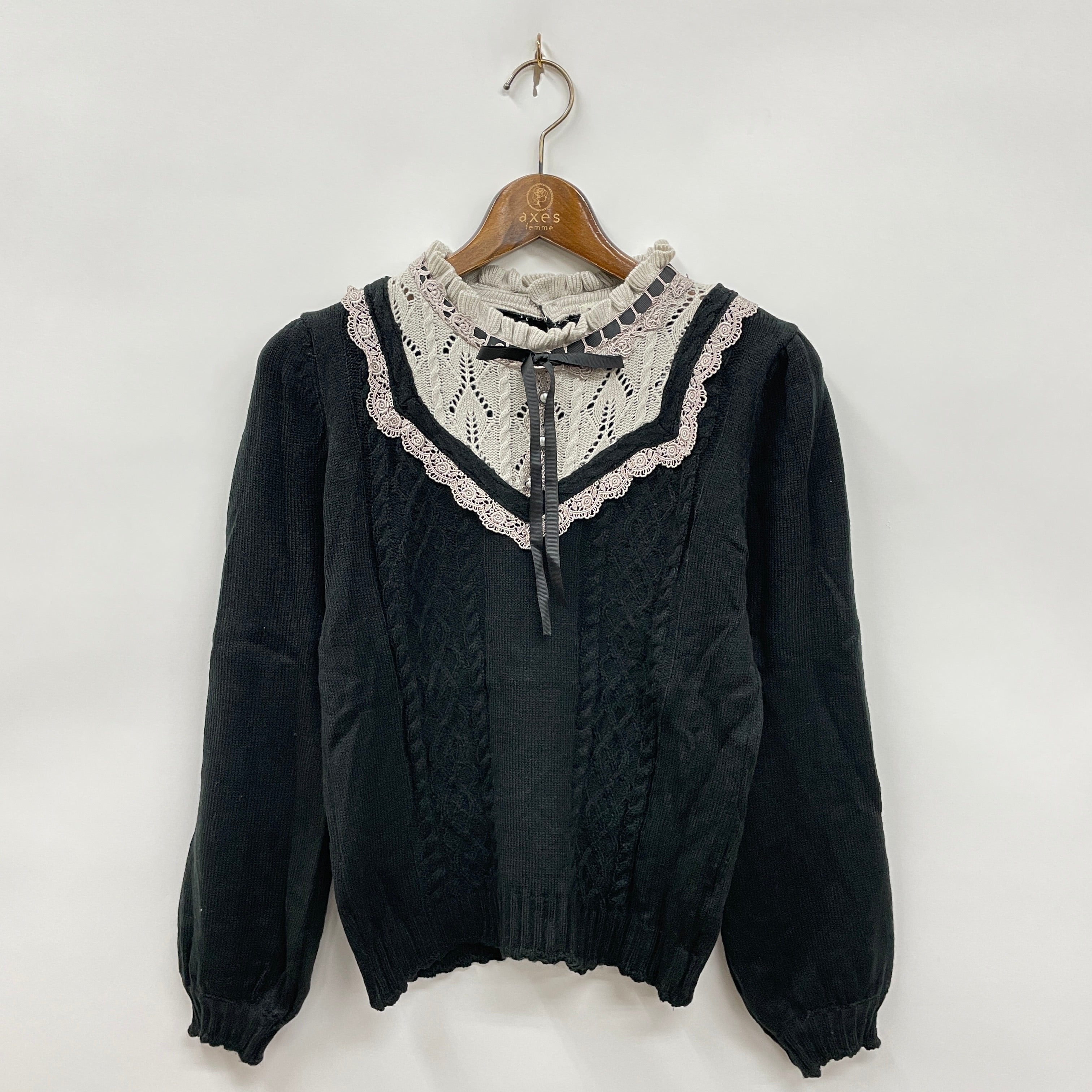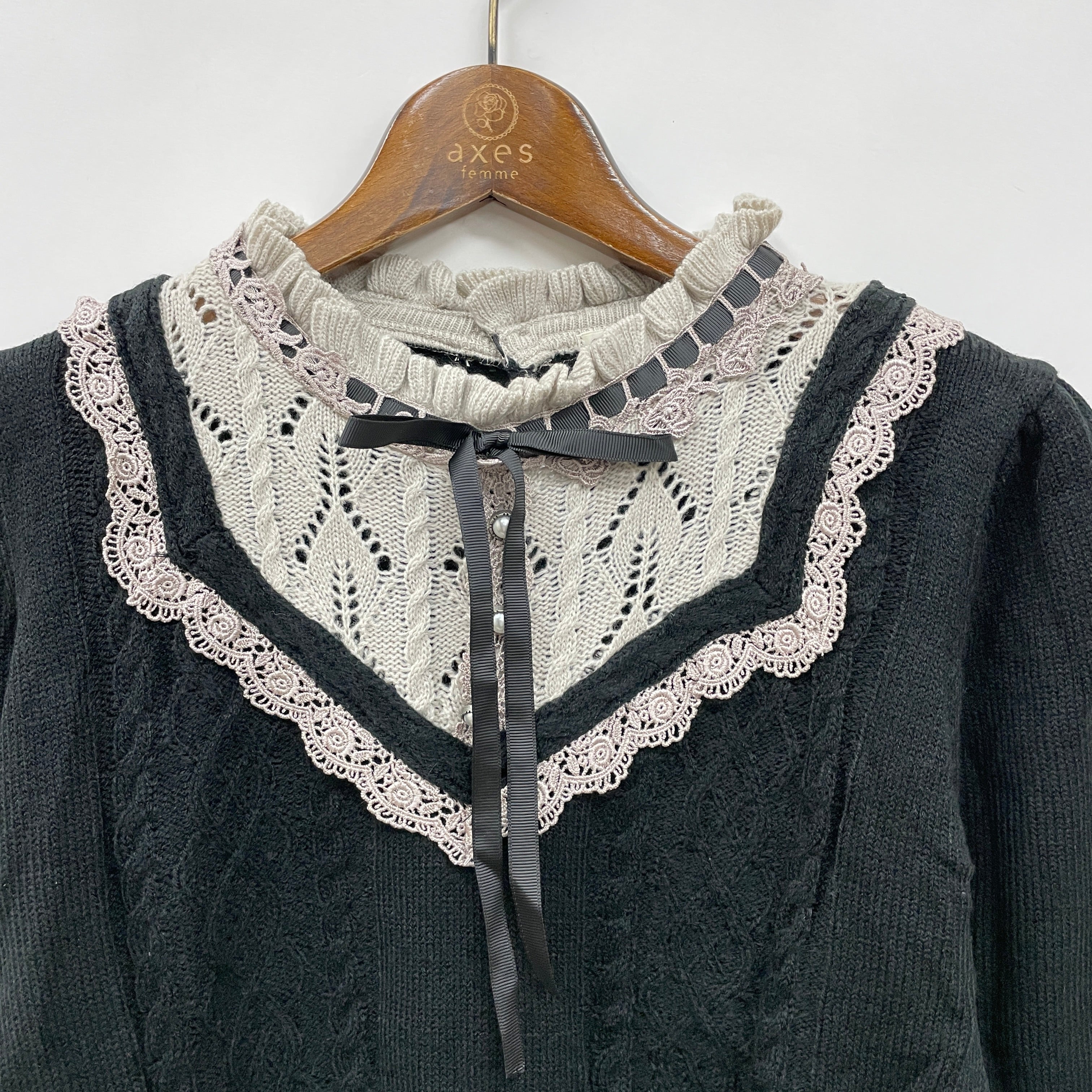 ニット素材のプルオーバー。フロント部分にブロッキングデザインを施しレイヤード風のデザインがフェミニンなアイテム。薄すぎず厚すぎない素材感のためスカートやジャンスカのインナーとしても◎さりげないレースやリボン使いがクラシカルなデザインポイントです♪