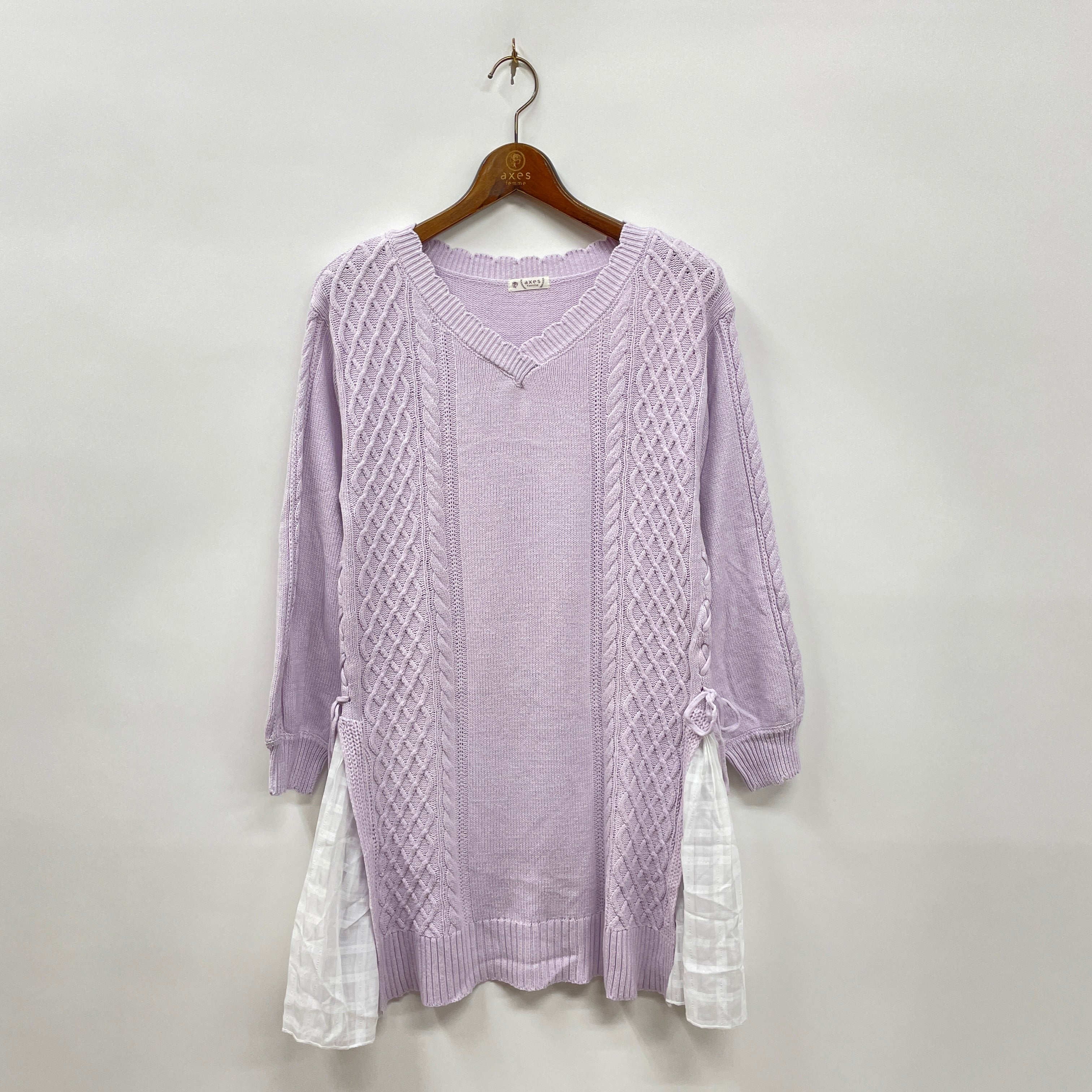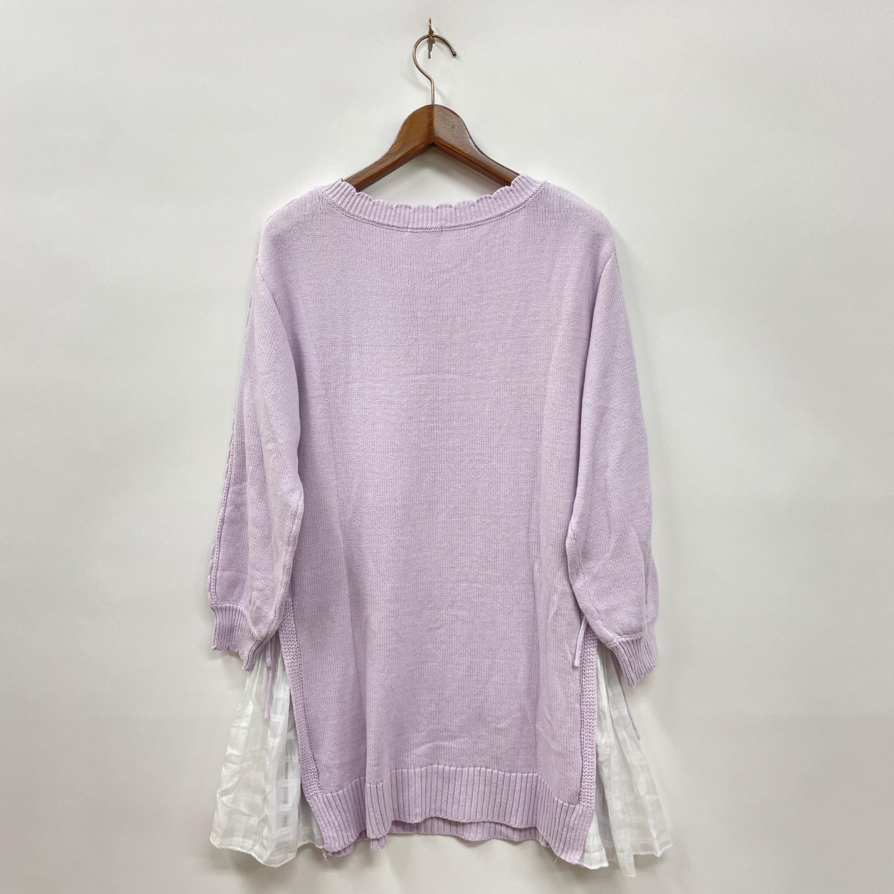 透け感のあるシアー素材のプリーツで両サイドを切り替えたニットチュニックです。春まで使える明るいカラーリングのチェック生地で切り替えています。プリーツの切り替え上がさりげなくレースアップになっているのもデザインポイント。トレンドのチュニックはすっきりしたシルエットのボトムスと合わせるスタイリングがオススメです。