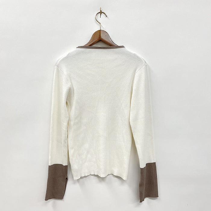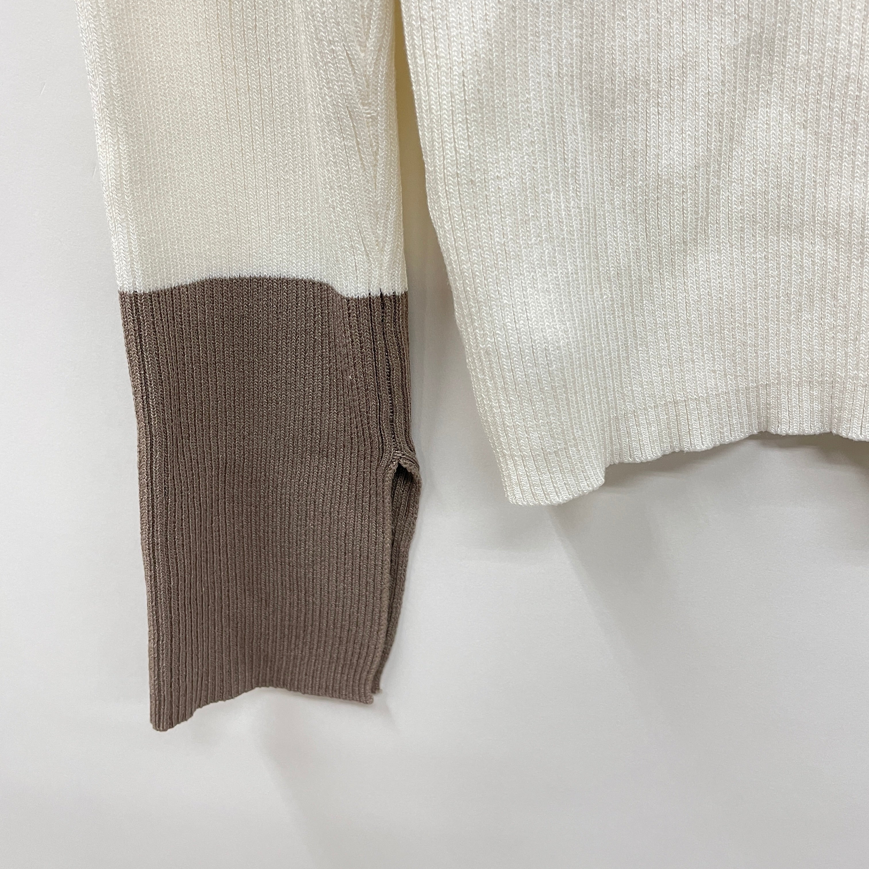 全体はすっきりとしたリブ編みデザインで、ボディラインを美しく見せるシルエットになっています。袖口の配色がポイントとなり、シンプルなスタイリングに遊び心をプラス。柔らかな素材感で、季節を問わず快適に着用できます。
