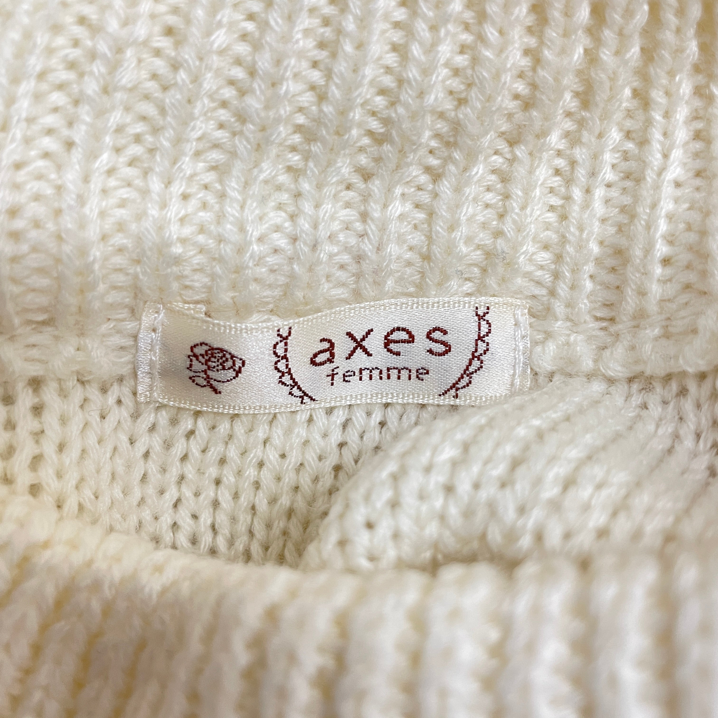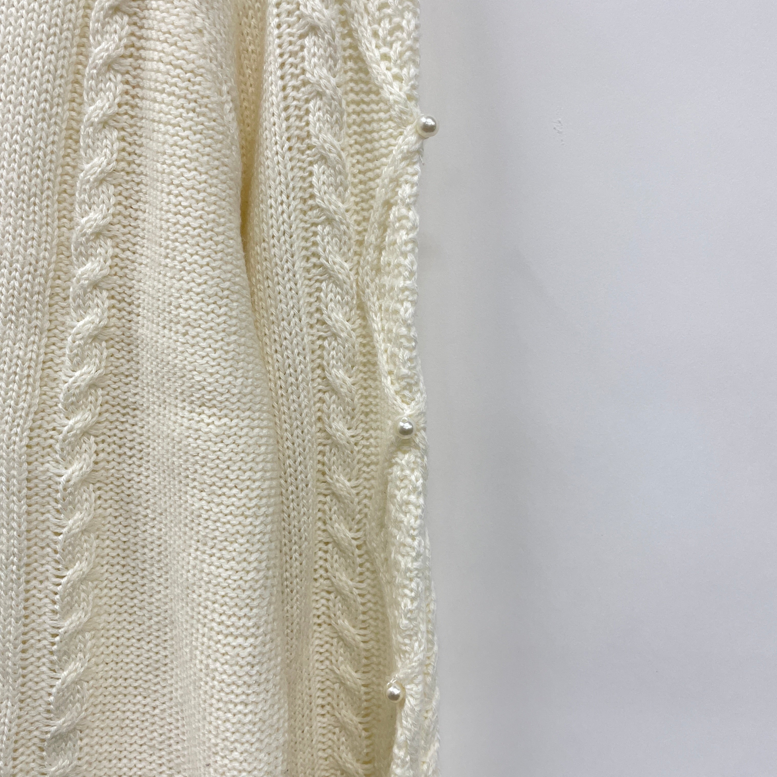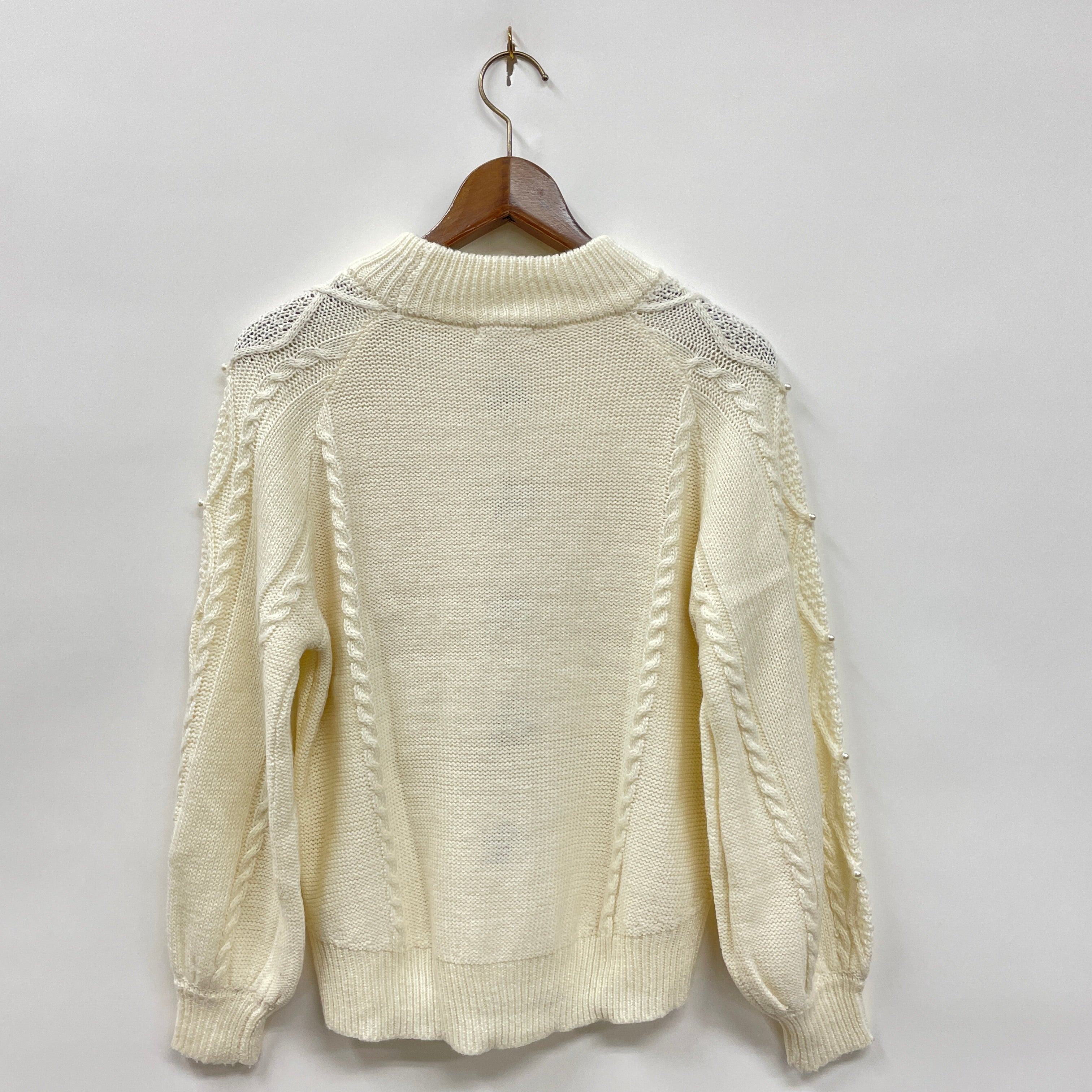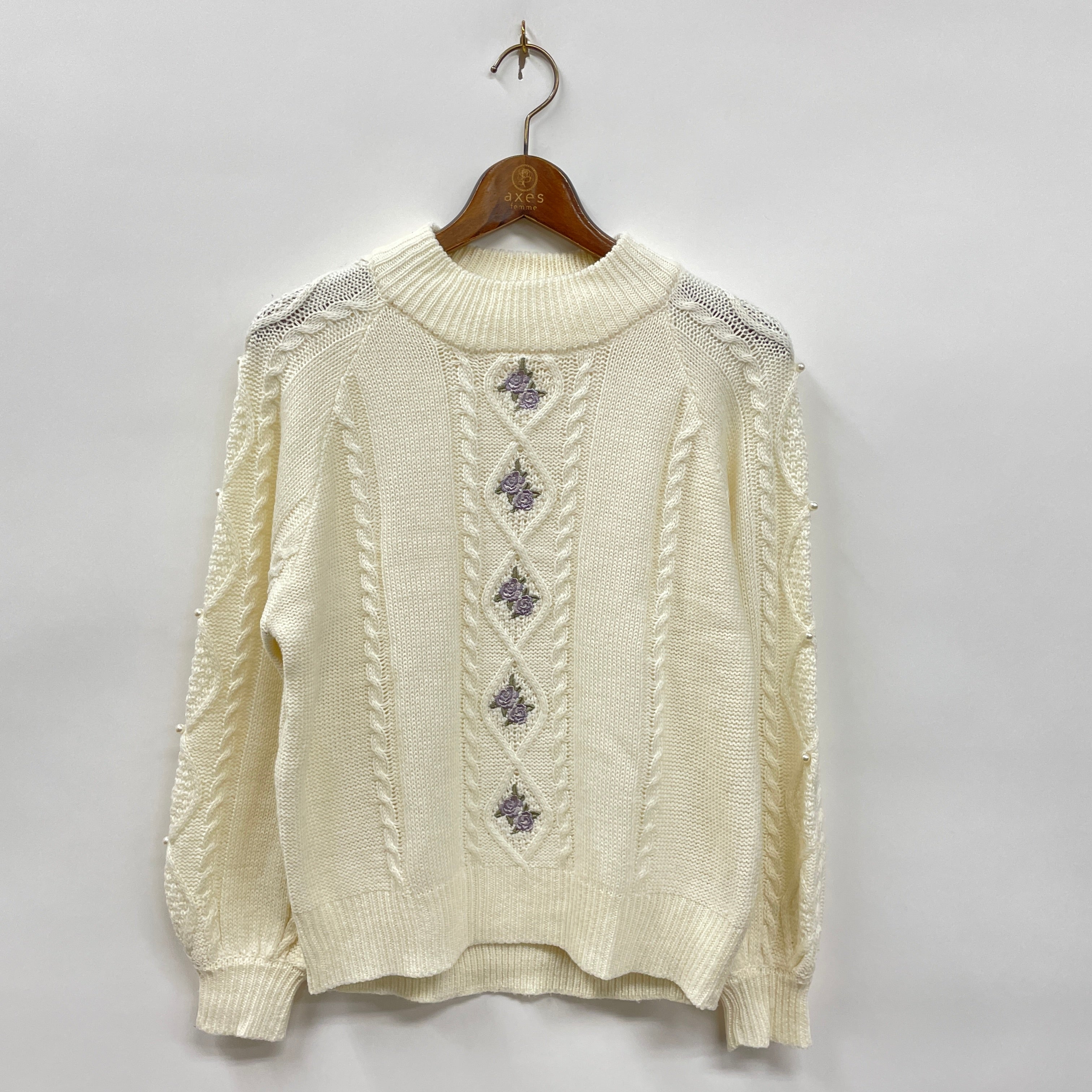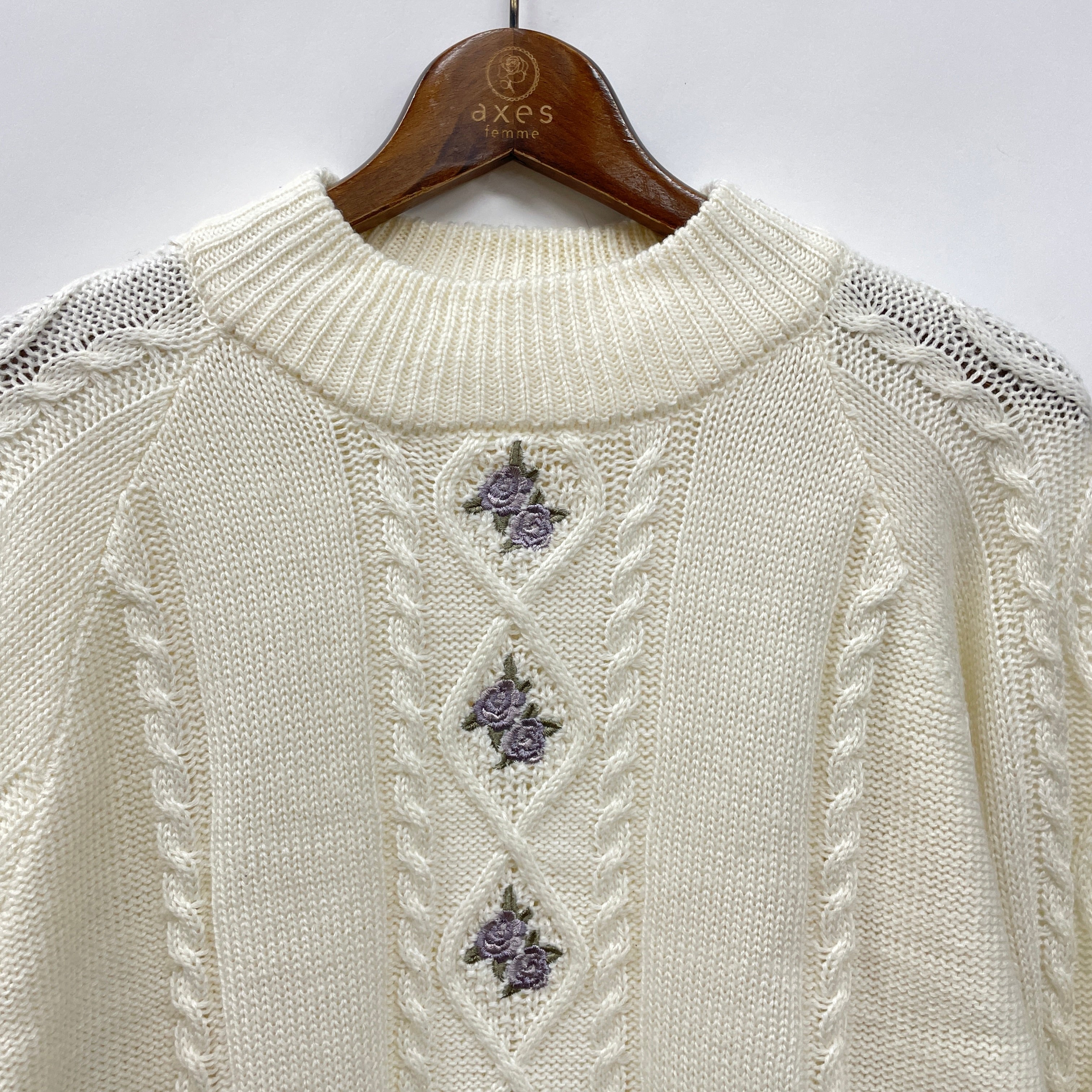 中心のダイヤ柄のケーブル編みの中にバラの刺繍が入ったニットプルオーバーです。今年らしい袖デザインで、ケーブルの上をパールが飛んで、アクセントになっているのもポイント。ゆったりシルエットが今年らしく、ボトムスを選ばず、インスタイルでもアウトスタイルでも合わせられる便利なアイテムです。