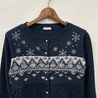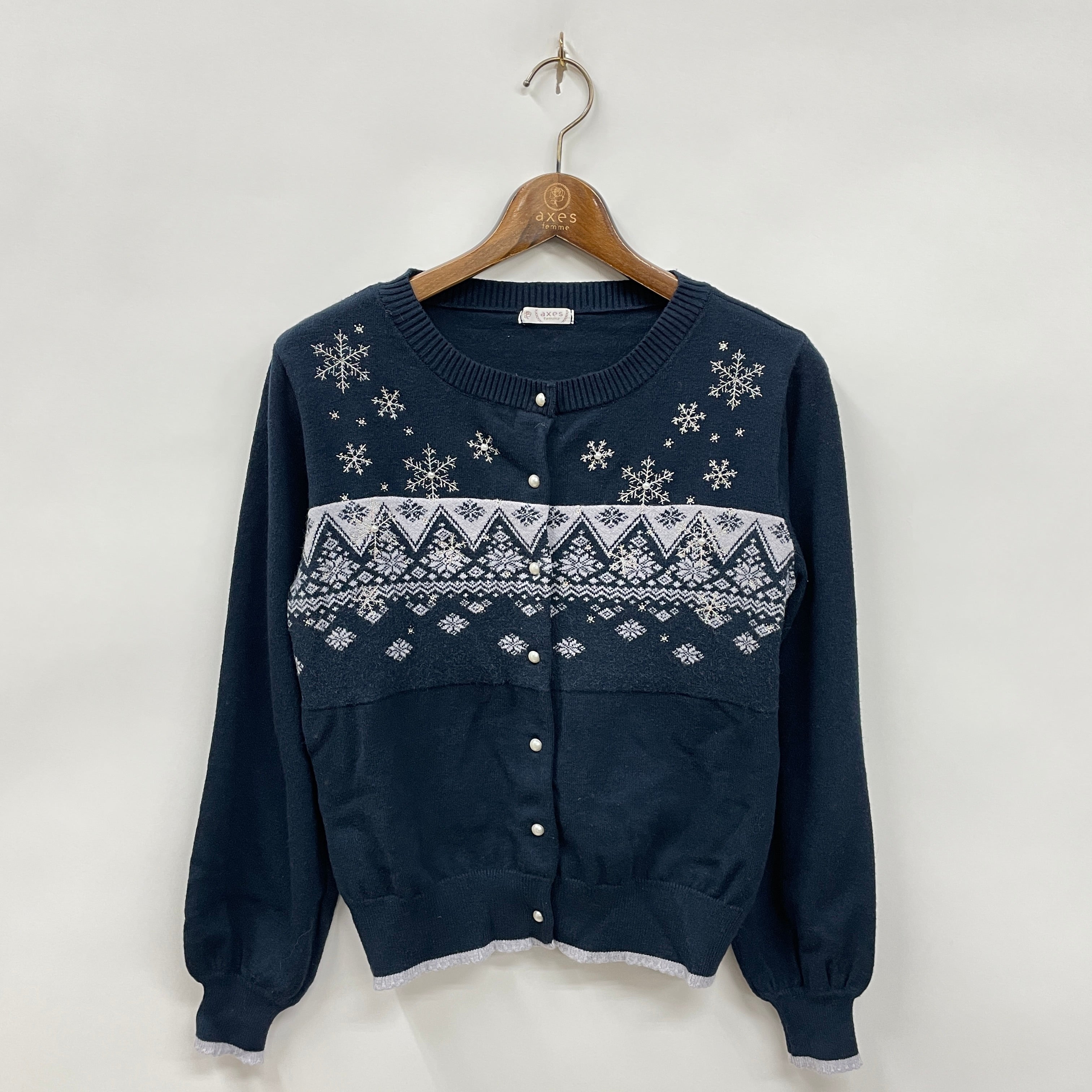 雪柄のジャガードニットカーディガンです。ラメ糸で雪の結晶モチーフが刺繍され、パールが手付けされたaxesfemmeらしいアイテム。