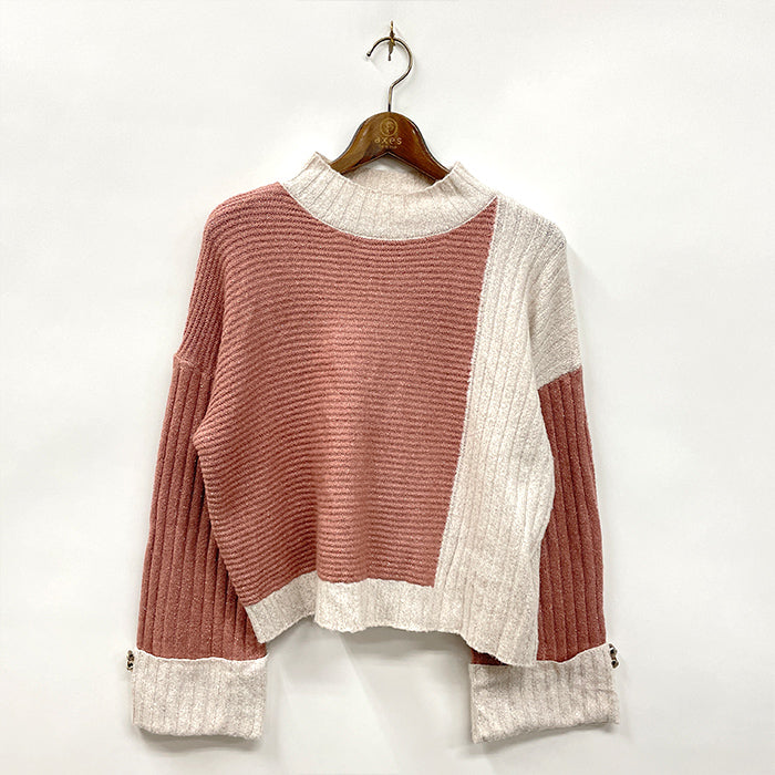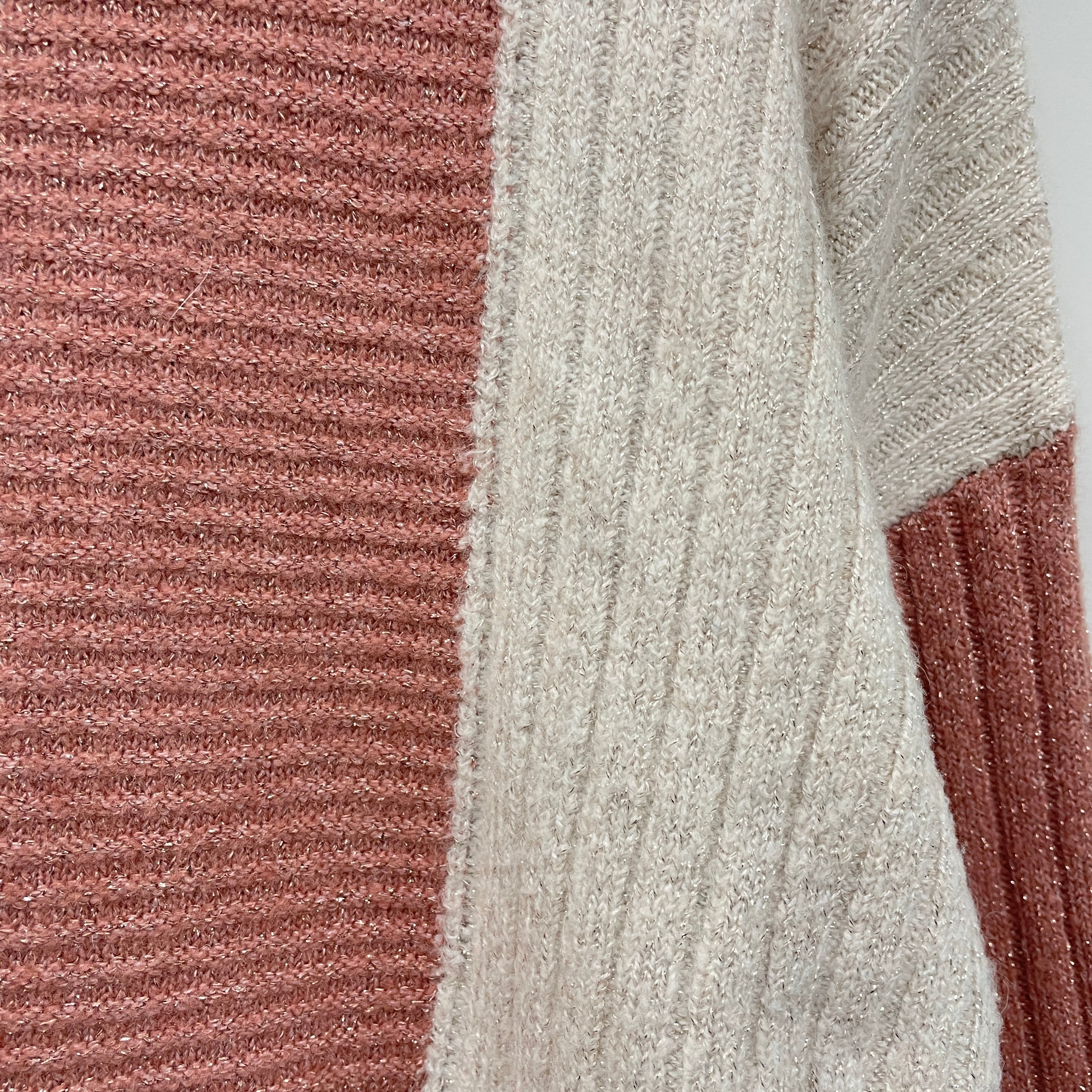 バイカラー使いがポイントで、編み込まれたラメ糸も異なるため、ハッキリした色の違いが楽しめるアイテムです。