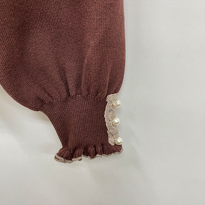 袖口長めカフスは、チュールレースの上にパールボタンがあしらわれたデザイン。