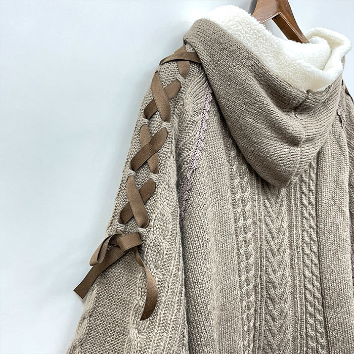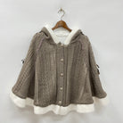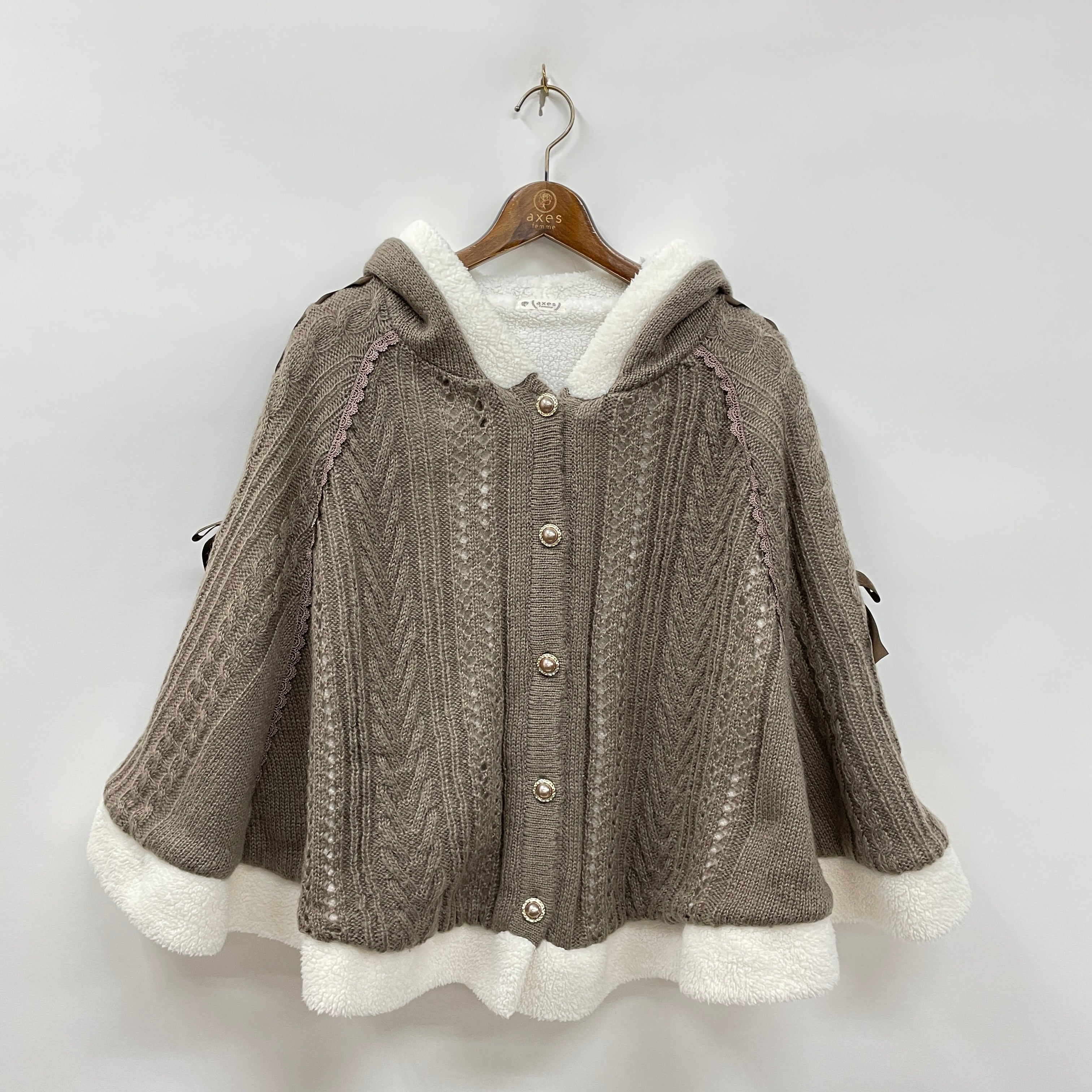 ニット素材のポンチョです。ふわっとしたてざわりで着心地◎なアイテム。もこもこのボアが裏についておりデザイン性、防寒性共に高いアイテム!ワンピースやスカートに合わせてフェミニンなスタイリングを楽しめます♪