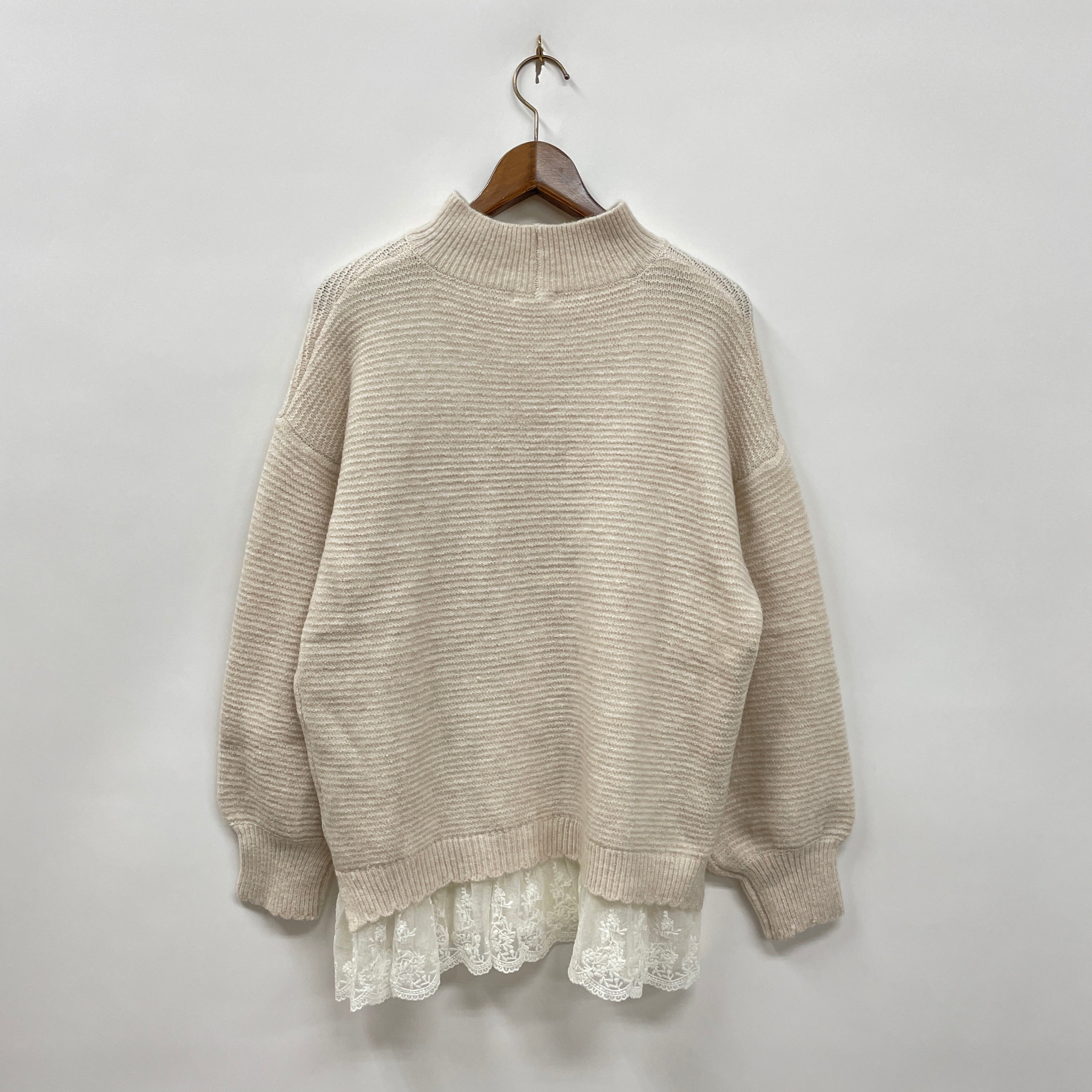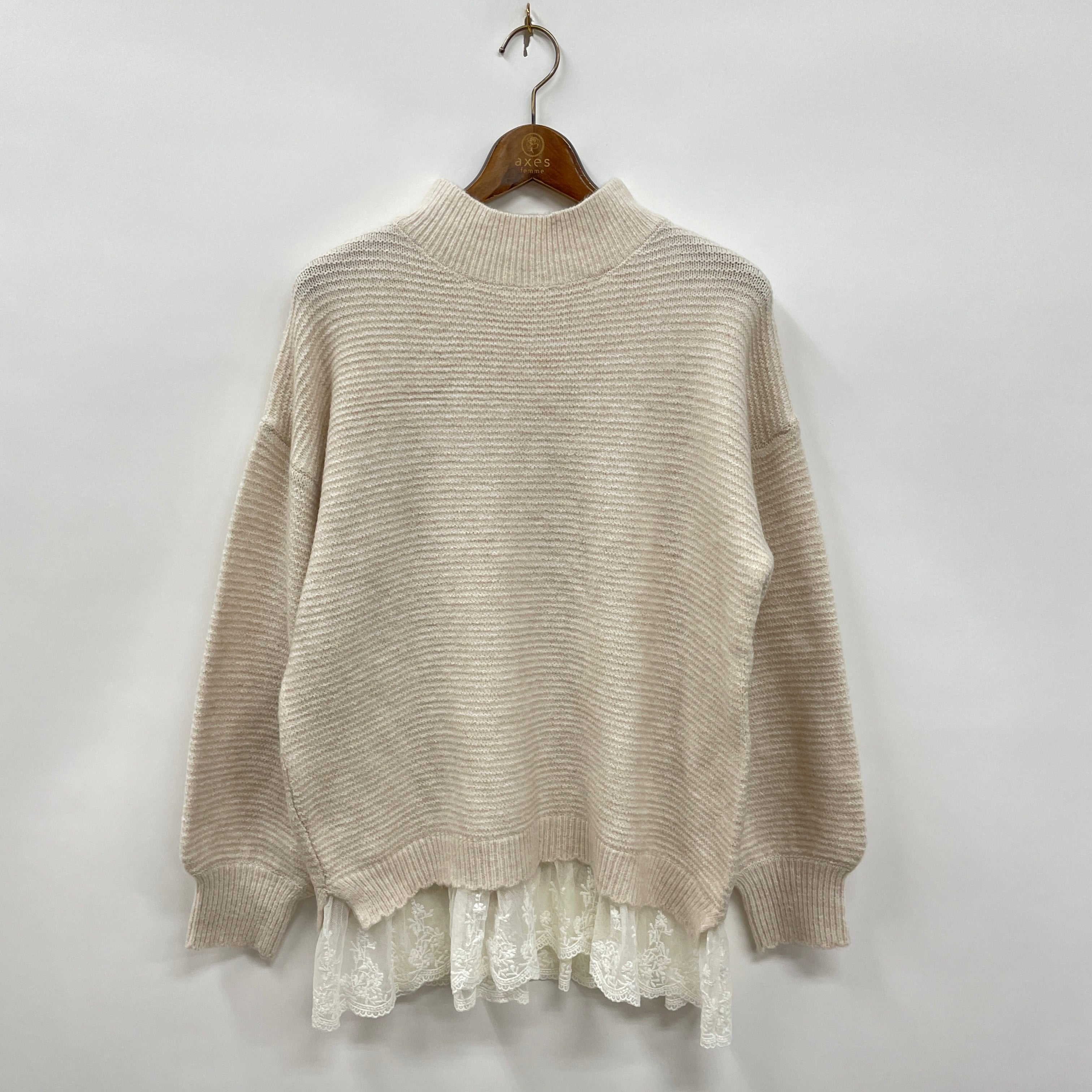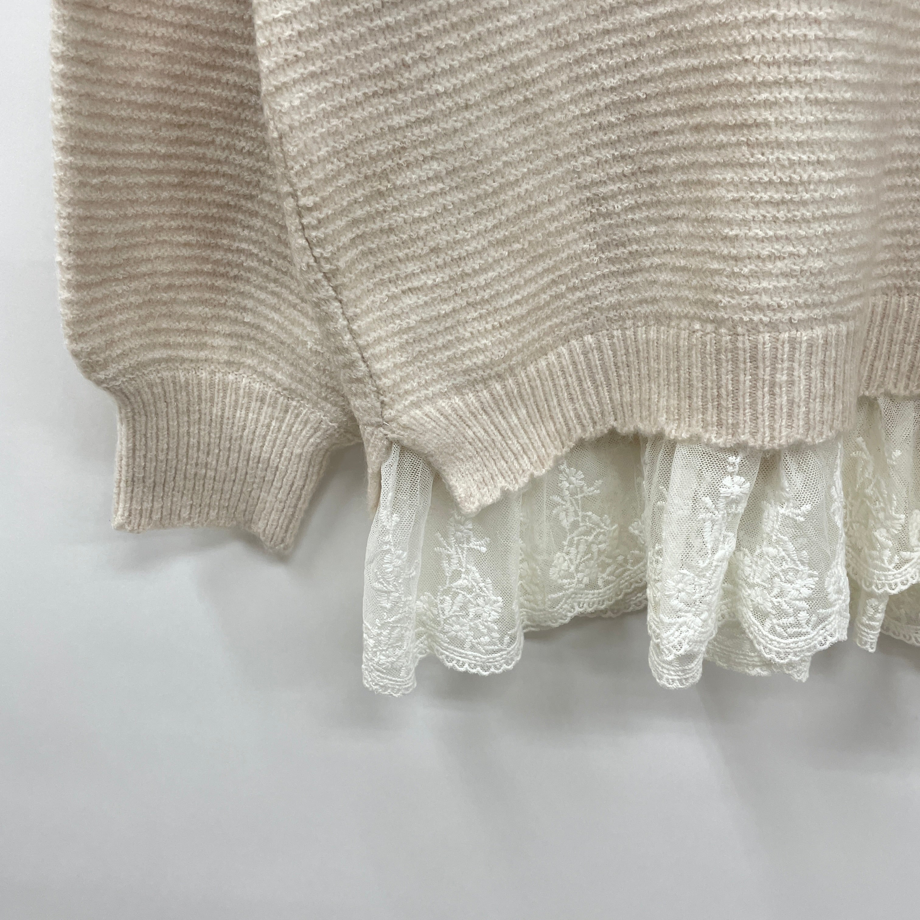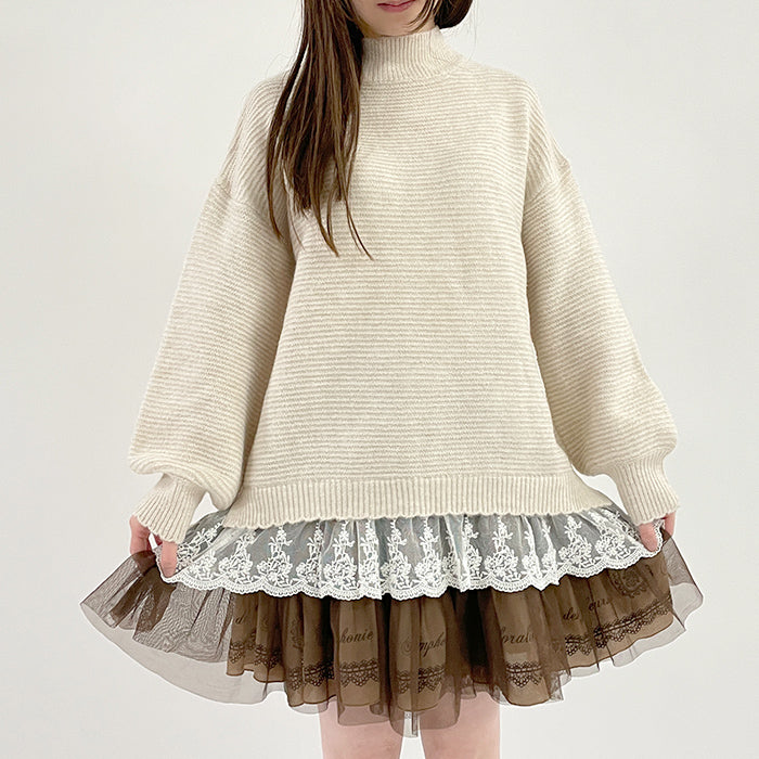 裾にチュールレースをあしらったニットチュニック。オーバー気味の肩幅、ゆったりとした身頃・裾の広がりで体をまったくしめつけずリラックスしてご着用いただけます。前後で差をつけることで、気になる腰回りをカバーします。落ち感のあるロング丈のスカートやパンツスタイルで大人可愛く、ショート丈のキュロットやロングブーツでトレンドライクな着こなしどちらもおすすめ!