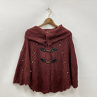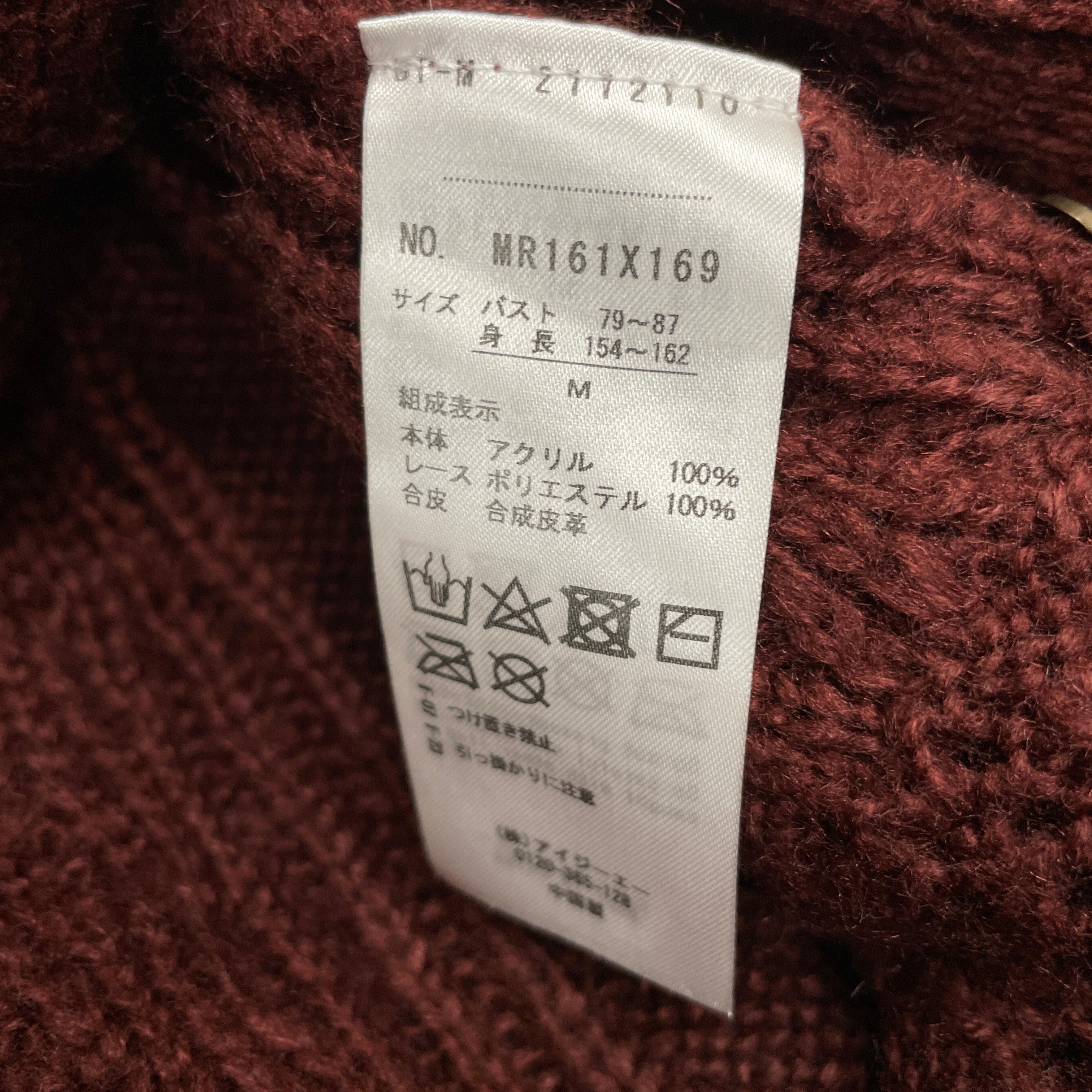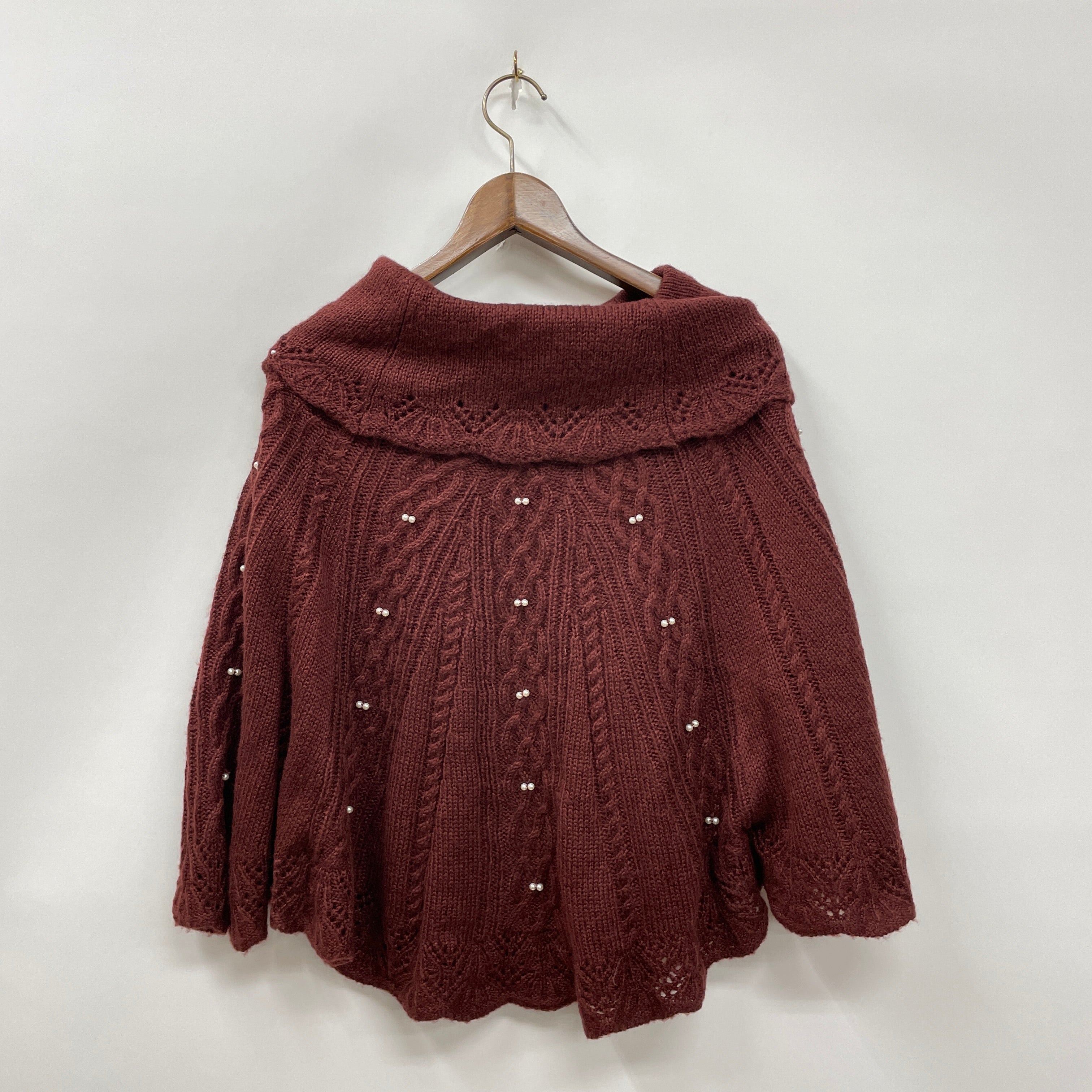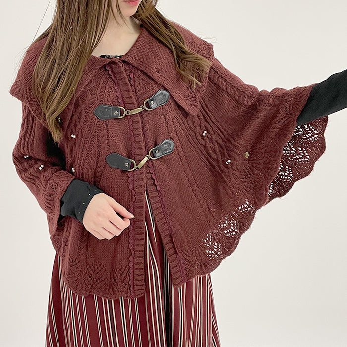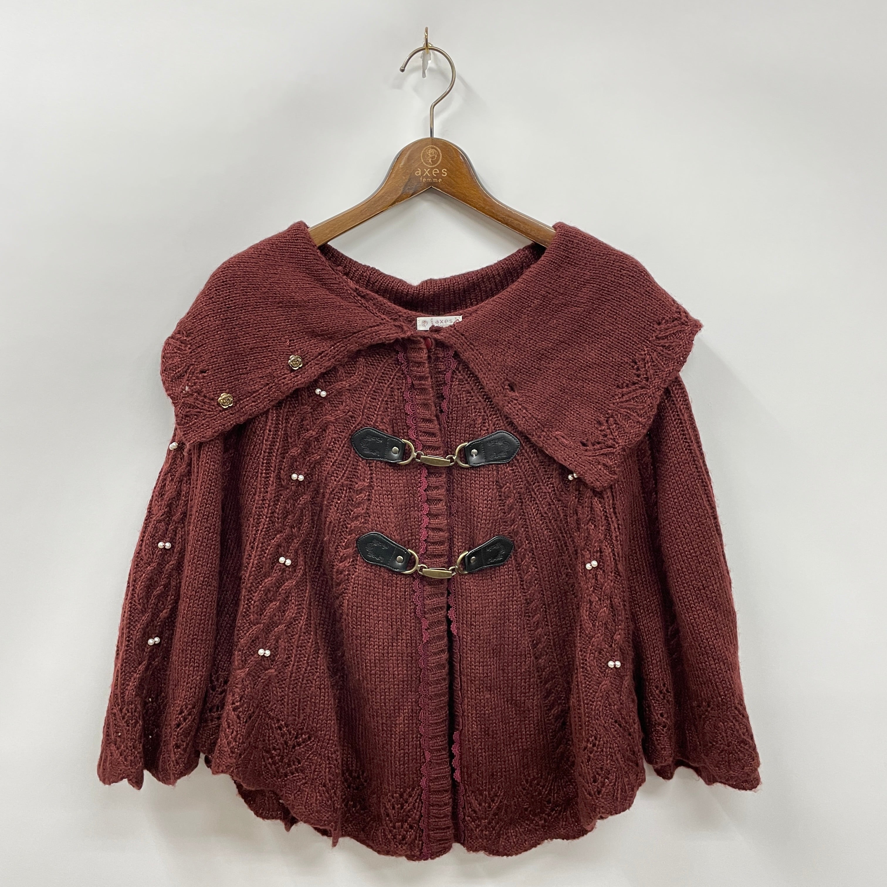 首元まで暖かいオフタートルデザインのニットポンチョ。ふわりと羽織れて中に着る洋服を選びません。裾にボタンがついていて留めることも可能。編地に手付けされたパールは背面にまで施されており360度どこからみても可愛いアイテム。ビットデザインの合皮パーツにはバラデザインがかた押しされ細部までaxesfemmeらしいデザインに。