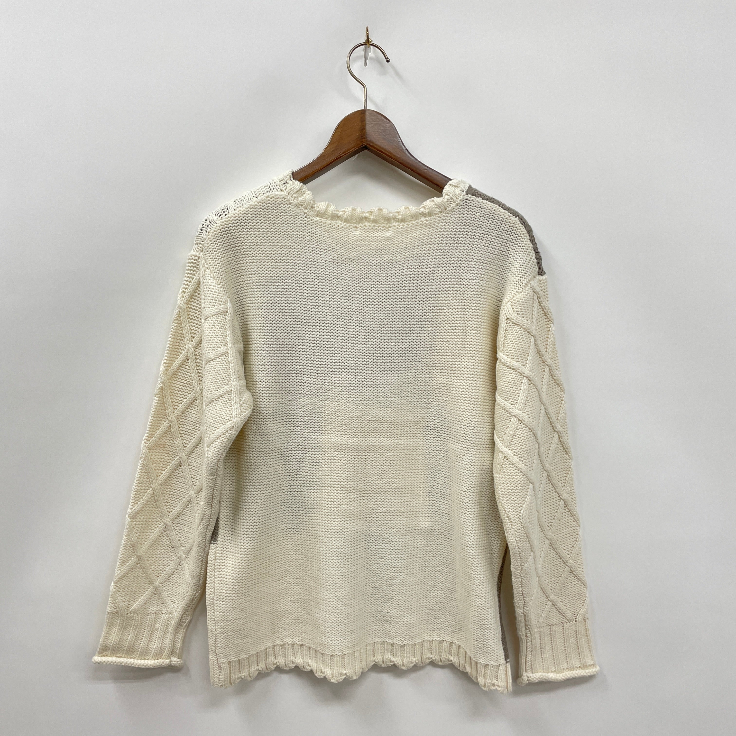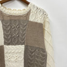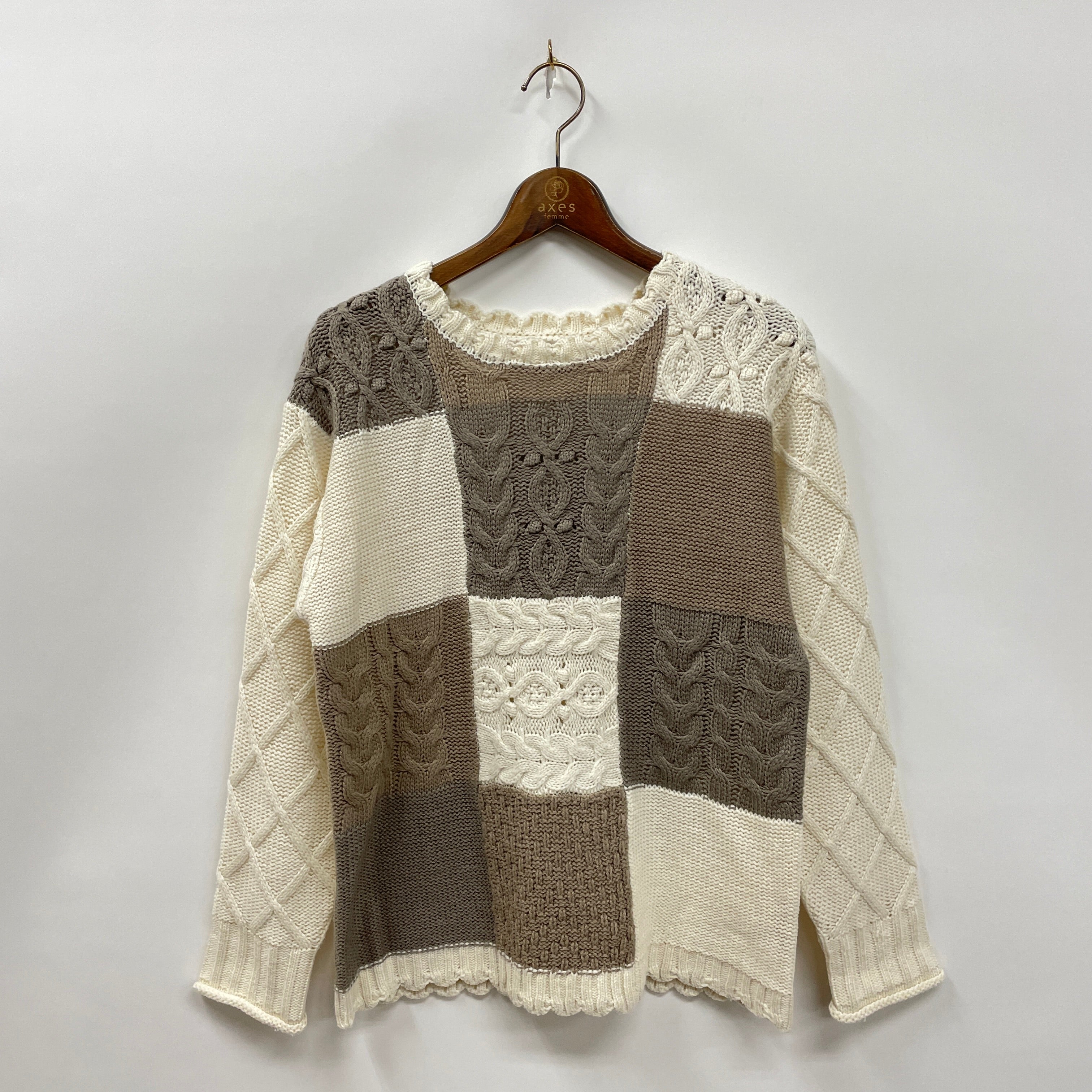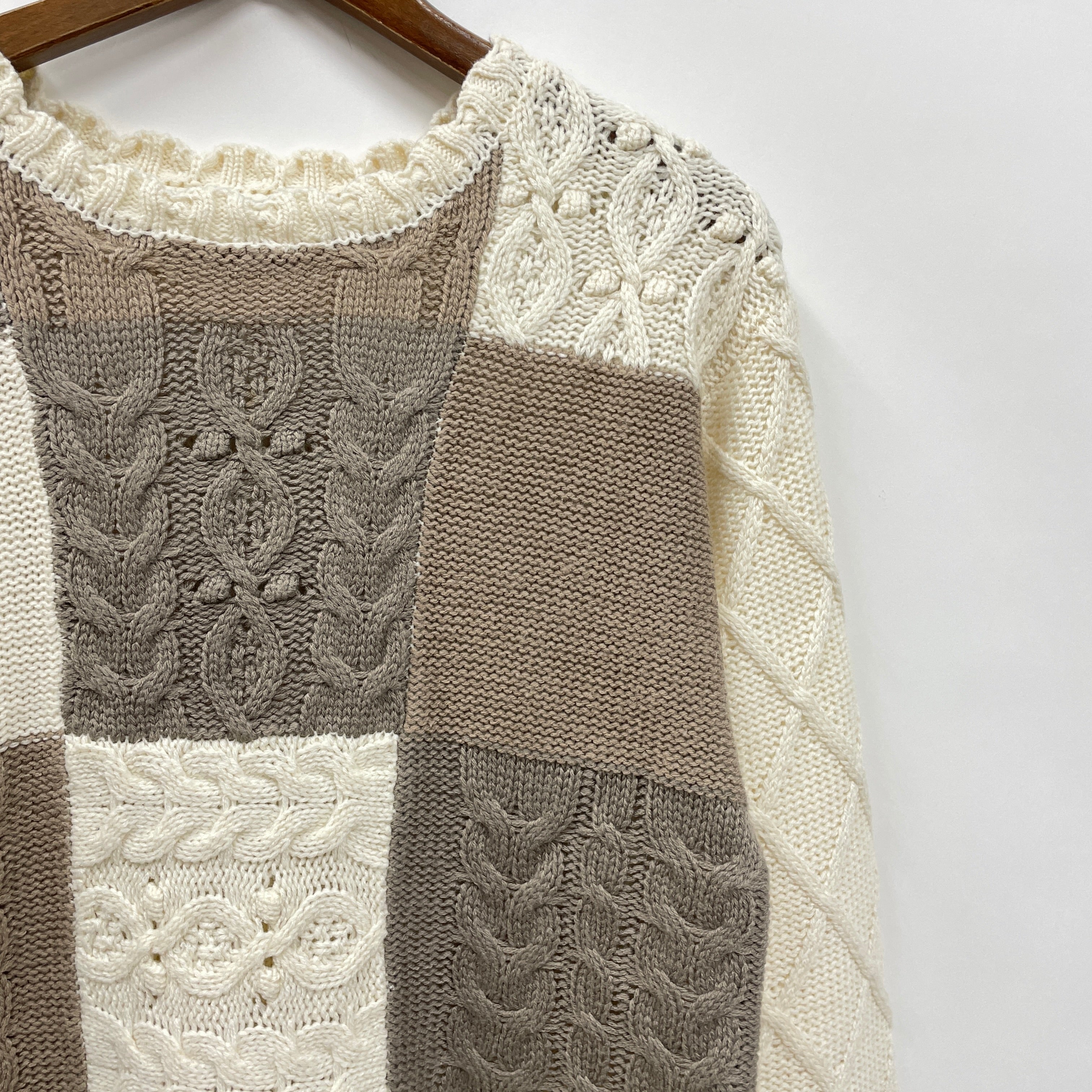 さまざまなケーブルデザインと色を組み合わせたパッチワークデザインのニット。