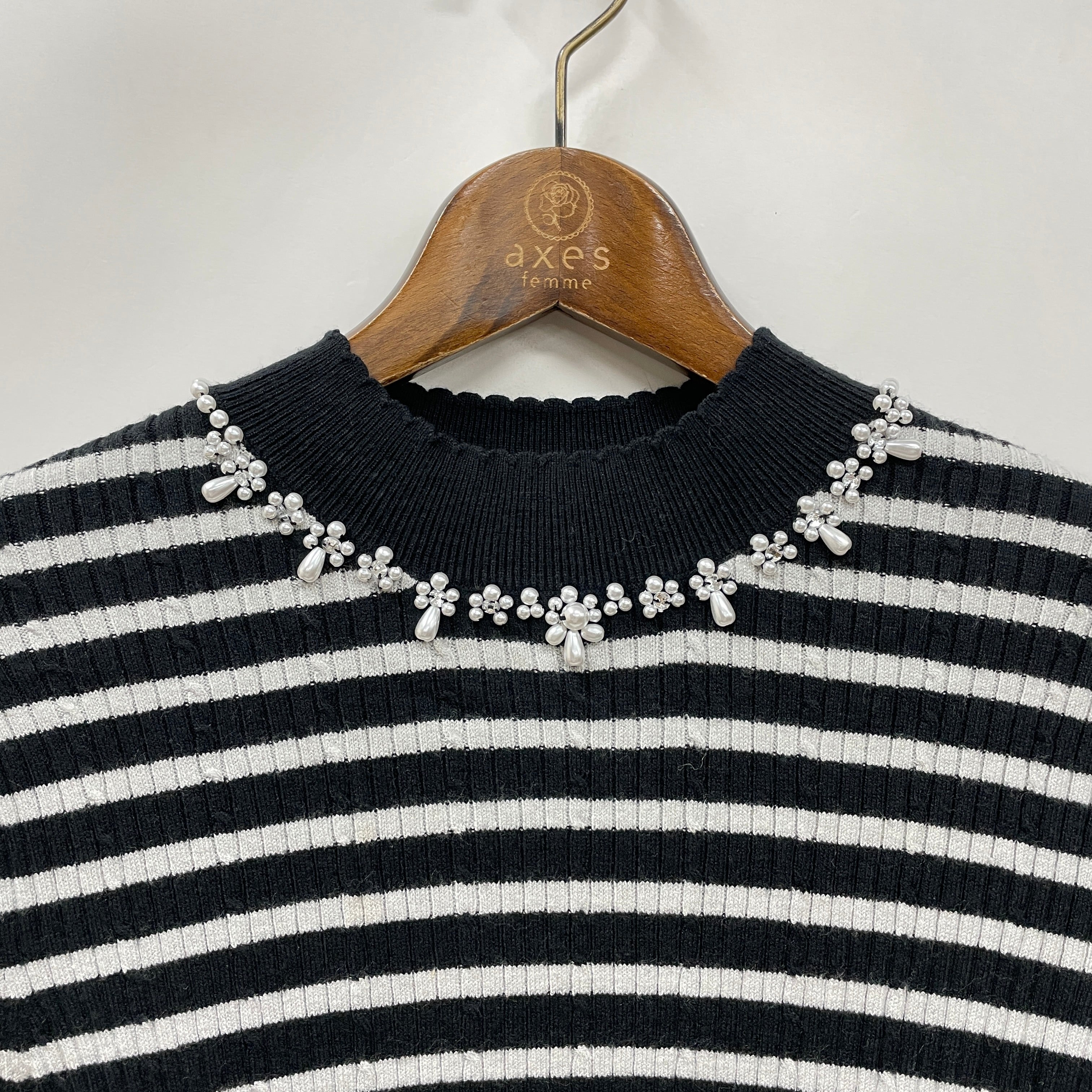 スタンドデザインで着まわしのきくニットトップスです。ネックレスのように並んだ胸元のパールが華やかな1枚。リブとケーブル編みが組み合わさった縦柄が細見え効果もあり嬉しいポイントです。着心地のよいもちもち素材のニットで手触りも◎エレガンスにもカジュアルにも着まわせる万能アイテムです。