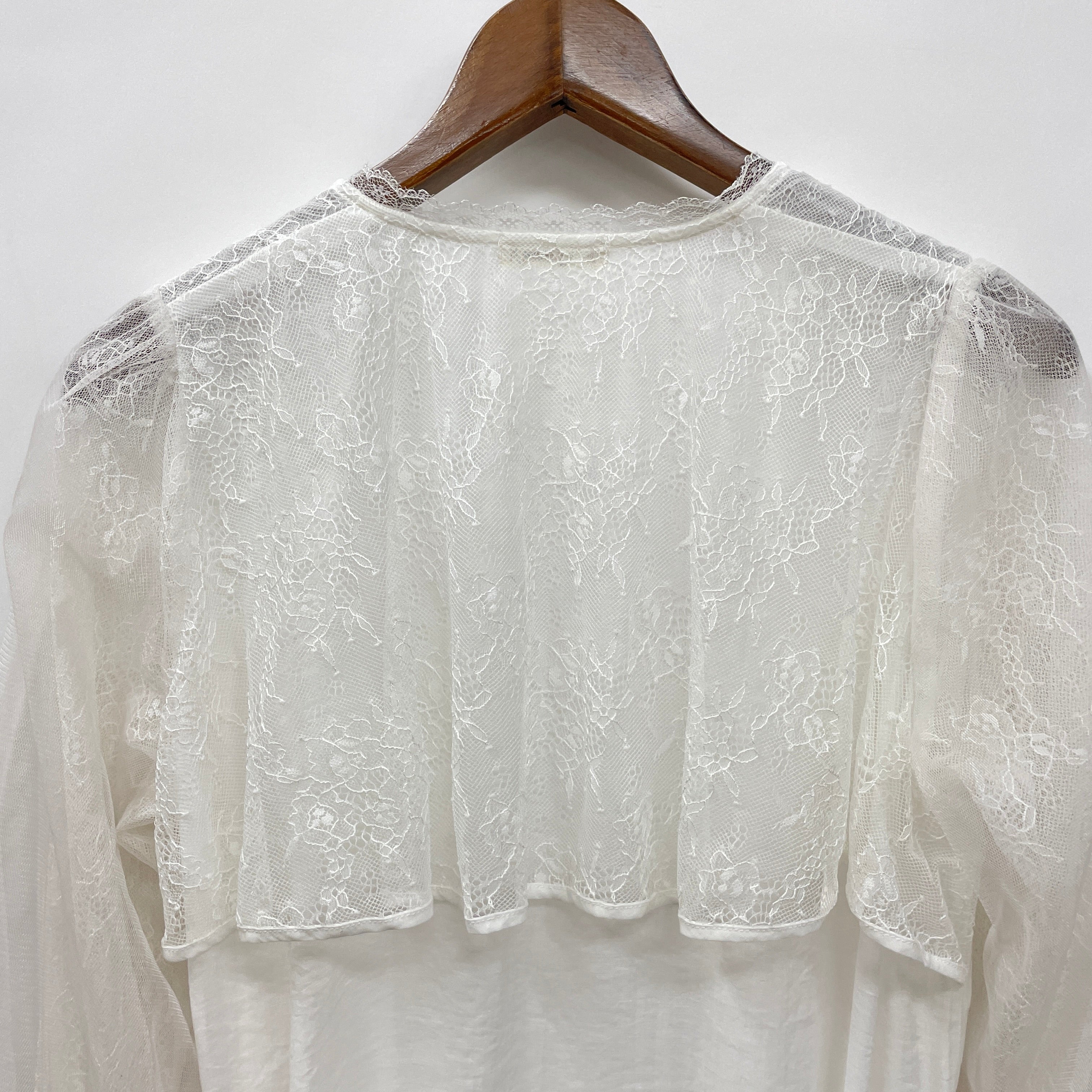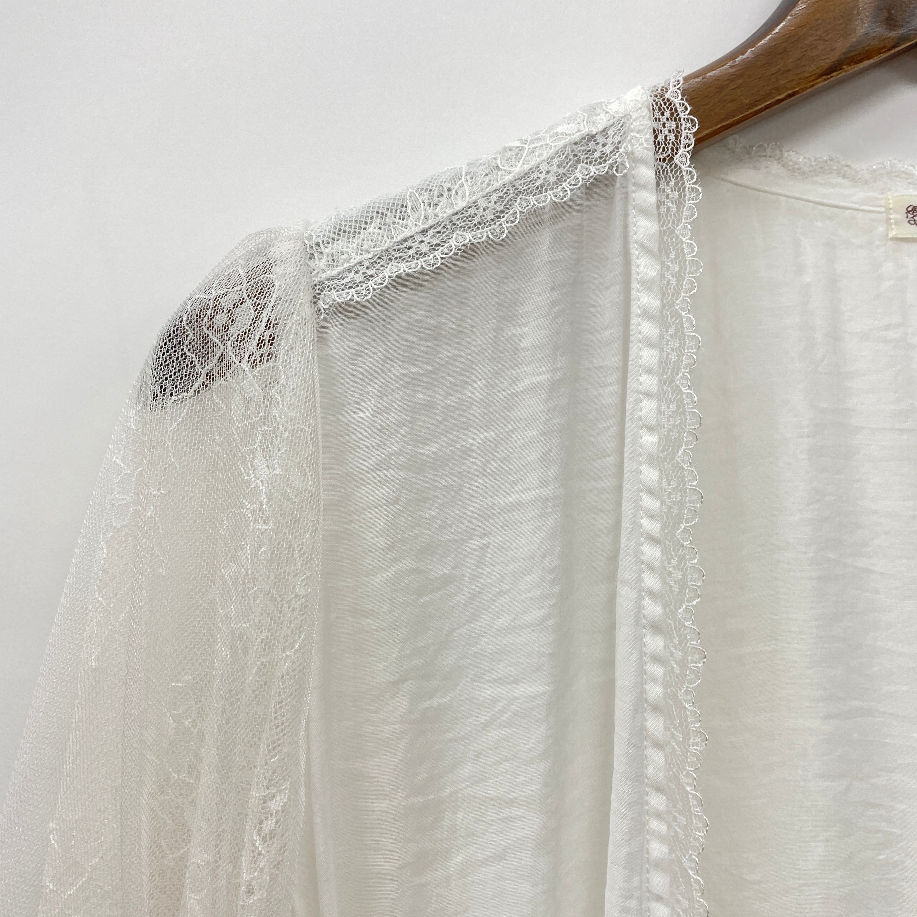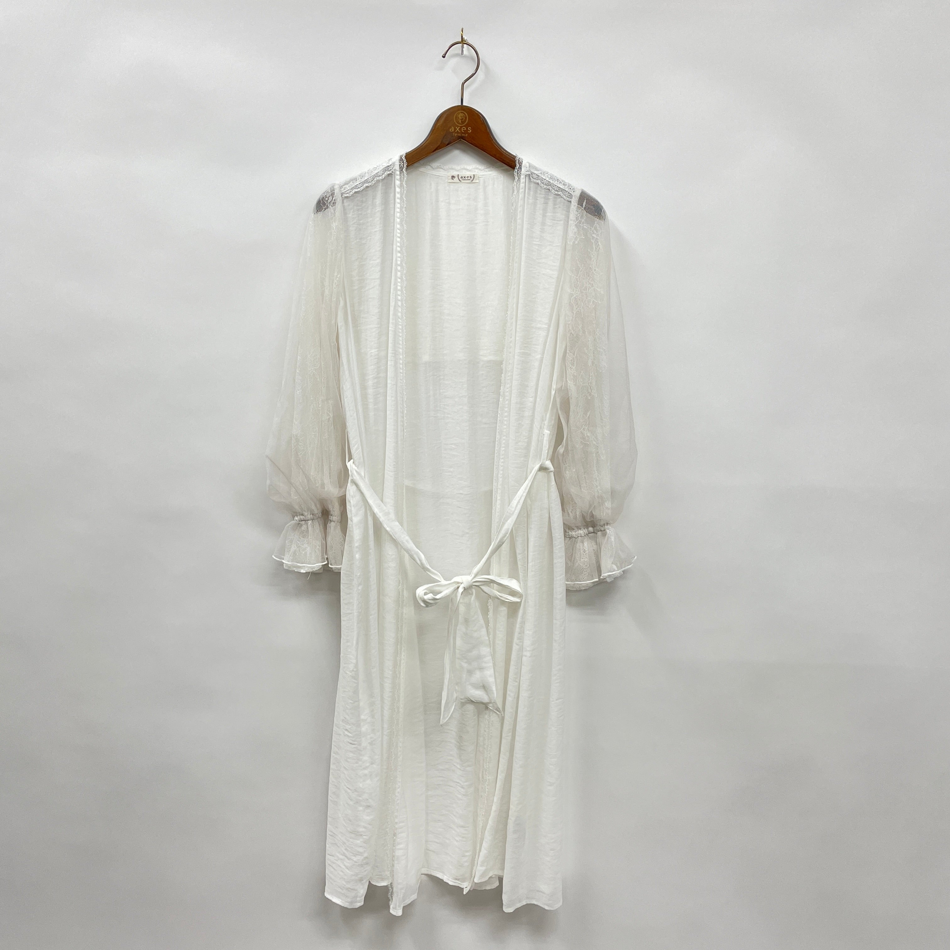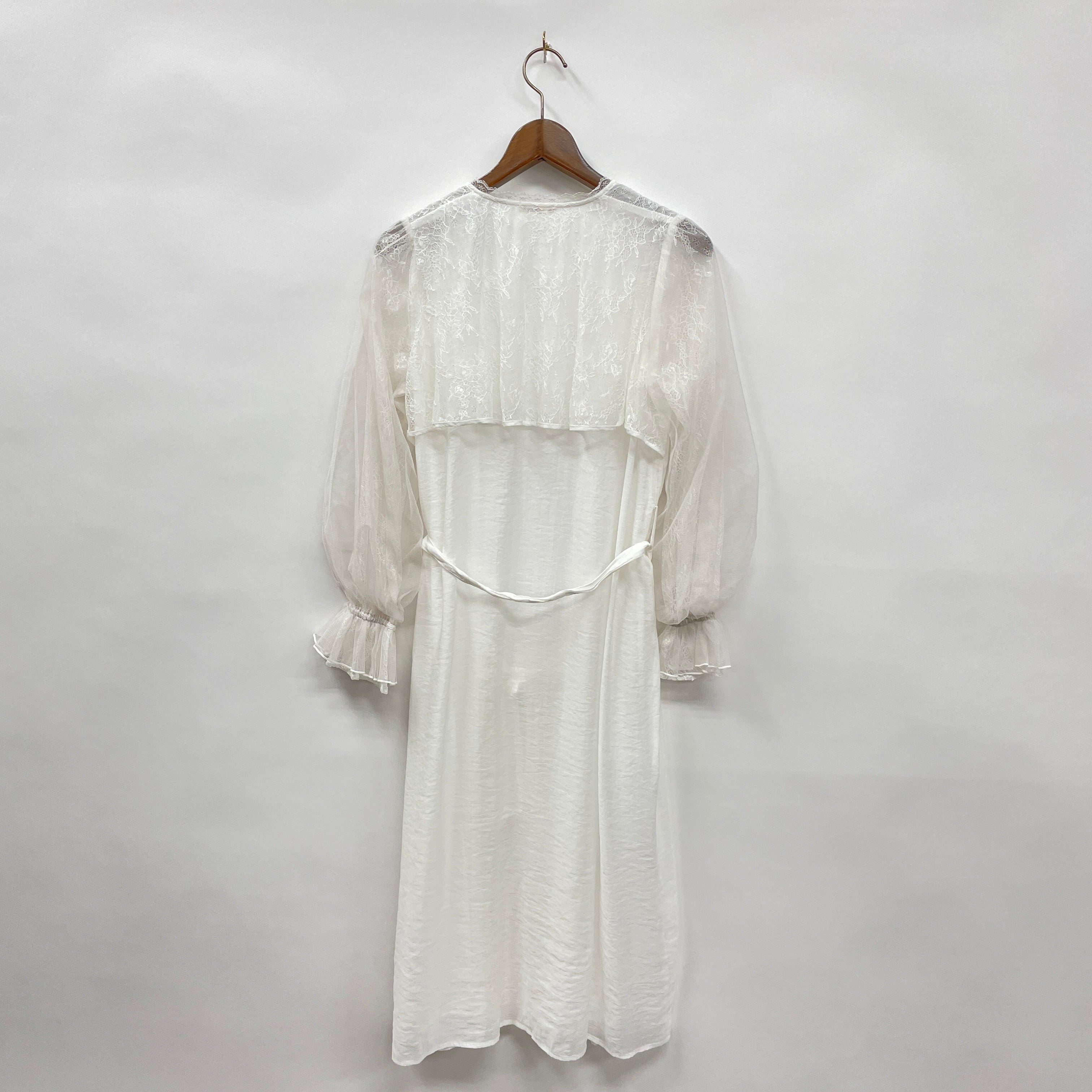 さらっと着られるロングガウン。レース×チュールの袖はボリューミーでぽわんとしたシルエットがポイント。微光沢ある素材は手触りがよくカジュアルスタイル、フェミニンスタイル問わず合わせやすいです。