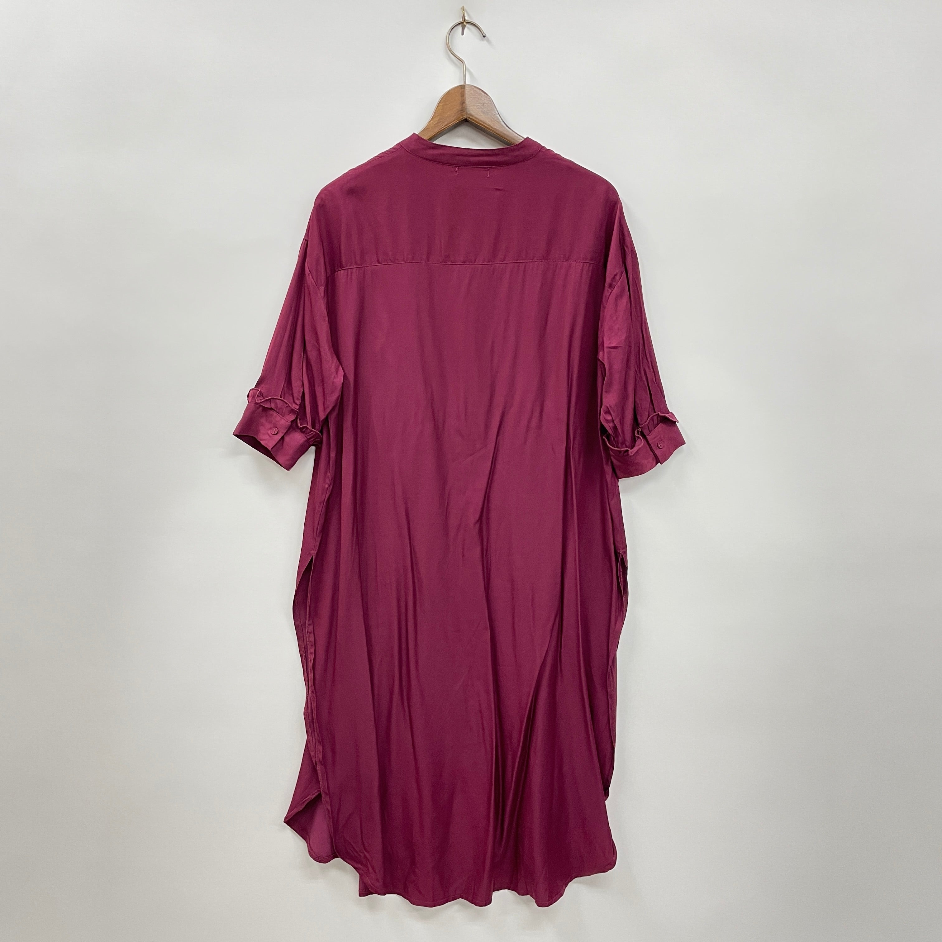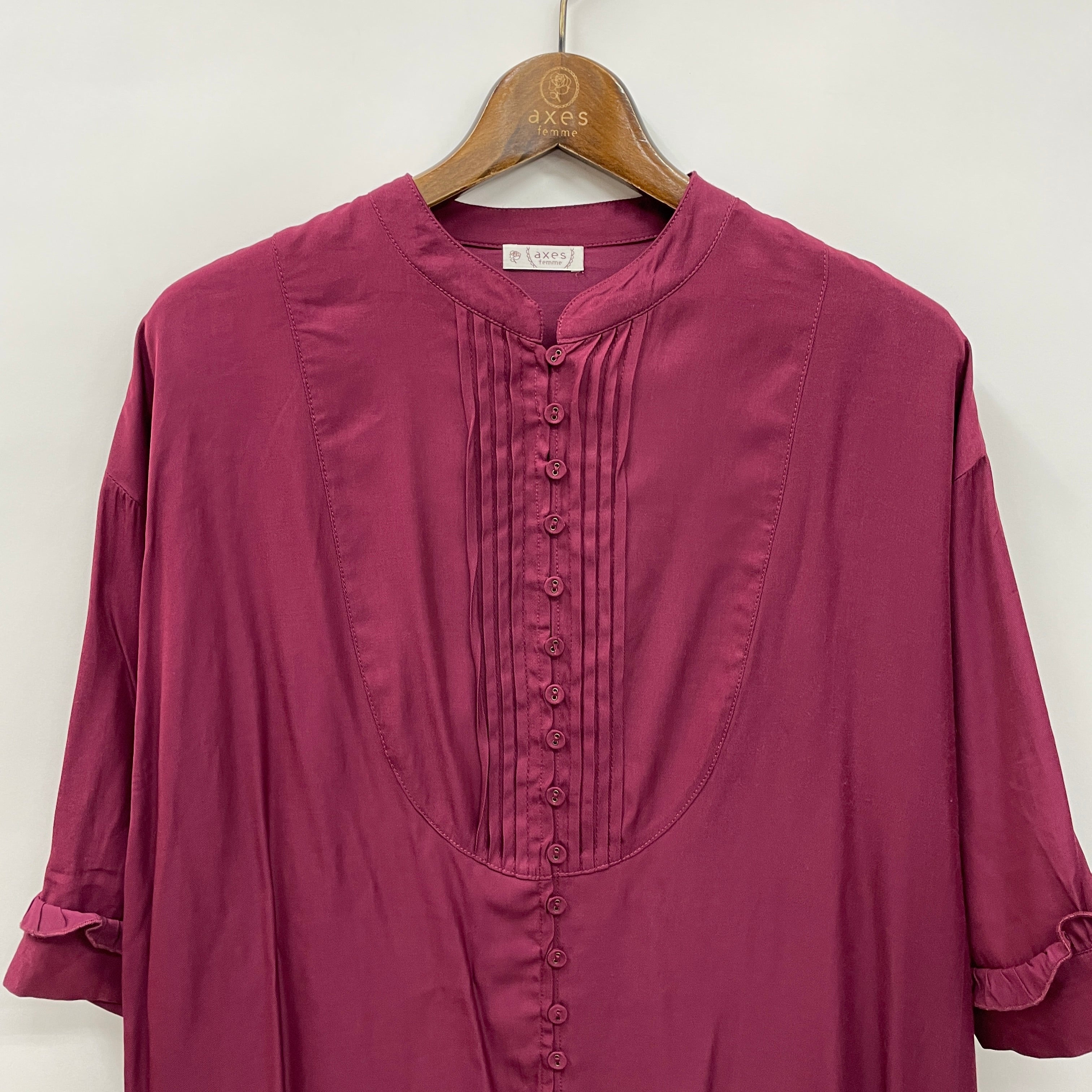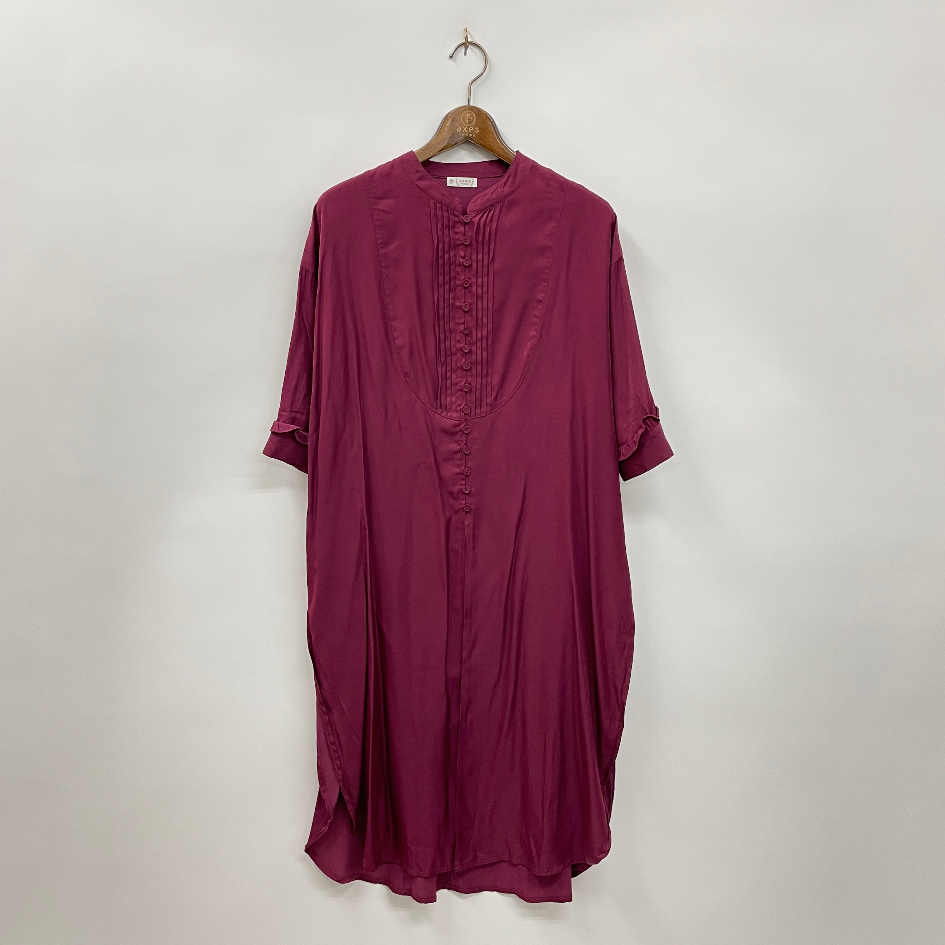 丸みのあるバンドカラーや、フロントのピンタック、袖口のフリルなど、シンプルな形の中にさりげなく女性らしいディテールが施されています。