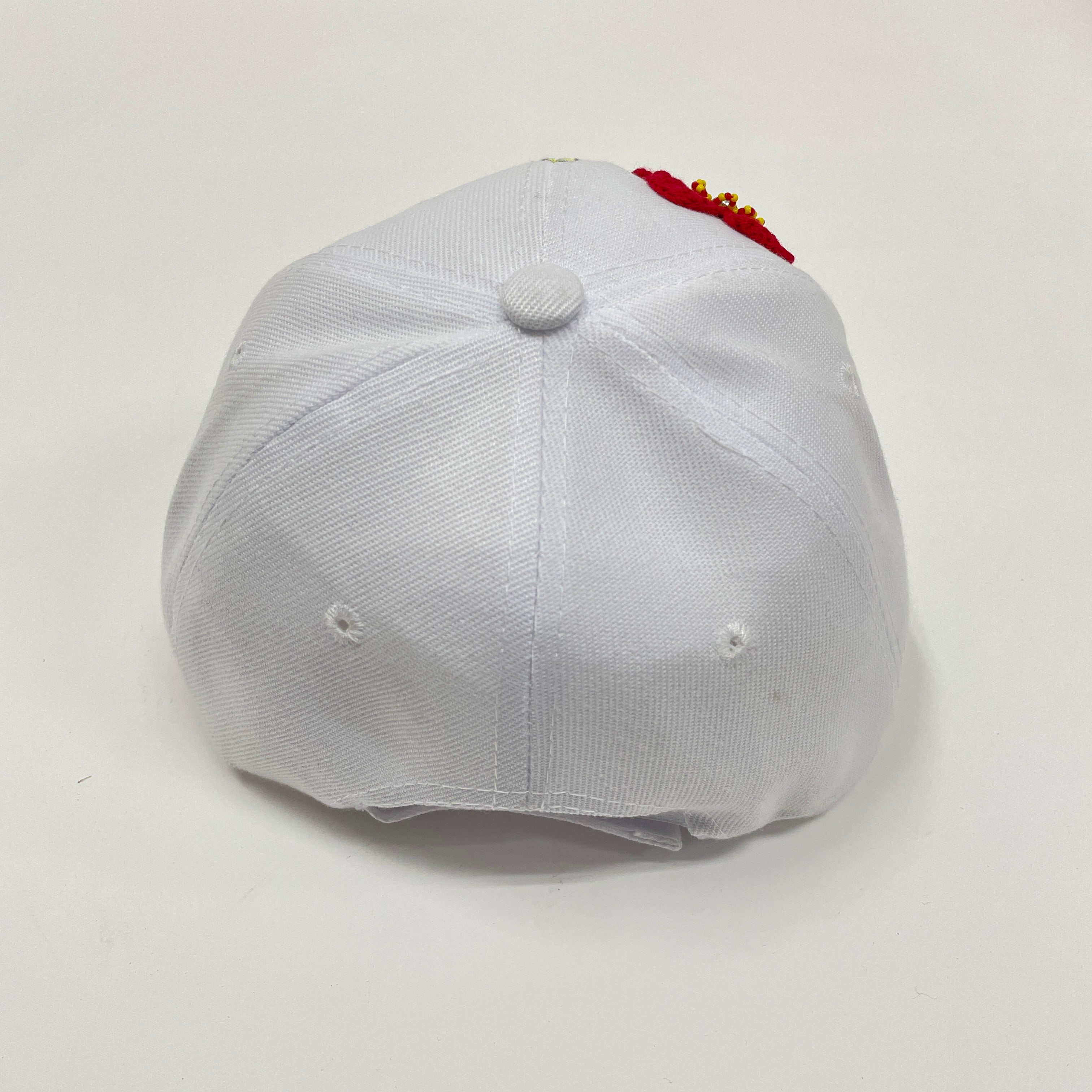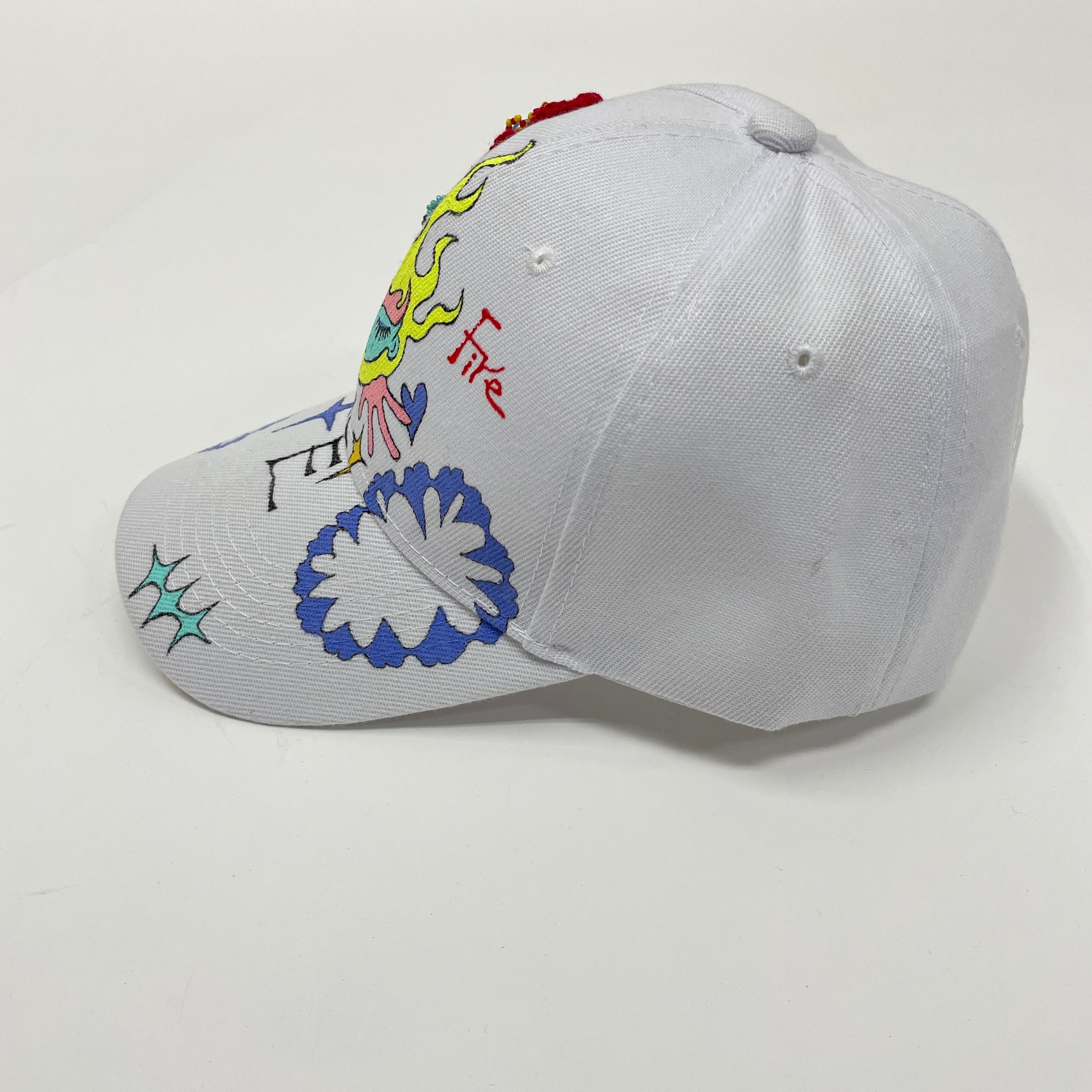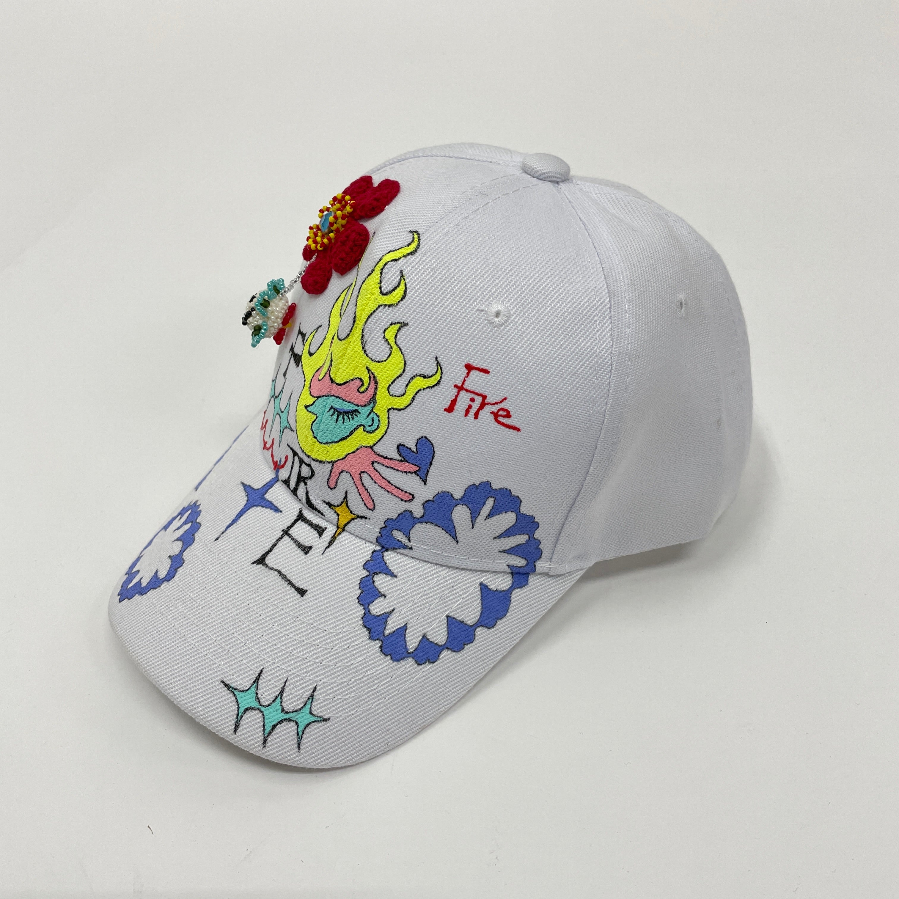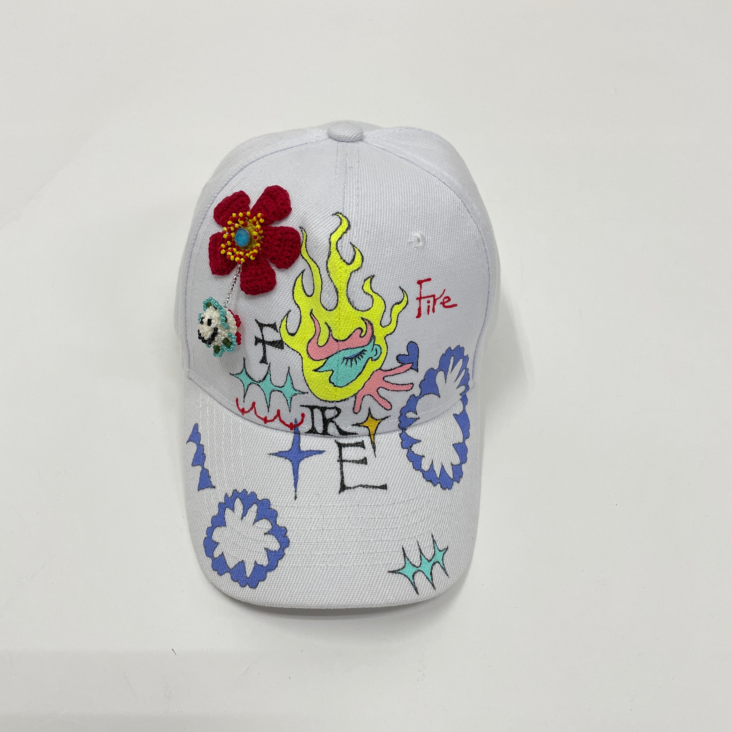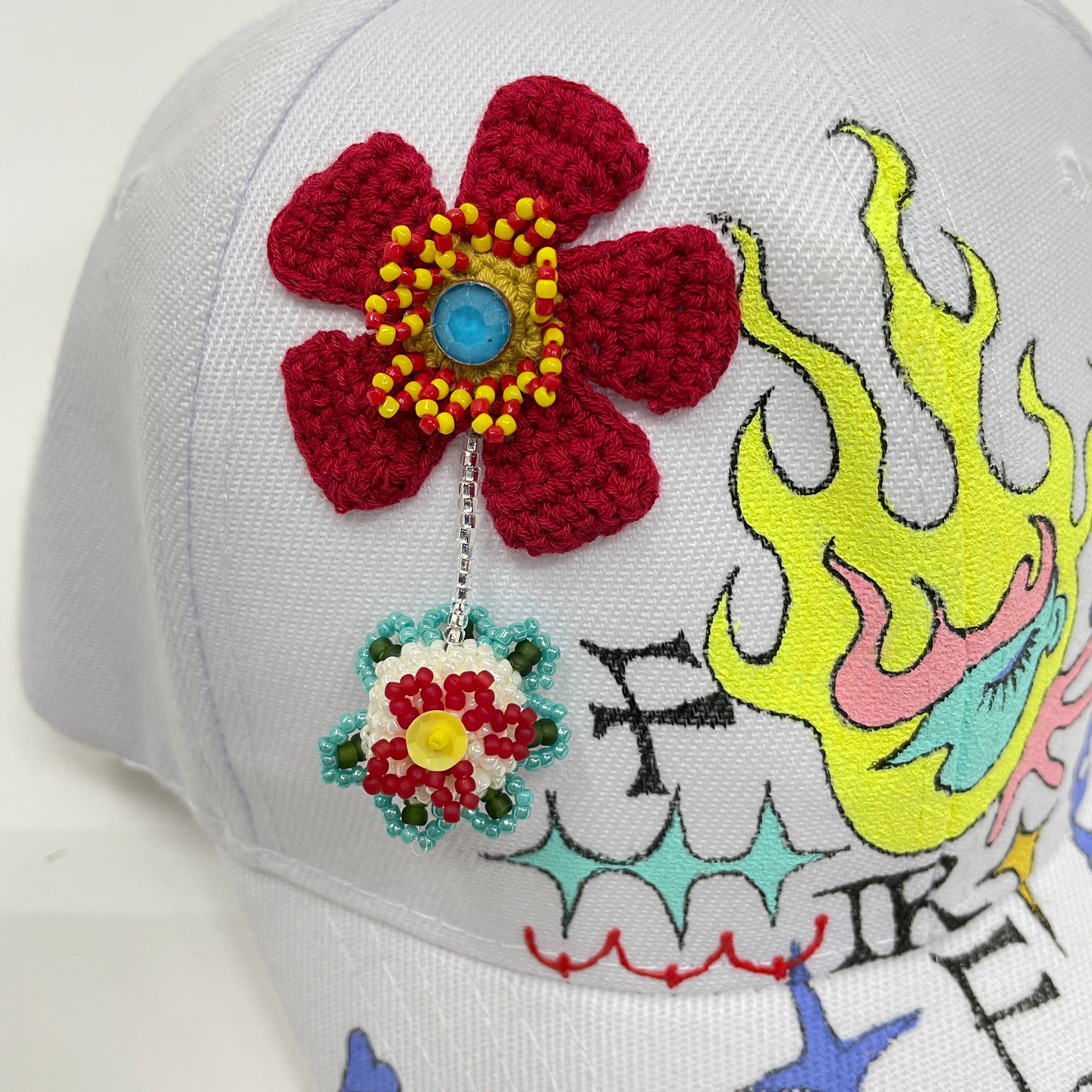 axesfemme 25SS販売のロゴ刺繍バックリボンCAPのカラー展開を決めるときに使用したカラーサンプルに、手書きのペイントとクリエータオリジナルのアップリケを施し独特の世界観を表現。