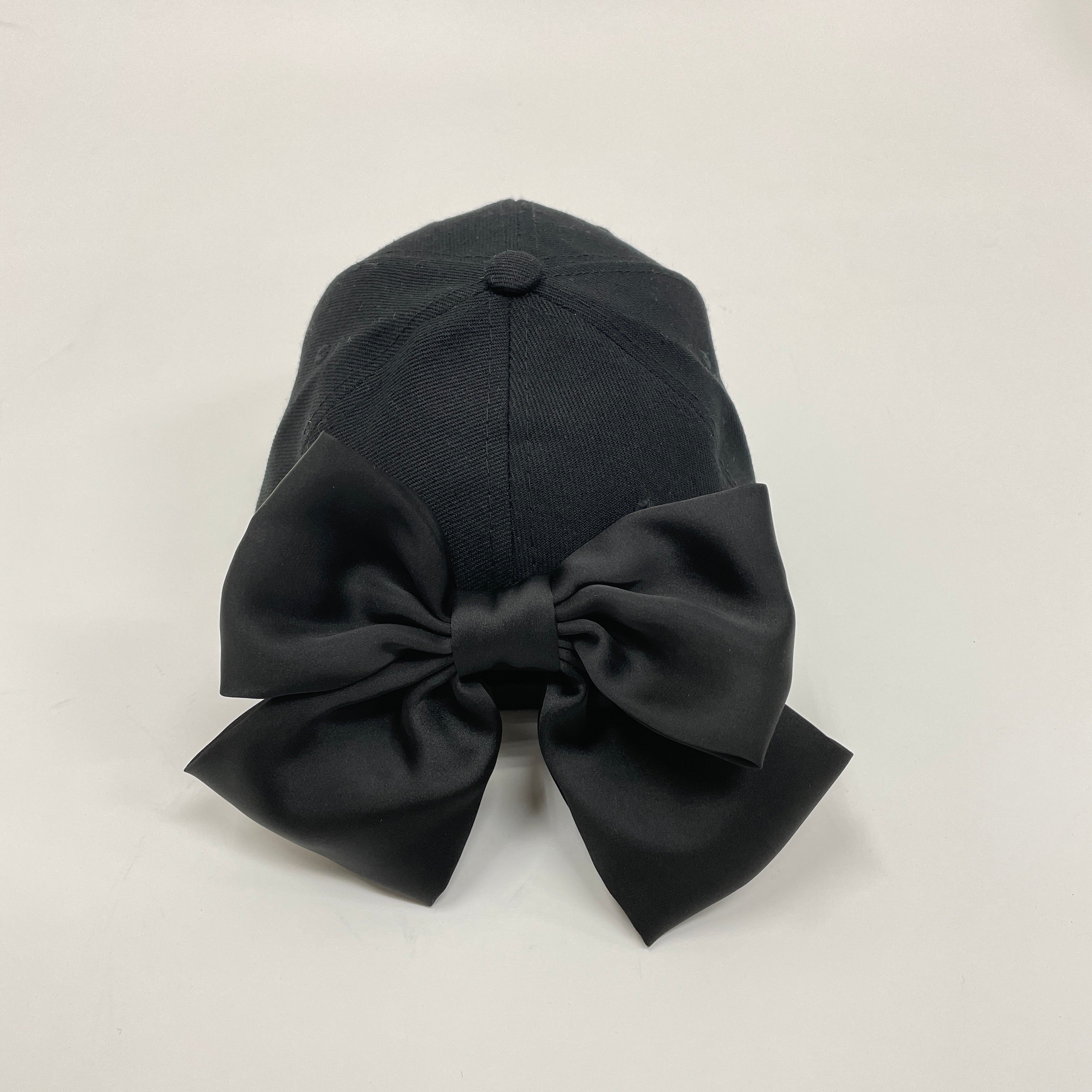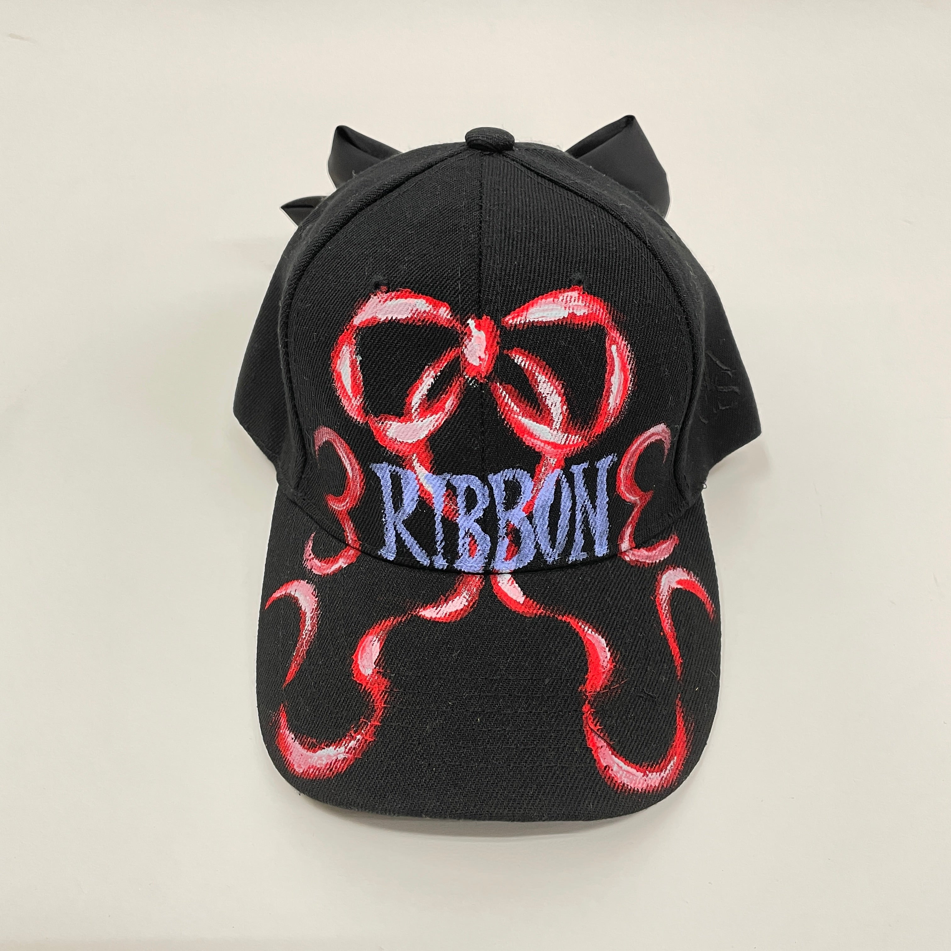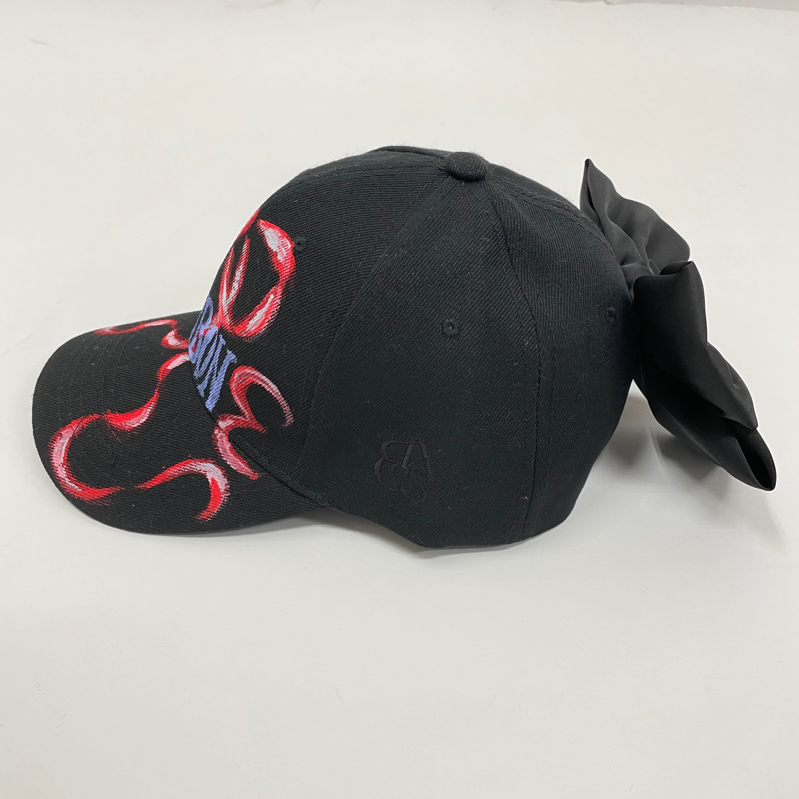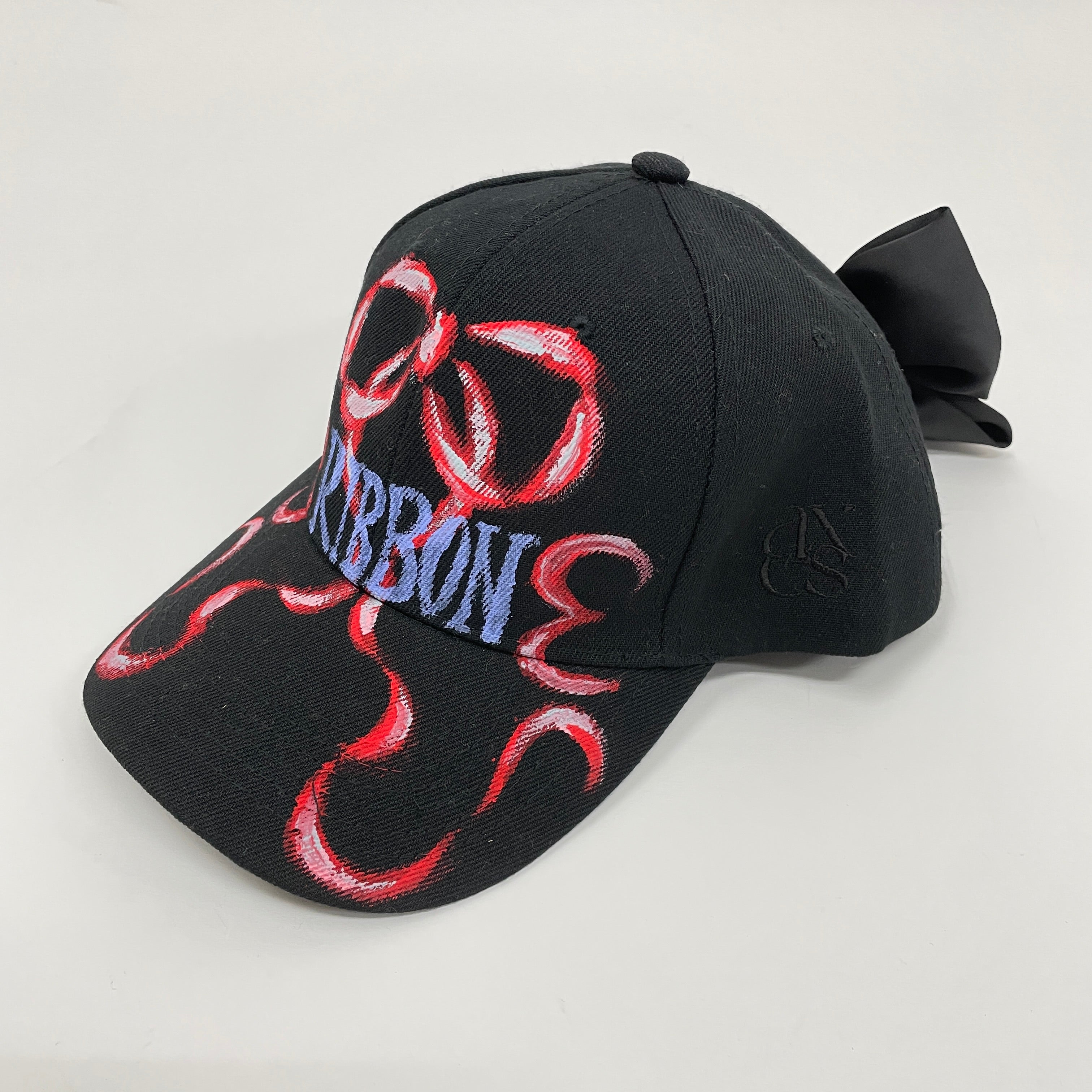 axesfemme 25SS販売のロゴ刺繍バックリボンCAPの1stサンプルにクリエーターオリジナルの手書きペイントを施し、独特の世界観を表現しています。