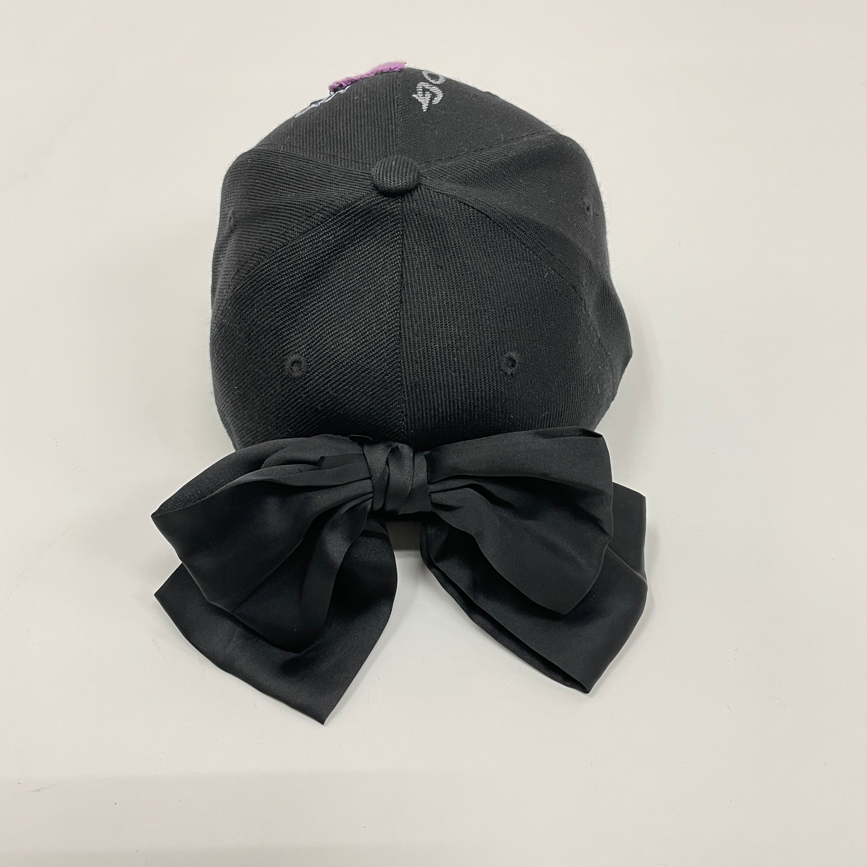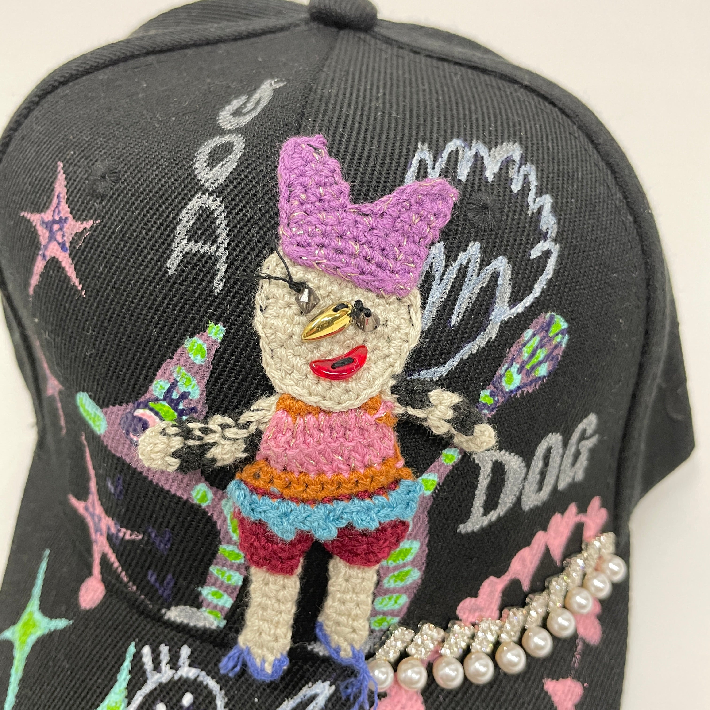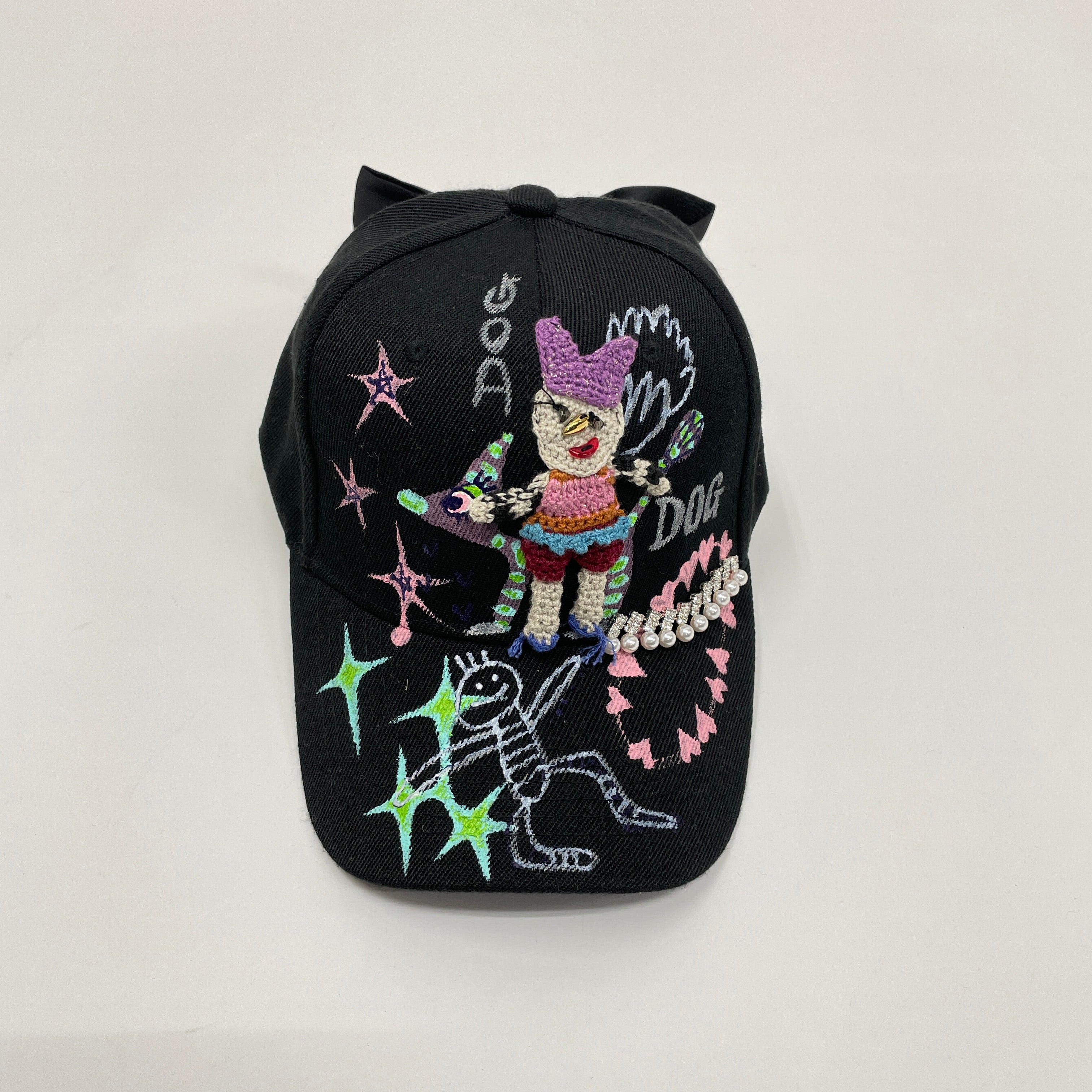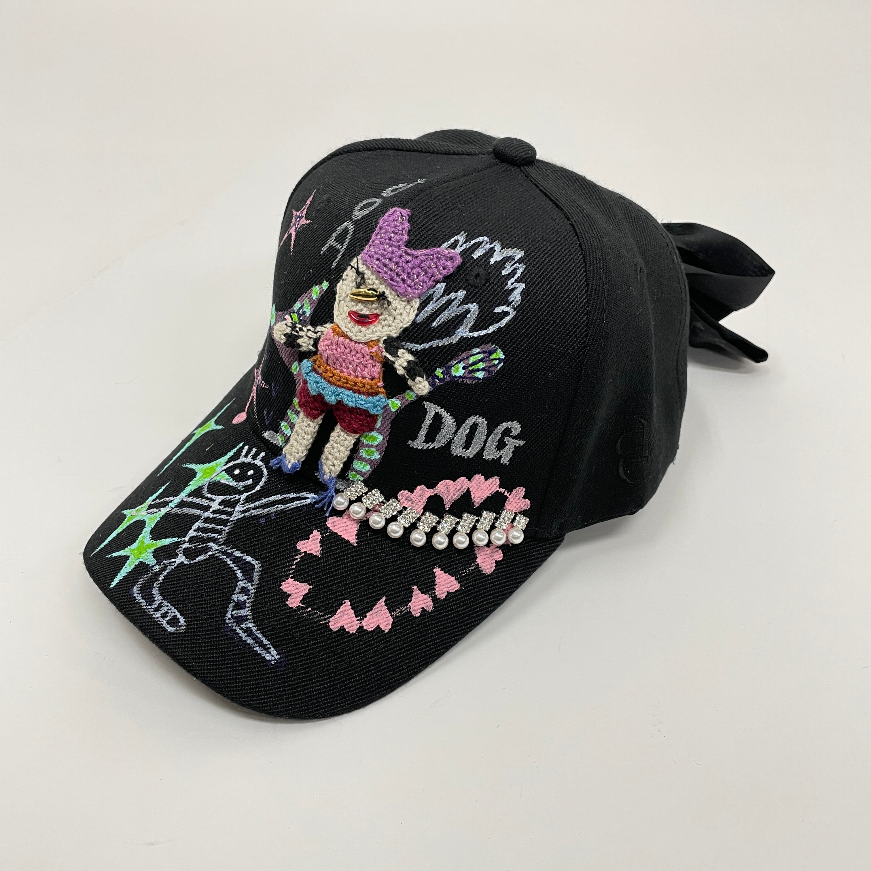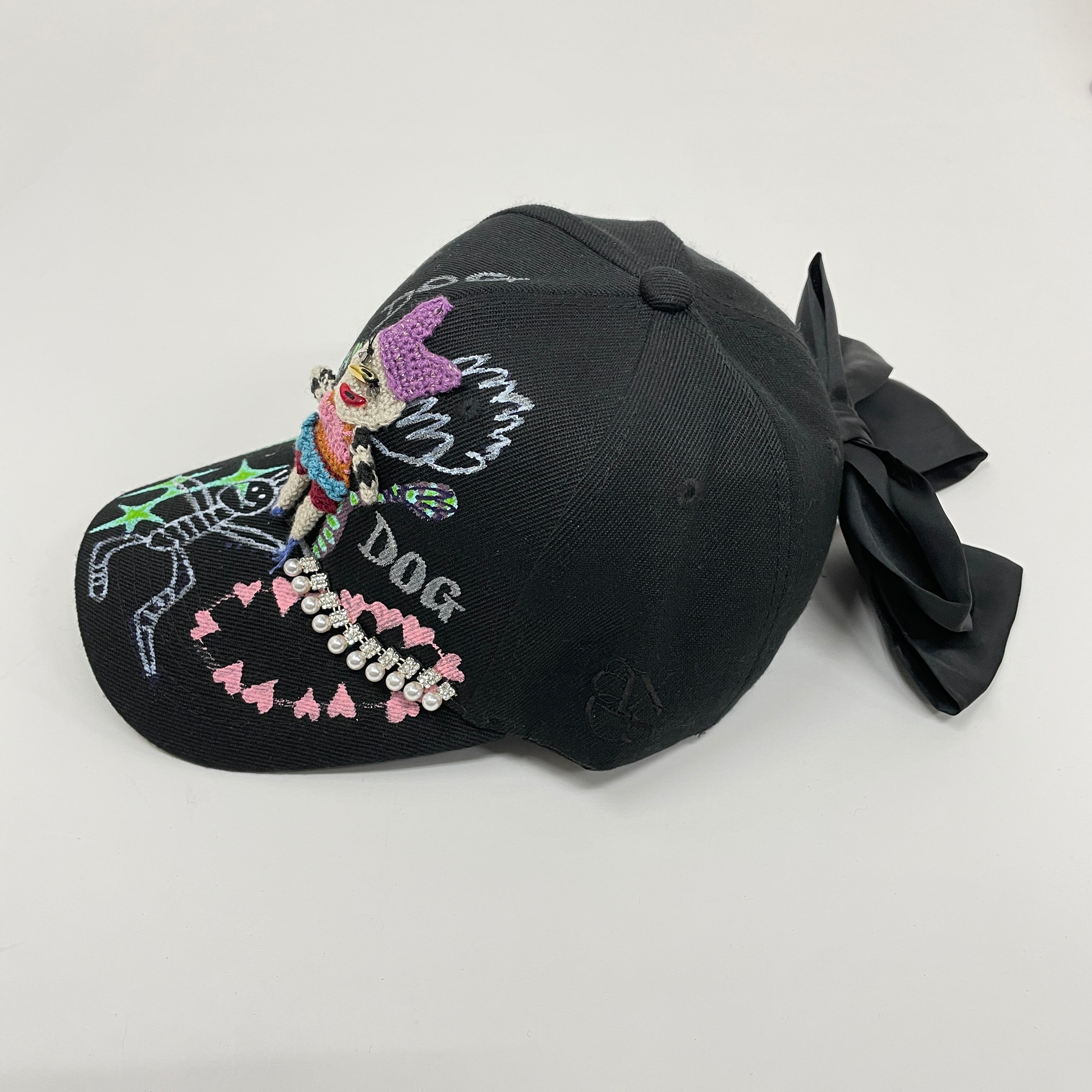 axesfemme 25SS販売のロゴ刺繍バックリボンCAPの1stサンプルに手書きのペイントとクリエーターオリジナルのアップリケを施し独特の世界観を表現。