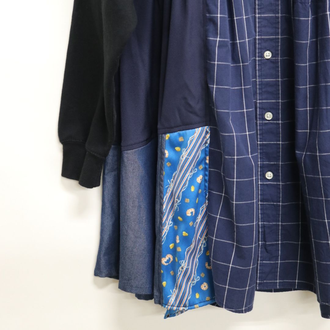 肩のフリルがかわいいリメイクワンピースです。ひざ丈なのでチュニックとしても