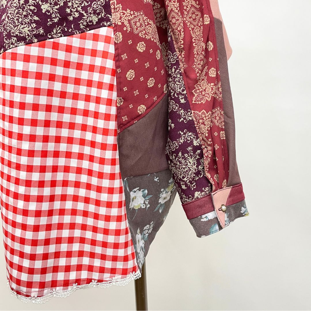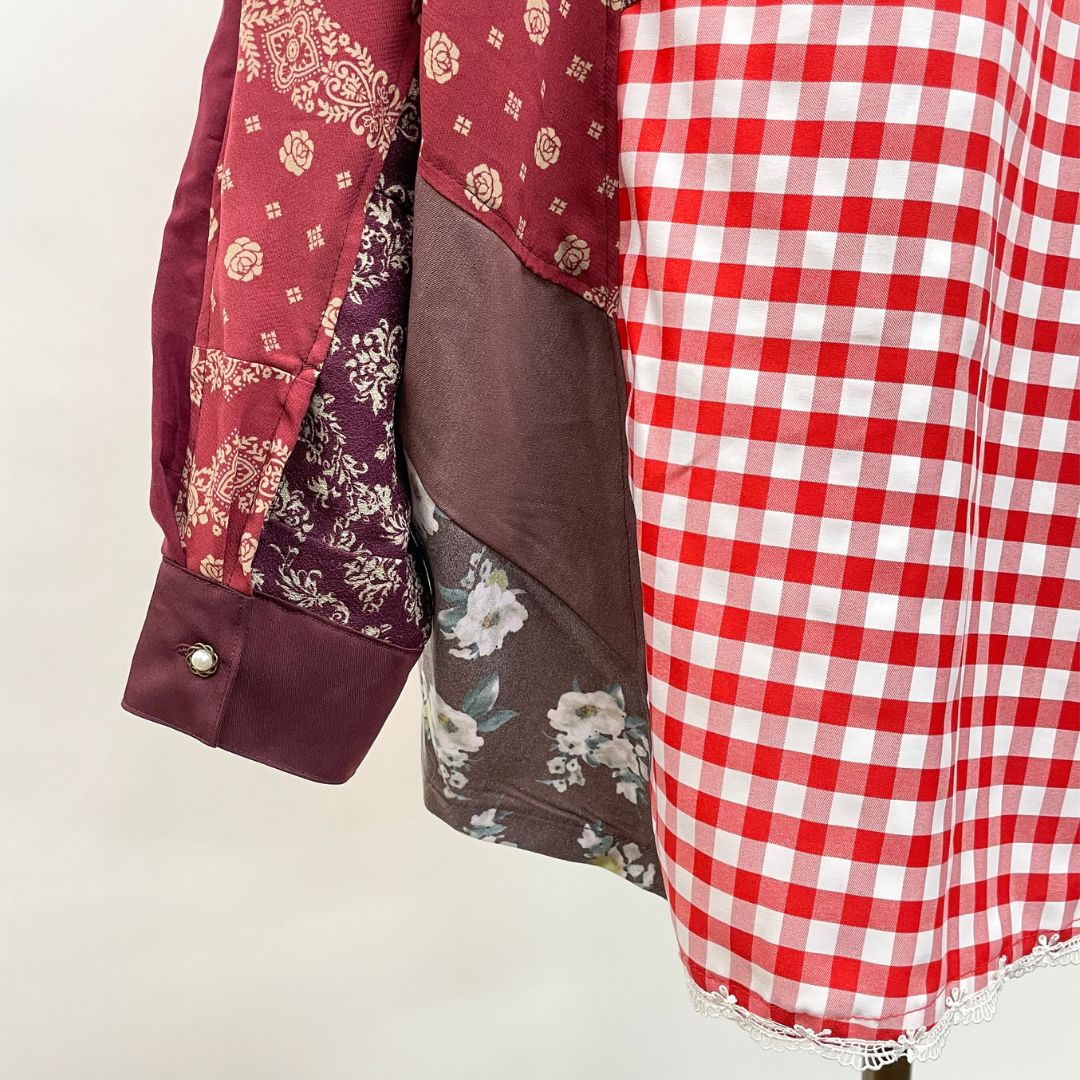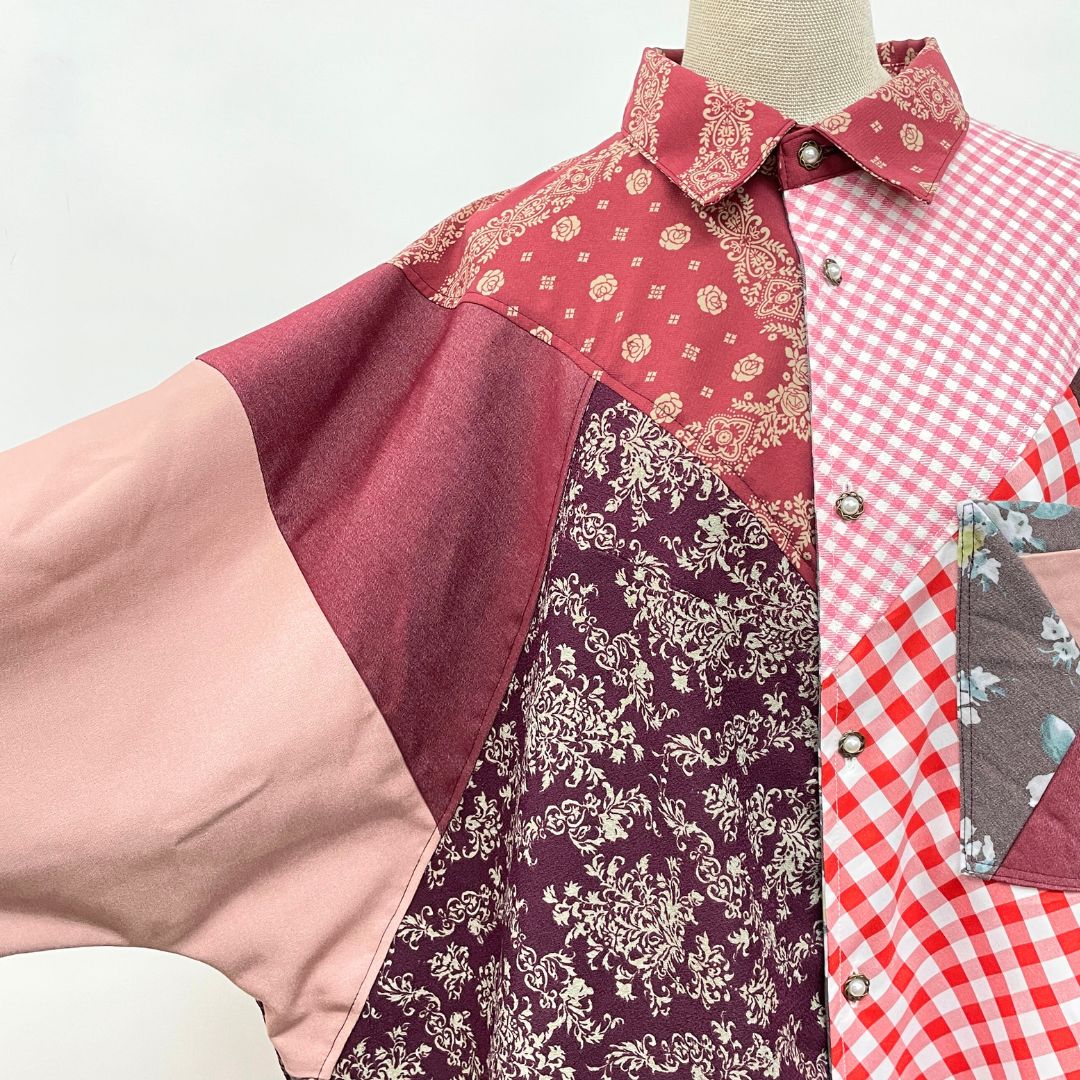 Re:make ドルマンスリーブパッチワークシャツ PINK×BORDEAUX
