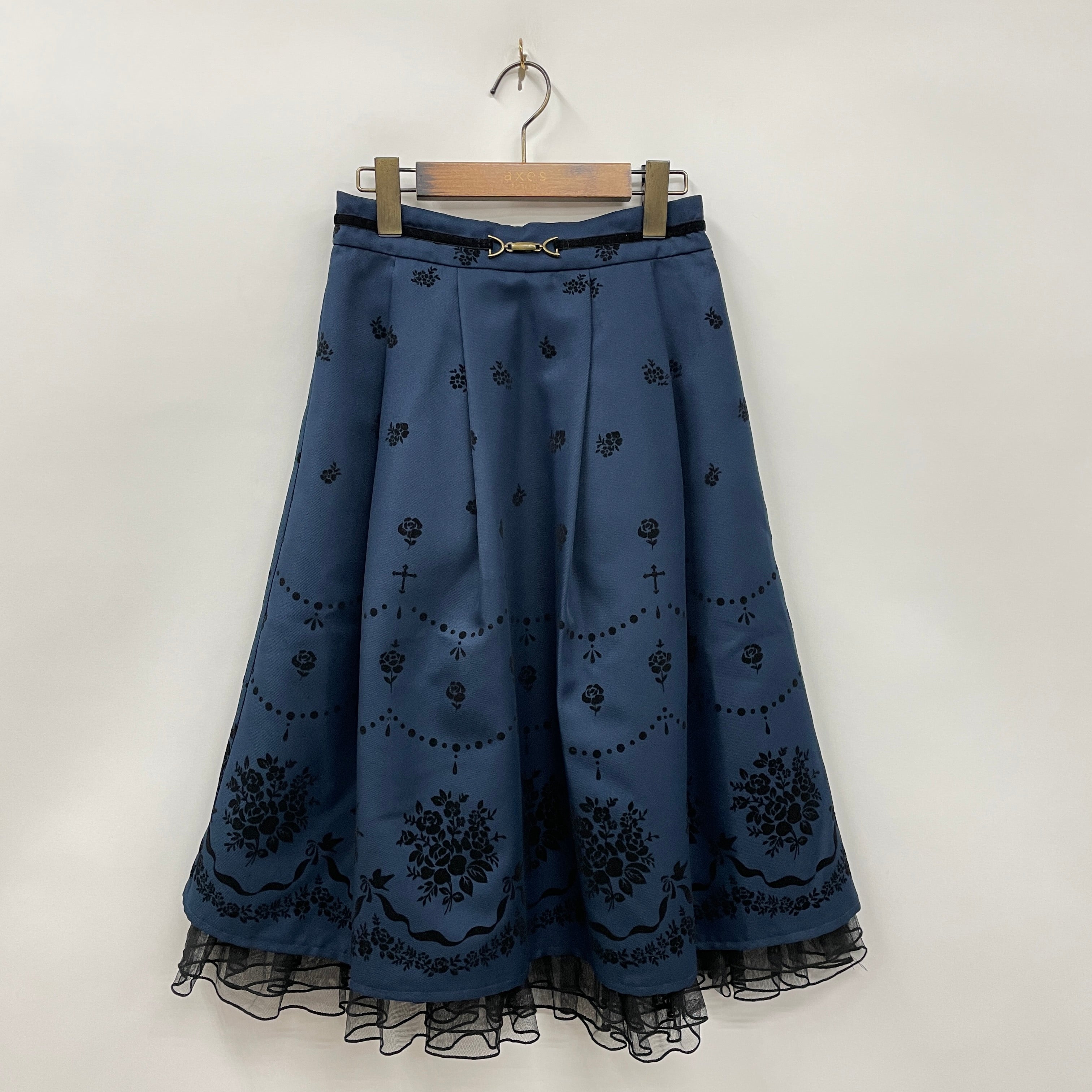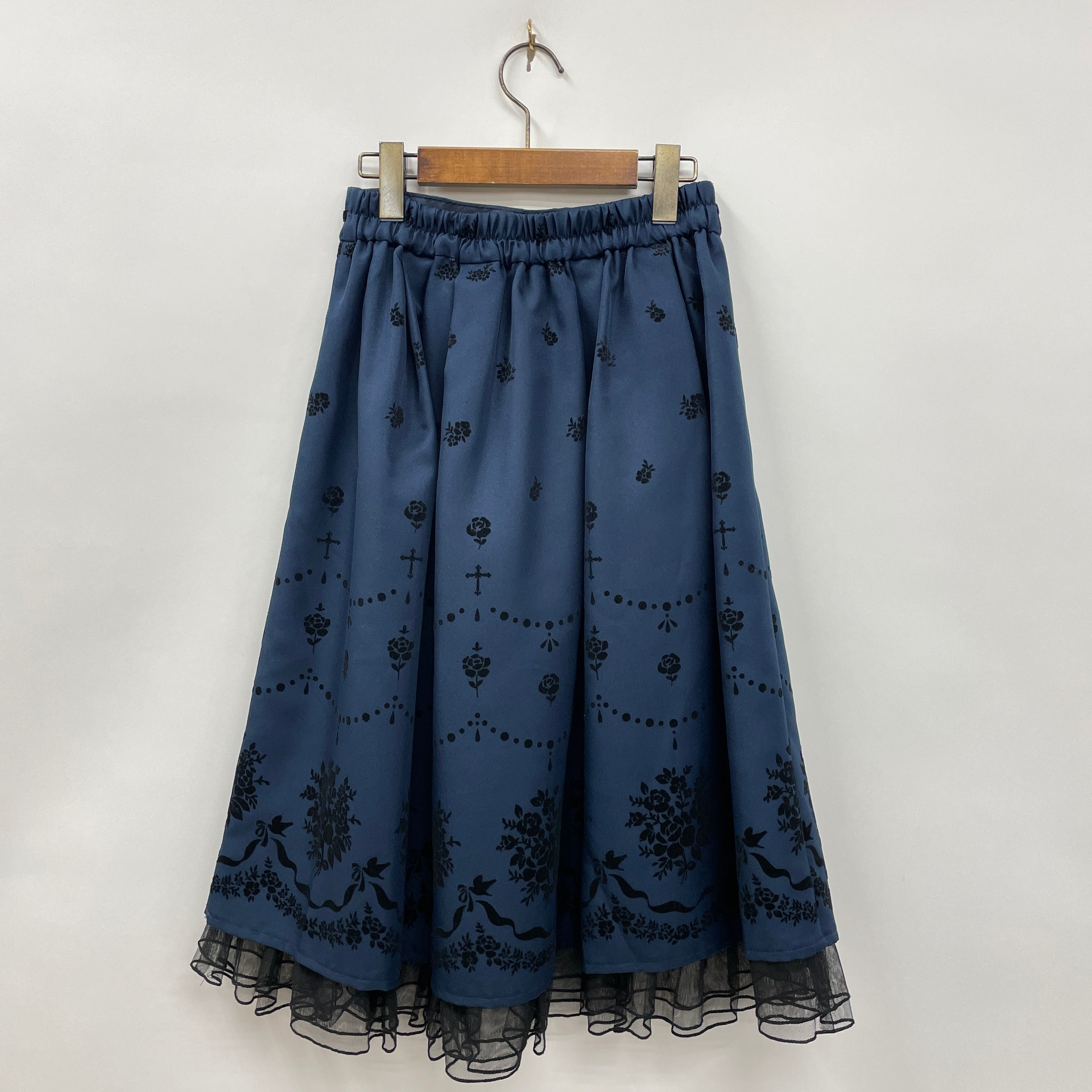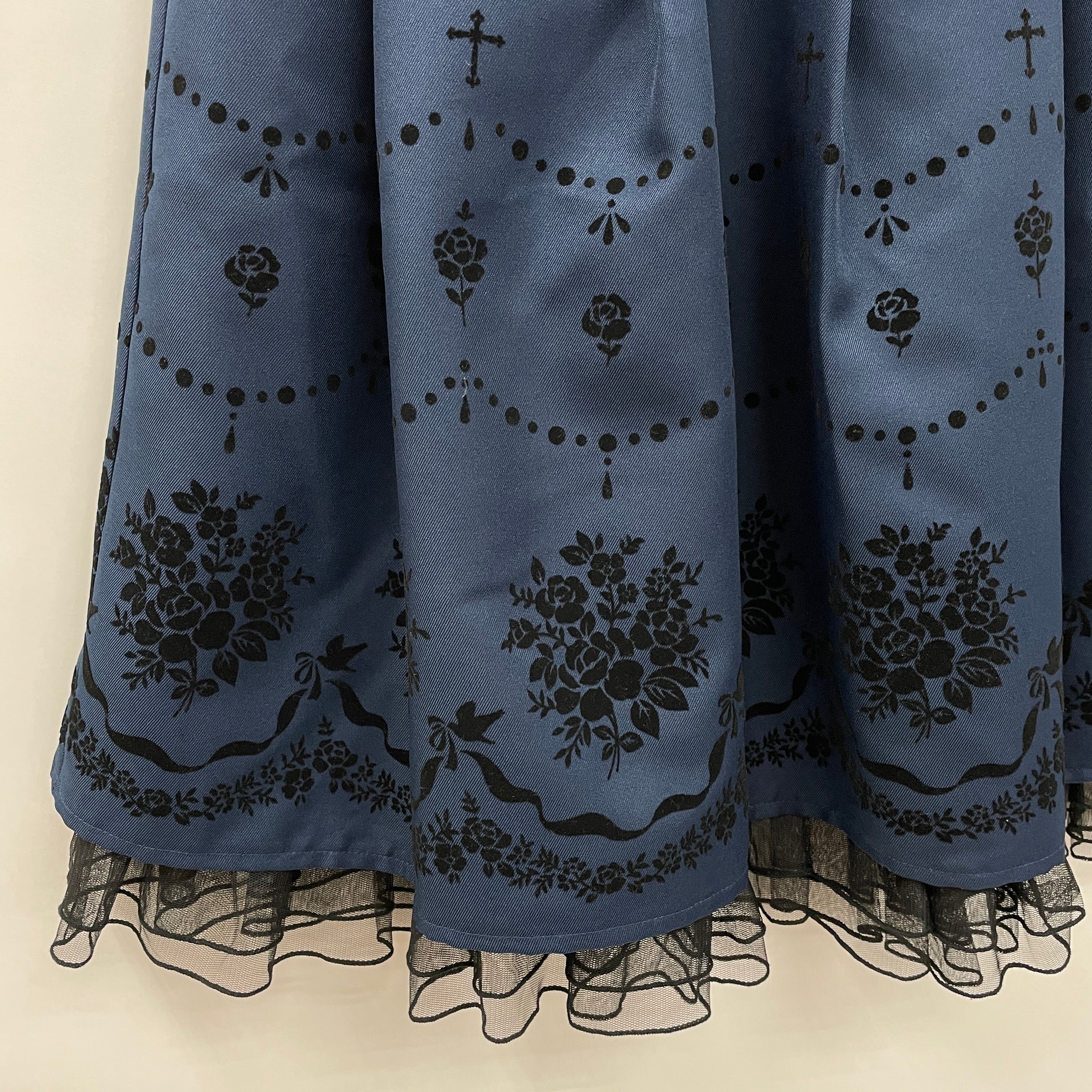 華やかなブーケにスカラップのようなリボンを運ぶハトの柄が可愛らしい、裾のパネルデザインがポイントです。