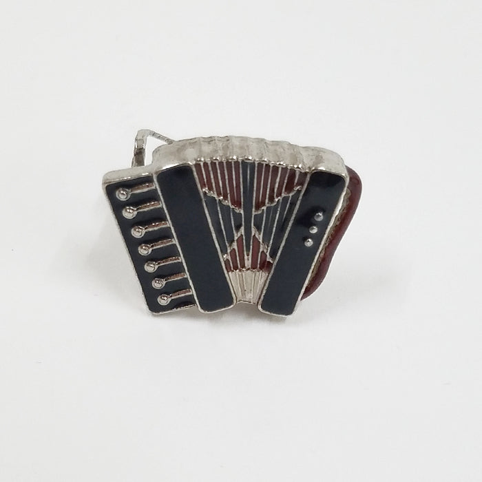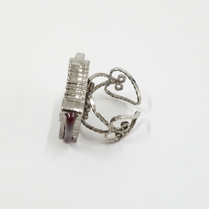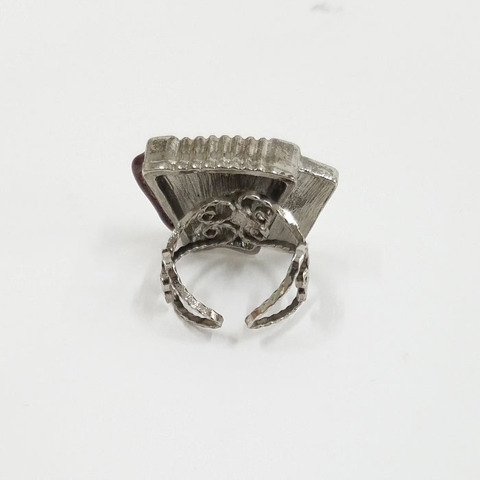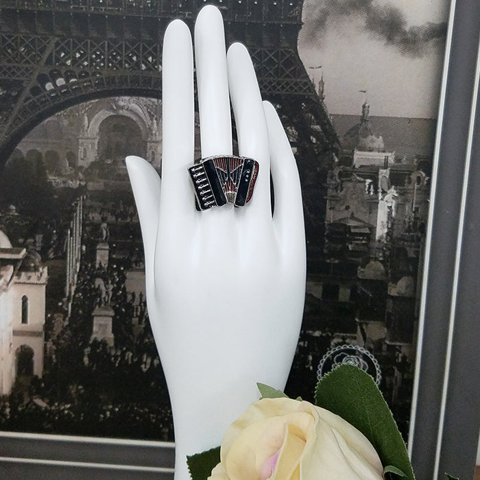 アコーディオンのモチーフのリングです。存在感のある大きめモチーフなので一気に華やかになります。リング部分は調節ができるフリーリングになっています。お揃いのベルトやイヤリング、ネックレスと一緒に着用しても◎