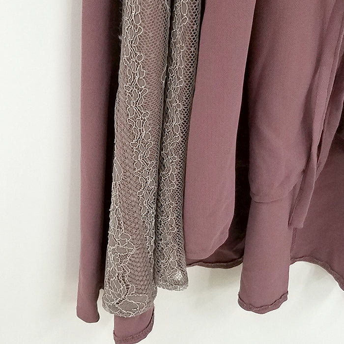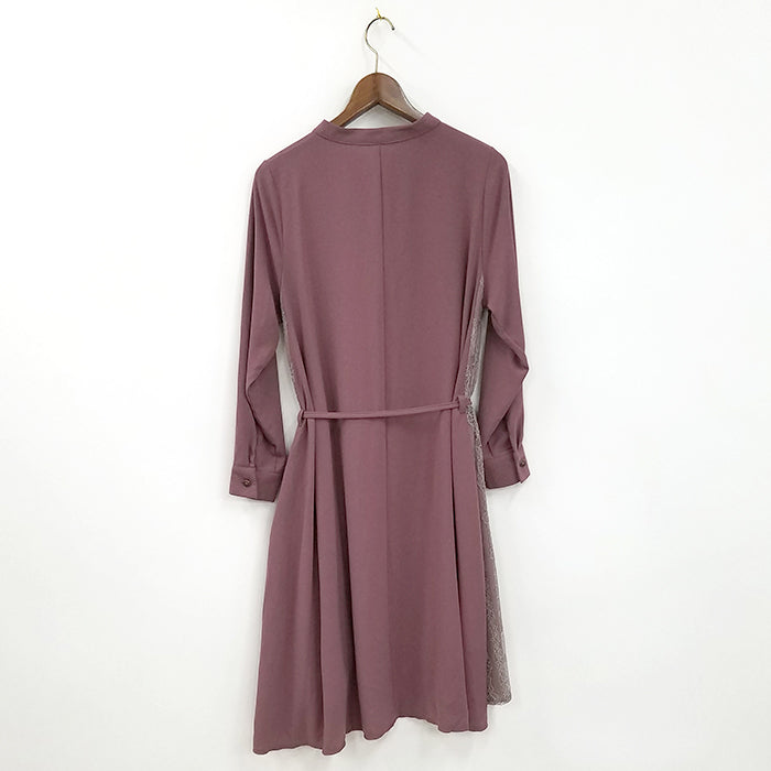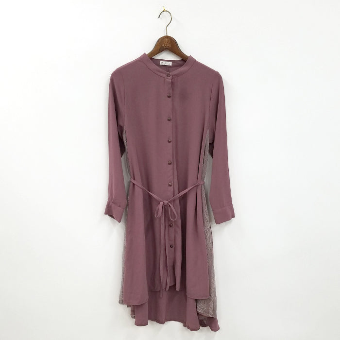 両サイドが華やかなレースで切り替わったシャツワンピースです。トレンドライクなバンドカラーがポイントで、かなり前後差のあるフィッシュテールシルエットで、すっきりカジュアルに着られるアイテム。トレンドスタイルのニットベストなどを重ね着しても◎、ワンピースとして着ても◎、前を開けて羽織として着ても◎な着まわしのきく便利な1枚です。