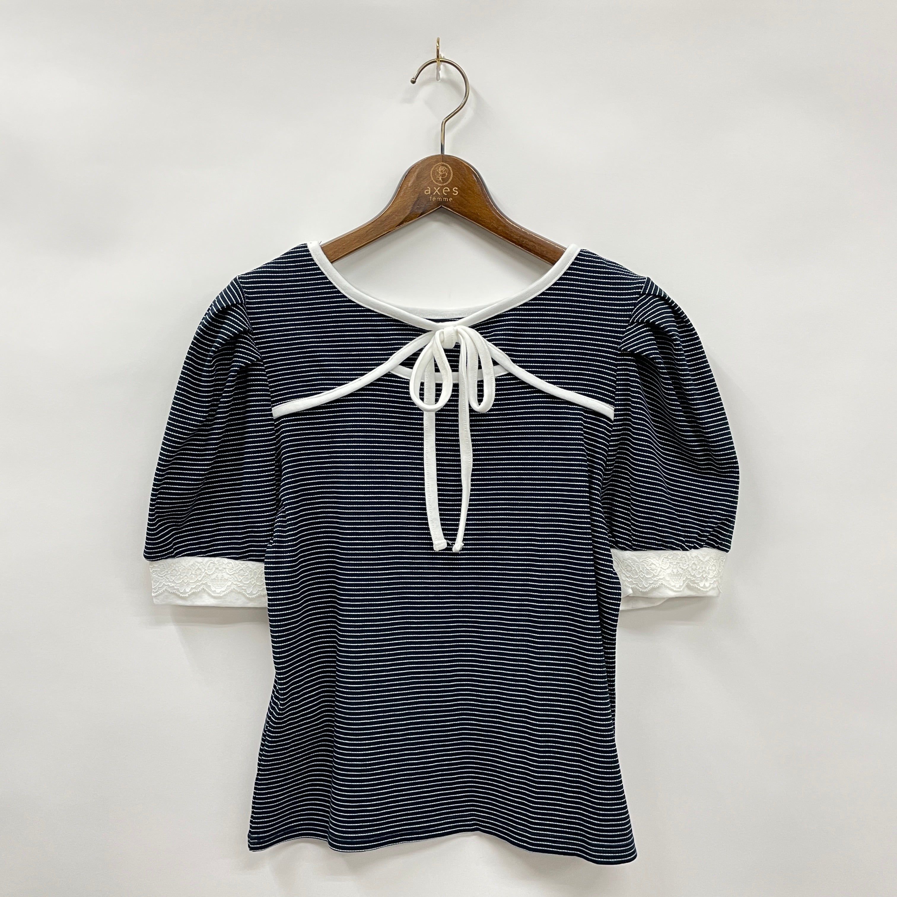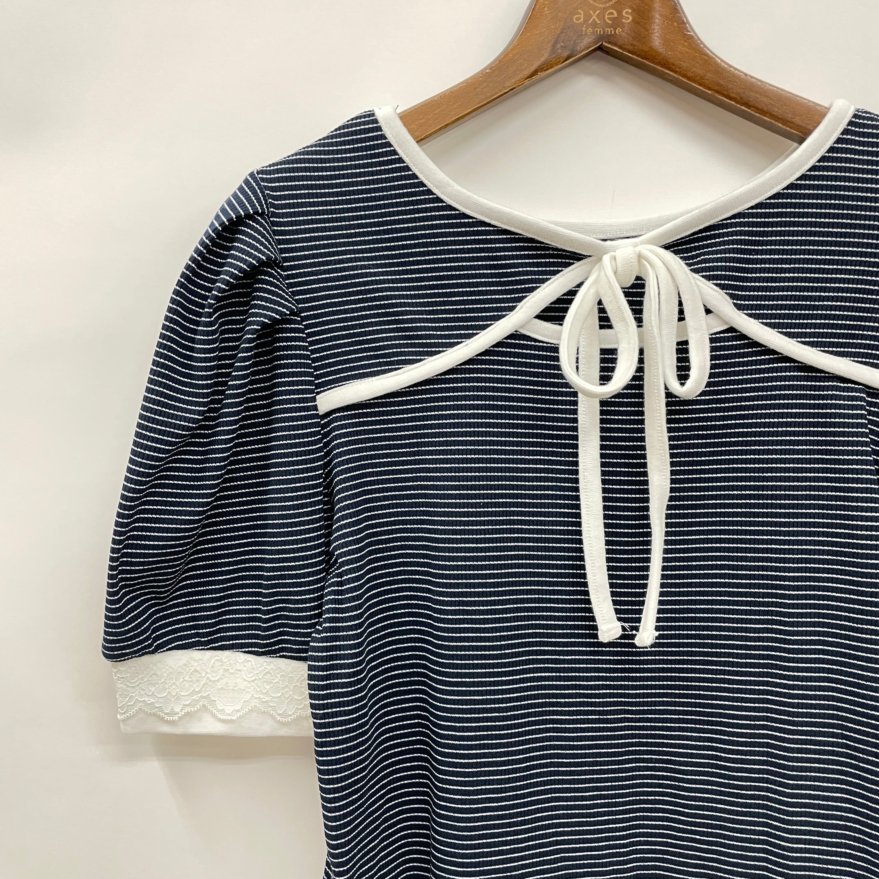 すっきりとしたクルーネックと、フェミニンなリボンデザインが楽しめます。