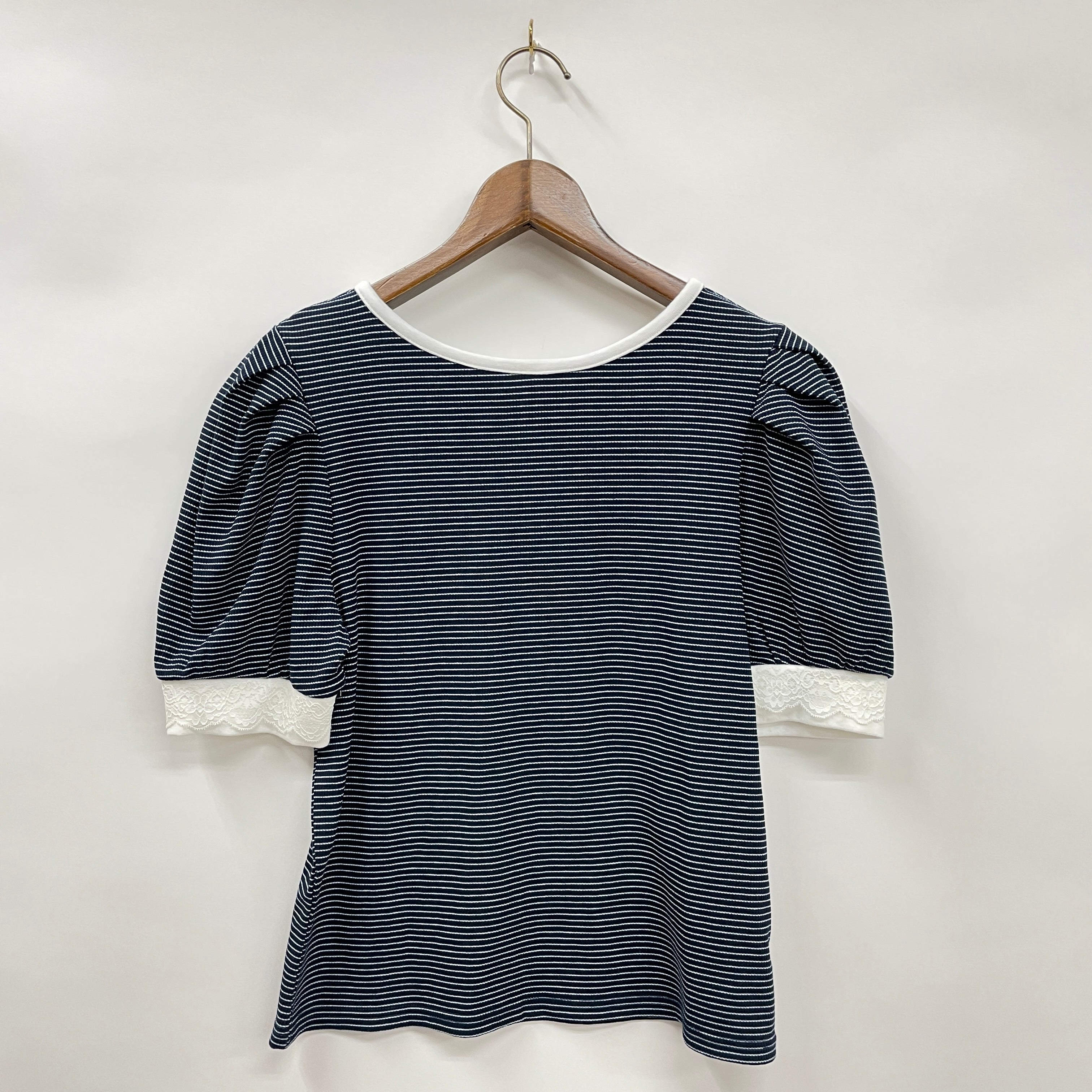 爽やかな細ボーダー柄に映える、配色パイピングと袖口デザインがポイントのカットPOです。