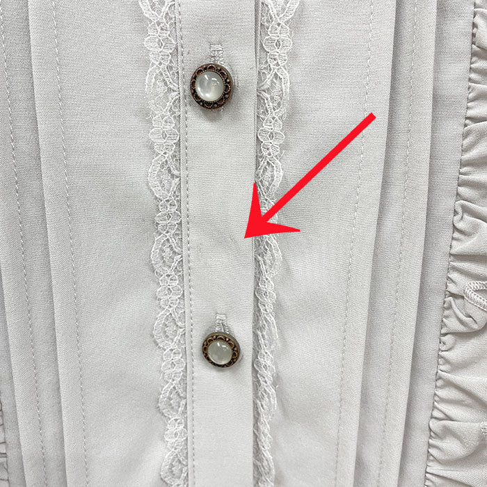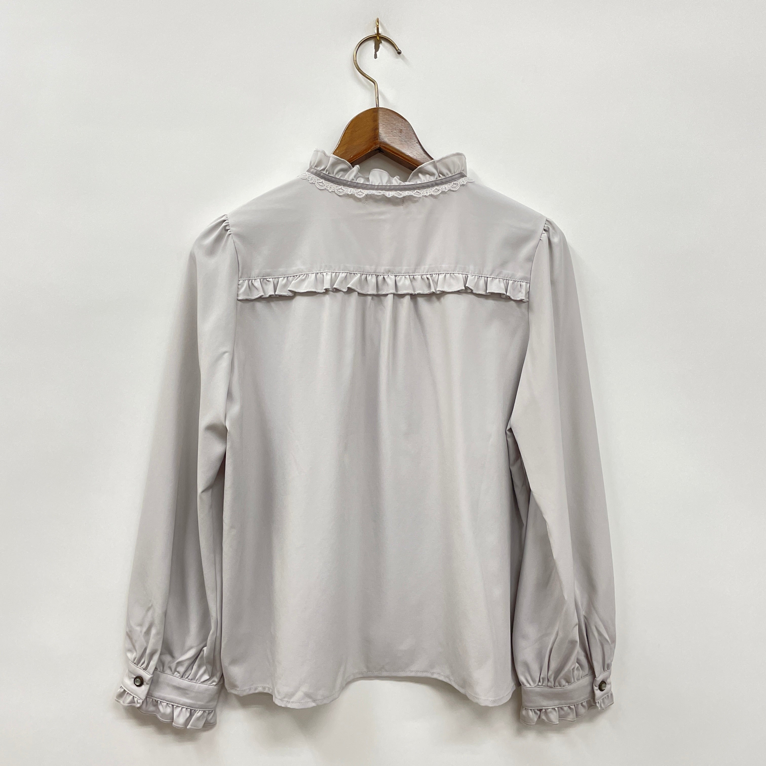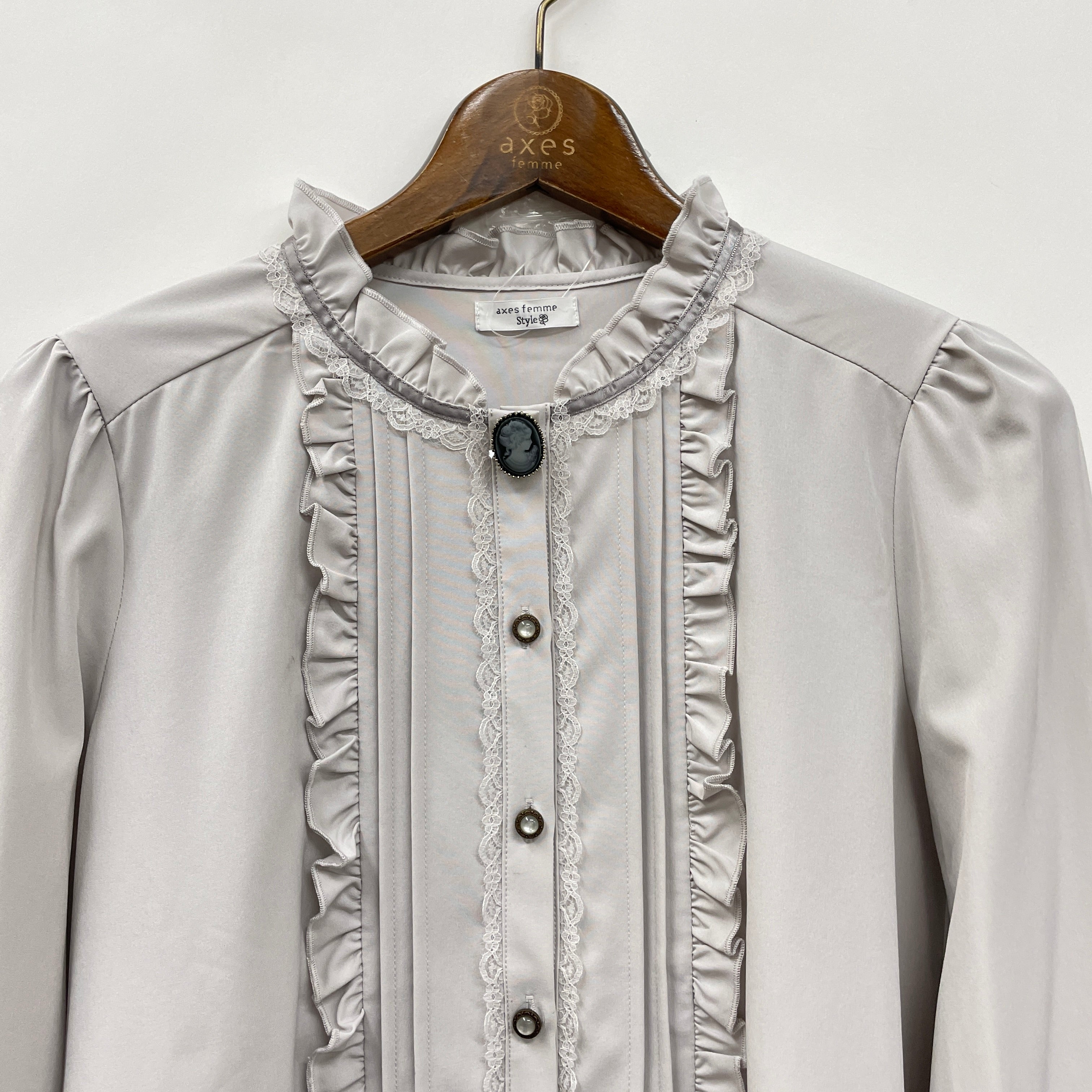 レースとフリルがフロントを華やかに飾る、プチハイネックの長袖ブラウスです。