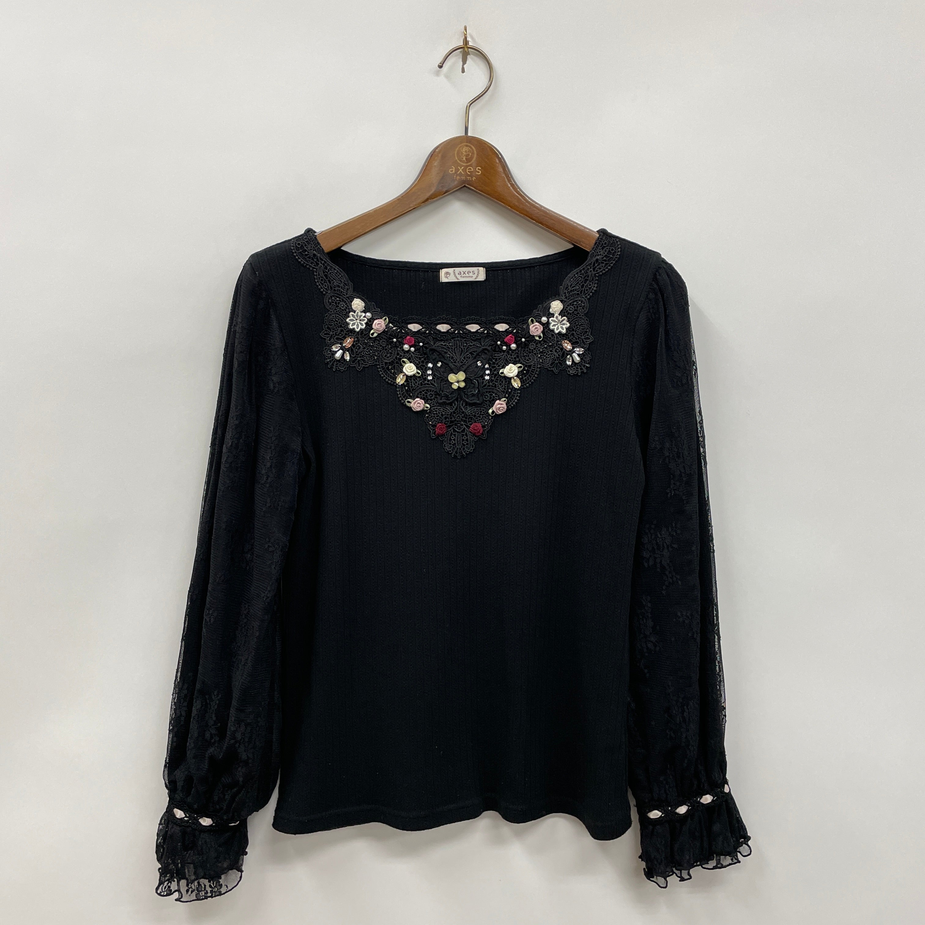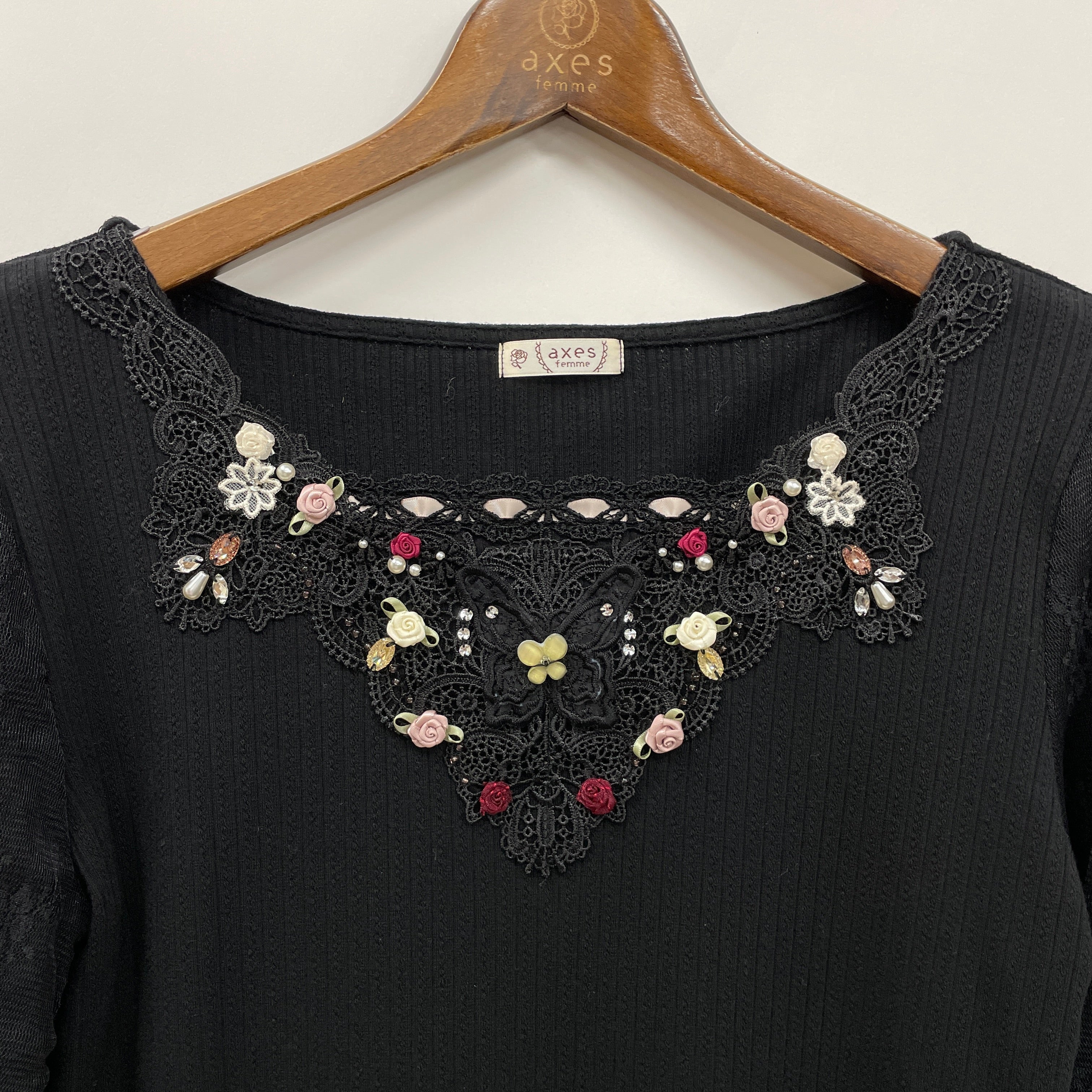 ローズガーデンを蝶が飛んでいるようなイメージからデザインに落としこんだリブプルオーバーです。袖口までレースデザインを重ねフェミニンな印象に。身頃はリブで伸縮性高く、着脱らくちんです。スカートと合わせたインスタイルがおすすめ。