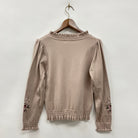 襟ぐりと袖口、裾はシャーリング風のデザインでくりんとしたニットフリルがポイント。